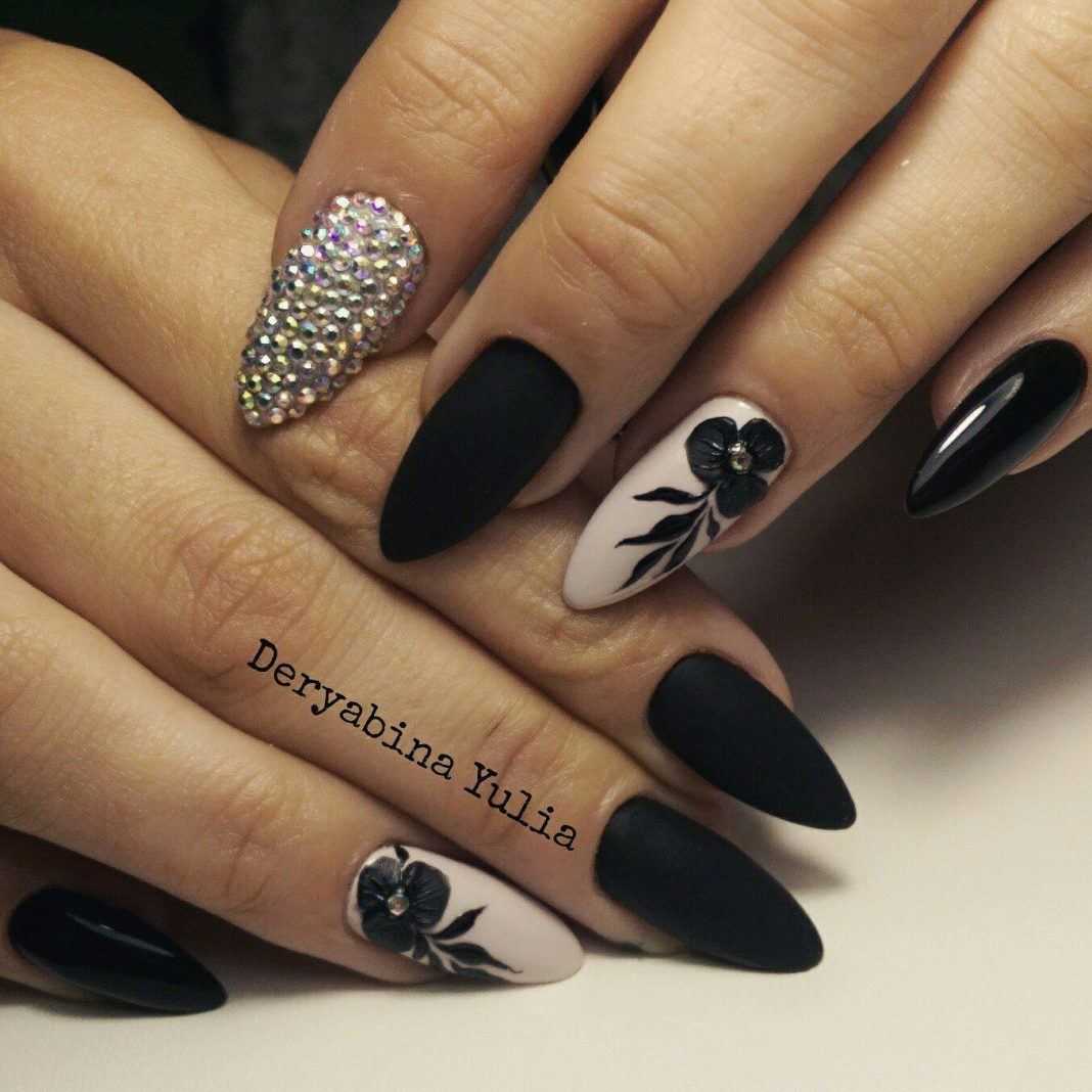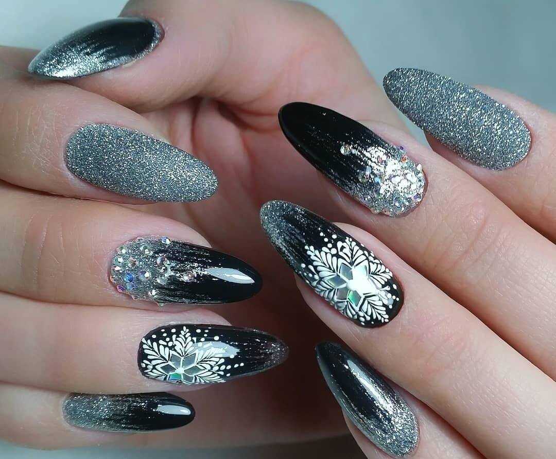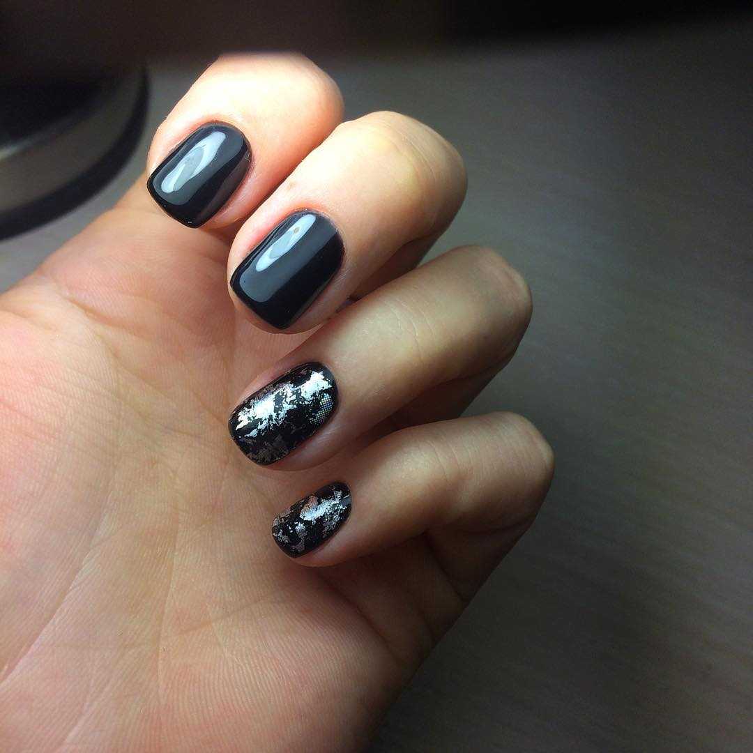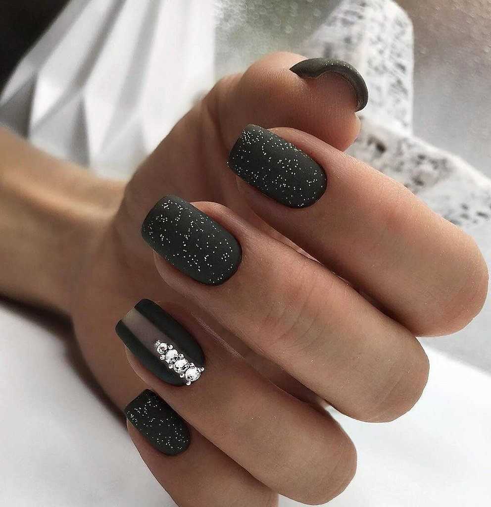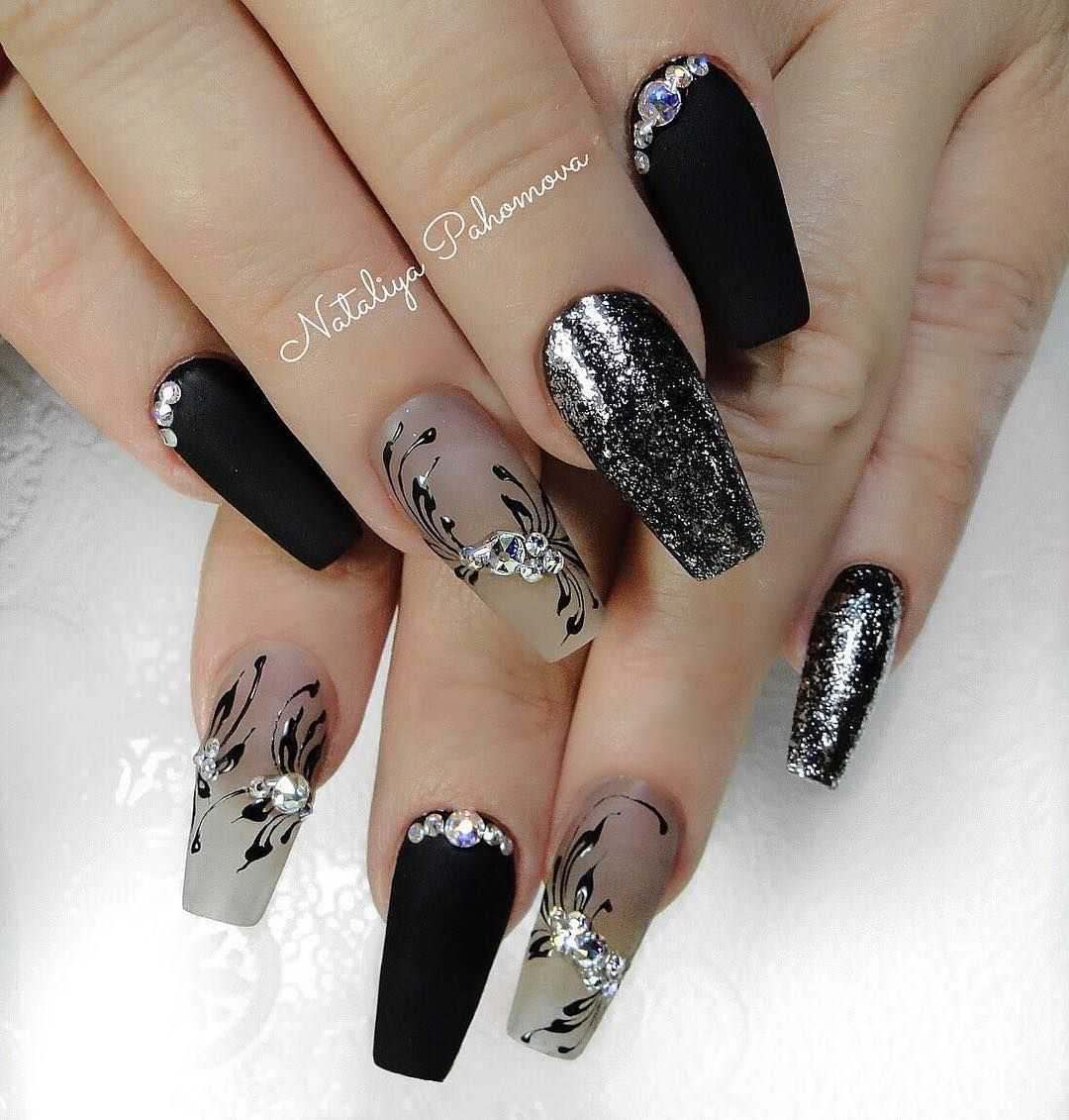 Не смотря на то, что чёрный маникюр с серебром достаточно выразительно смотрится сам по себе, его всегда можно несколько освежить и усовершенствовать при помощи страз. При этом объёмные украшения шикарно смотрятся в любой вариации дизайна. В этом модном сезоне это может быть потрясающая цветочная композиция с несколькими камнями на безымянном ноготке в компании с френчем и хаотичные серебристые полоски на чёрном фоне с россыпью камней. Однотонный дизайн в чёрном цвете с серебряным фоном, стразами и рисунком, выполненным тёмным гелем-паутинкой на паре ноготков. А также необычные композиции из украшений в области лунулы, матовый нейл-арт в чёрном цвете с объёмными украшениями и лаконичный минимализм с парой серебристых полосок и одиночными кристаллами на каждой ногтевой пластине. И, не забывайте, известное выражение – блеска много не бывает, не совсем актуально в этом случае.