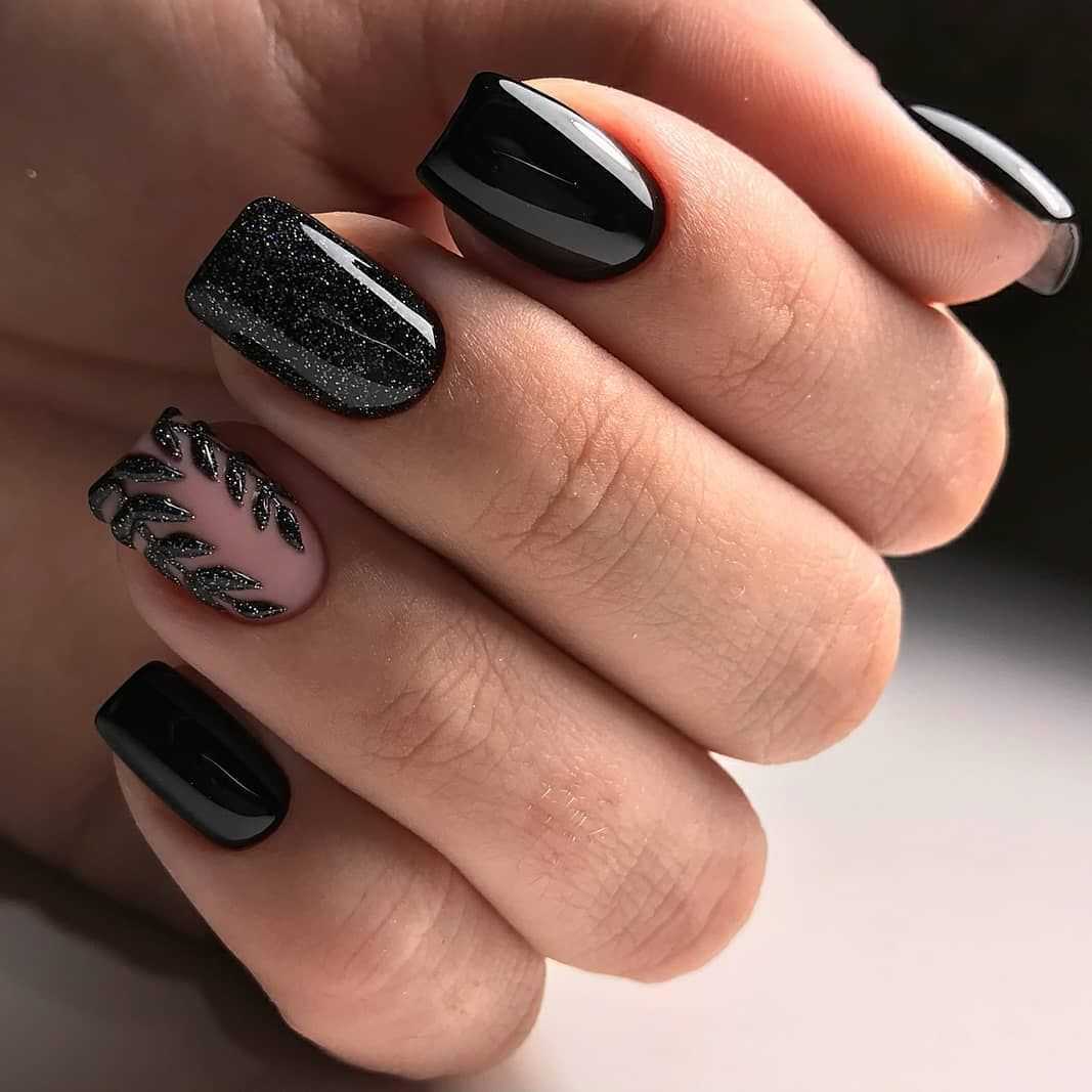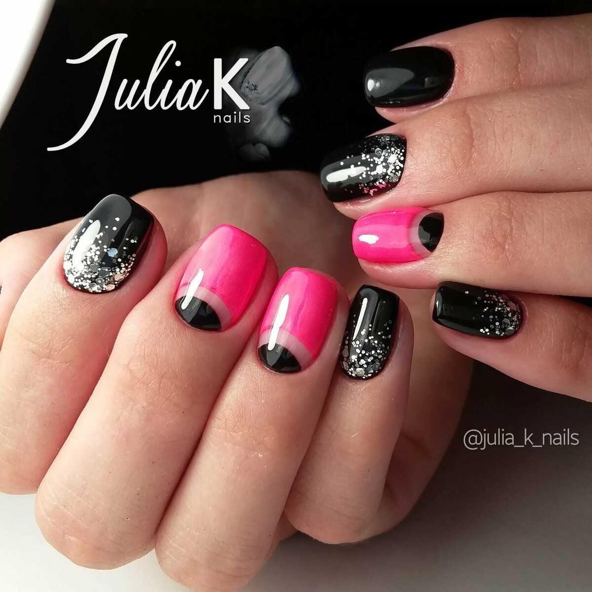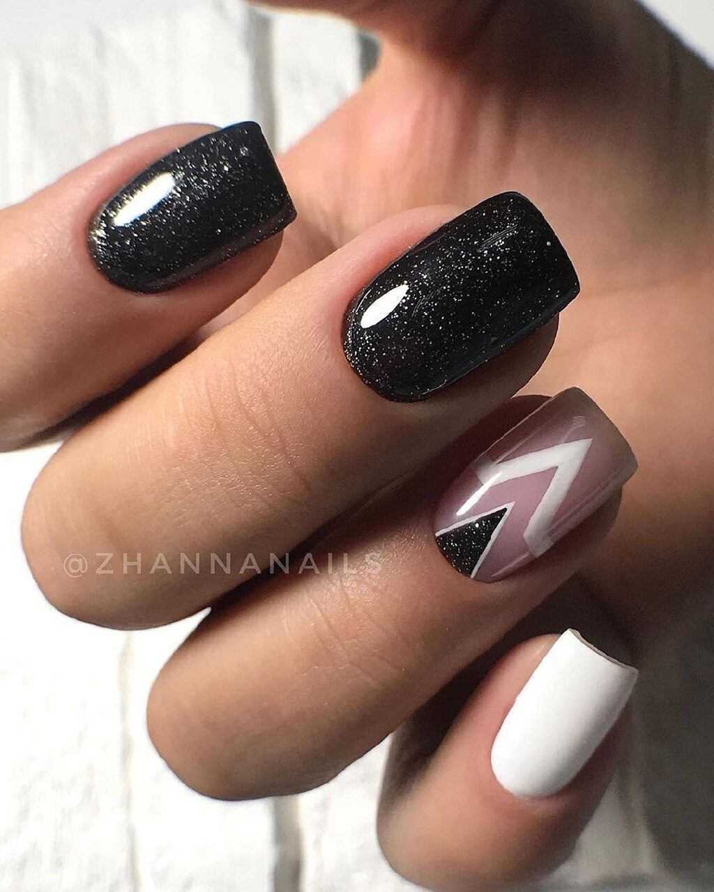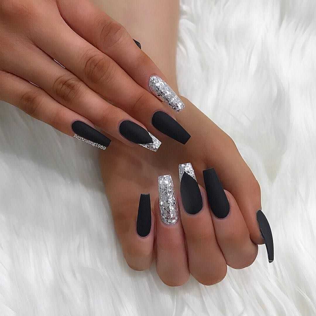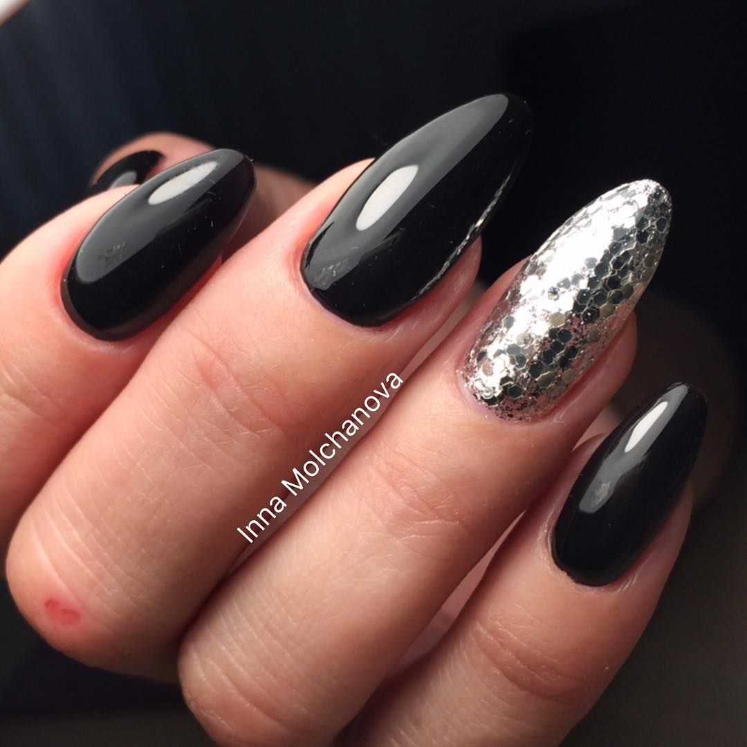 Не смотря на то, что чёрный маникюр с серебром достаточно выразительно смотрится сам по себе, его всегда можно несколько освежить и усовершенствовать при помощи страз. При этом объёмные украшения шикарно смотрятся в любой вариации дизайна. В этом модном сезоне это может быть потрясающая цветочная композиция с несколькими камнями на безымянном ноготке в компании с френчем и хаотичные серебристые полоски на чёрном фоне с россыпью камней. Однотонный дизайн в чёрном цвете с серебряным фоном, стразами и рисунком, выполненным тёмным гелем-паутинкой на паре ноготков. А также необычные композиции из украшений в области лунулы, матовый нейл-арт в чёрном цвете с объёмными украшениями и лаконичный минимализм с парой серебристых полосок и одиночными кристаллами на каждой ногтевой пластине. И, не забывайте, известное выражение – блеска много не бывает, не совсем актуально в этом случае.
