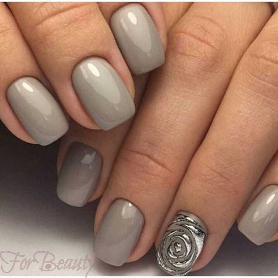 Не менее привлекательно смотрится на ногтях серая палитра с золотом и серебром. Обыграть это предложение можно при помощи различных элементов декора, например, металлизированных полос, блёсток глиттера, бусин, кристаллов или фольги. Кстати, все блестящие или сверкающие детали могут дублировать по цвету любой используемый, кроме серого, оттенок.