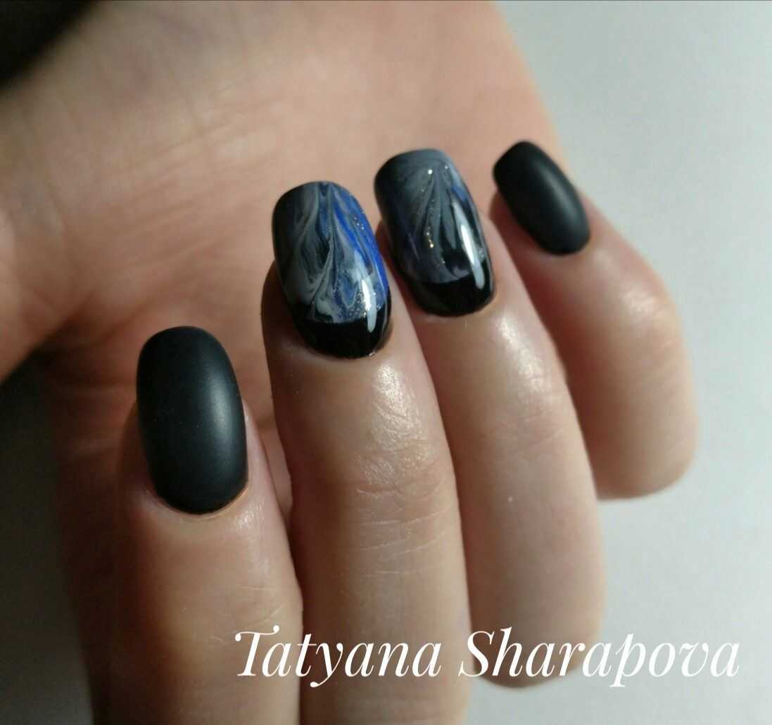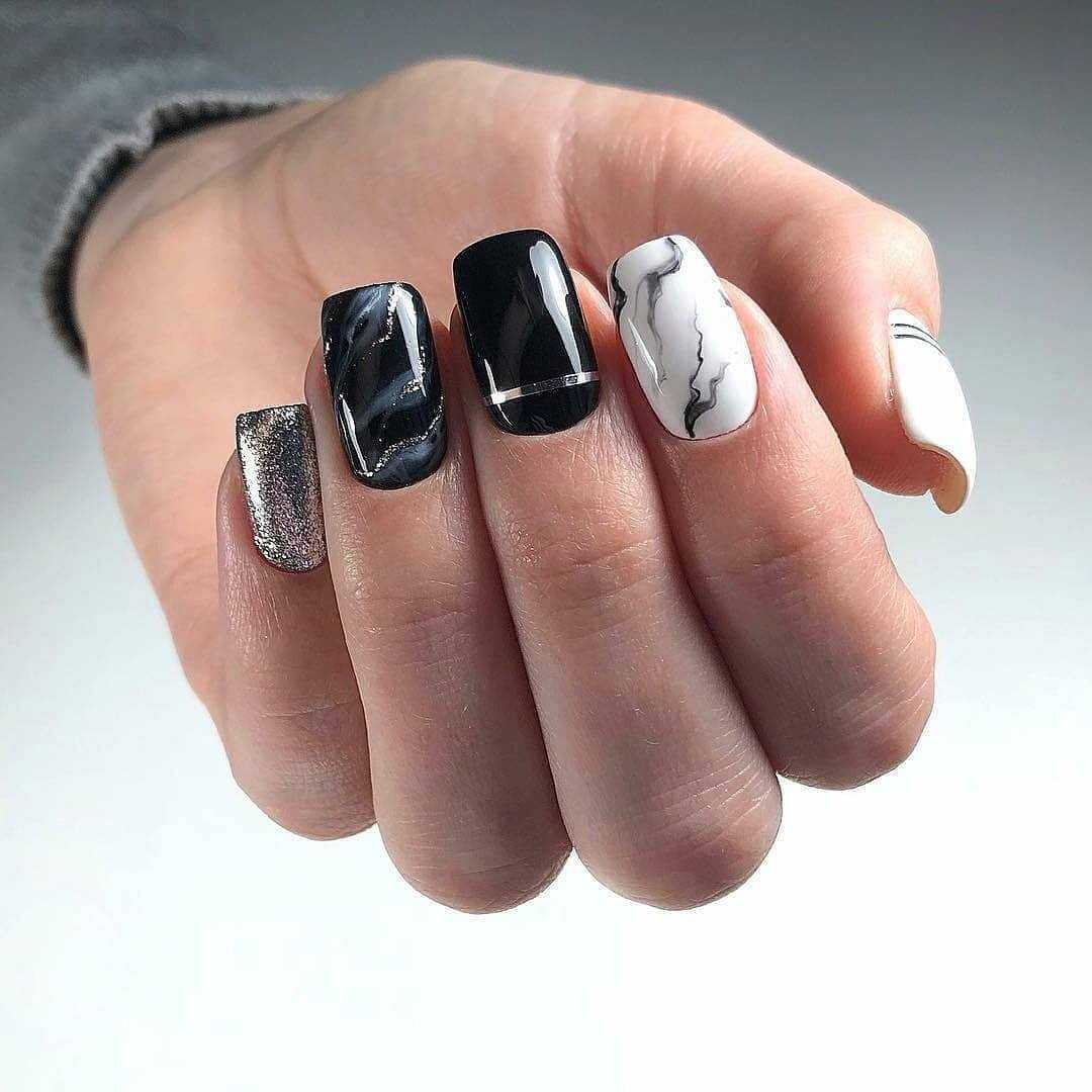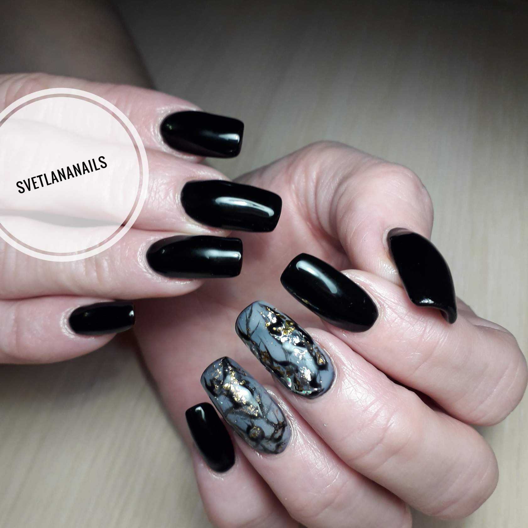 Серо-белый френч, минимализм или мраморный дизайн являются прямым тому подтверждением. Что касается компании серого и чёрного лаков, то в этом случае общая картина оформления отличается большей выразительностью и чёткостью. Чёрный позволяет серому выглядеть ярче, а серый, в свою очередь немного смягчает насыщенность чёрного. Контрастные рисунки с элементами стального блеска, ажурная вуаль на кончиках ногтевых пластин или геометрический принт будет украшать ваши пальчики – результат получается сногсшибательным.