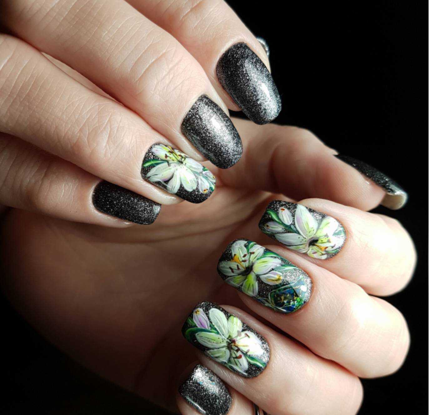- Девушкам, отдающим предпочтение самостоятельному выполнению маникюра, отлично подойдут слайдеры с цветочным или другим любым видом сложного декора. Уже готовый выбранный вариант способен решить проблему за совсем короткий срок, обмакнув в теплую водичку слайдер и аккуратно разместить рисунок на, подготовленной для этого, черной основе.