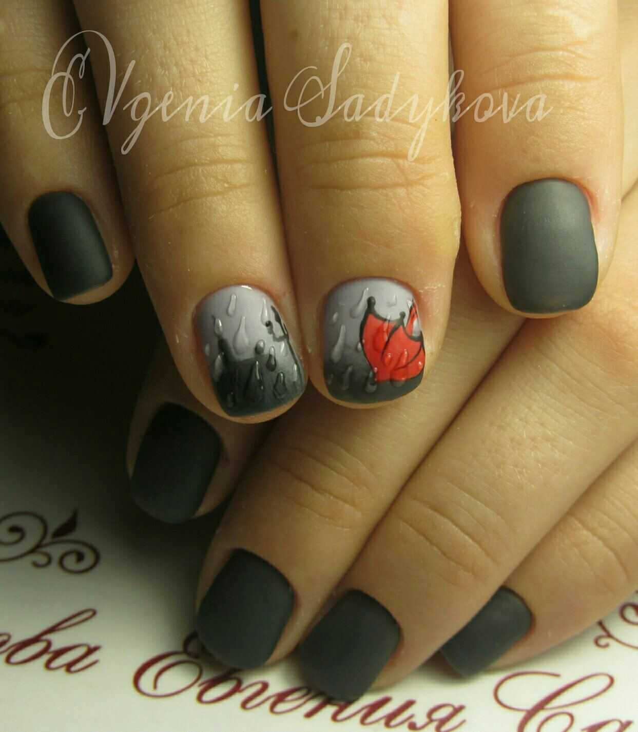 Матовый дизайн в сером цвете самодостаточен, поэтому даже однотонное покрытие будет выглядеть совершенно. Но это не мешает вам проявить фантазию и изобразить на ногте тонкие линии или аккуратные точки дотсом.