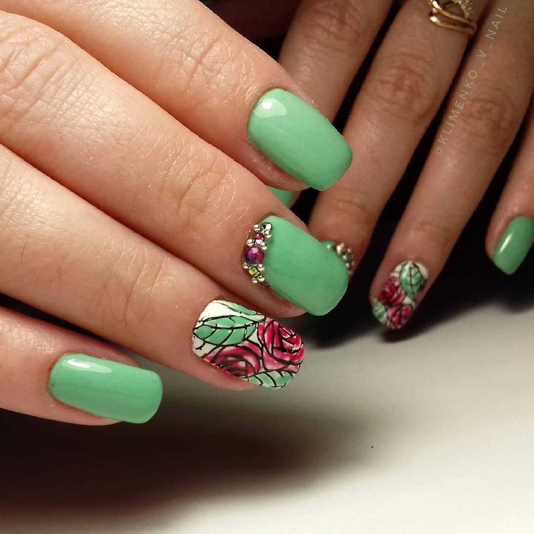 Нейл-арты в светлом зеленом цвете выглядят по-летнему свежо и легко. Допустимы как однотонные нейл-арты, так и сложные с флористикой, геометрией, стемпингом, слайдерами. Для летнего сезона характерны нейл-арты с цветами, веточками и листьями. Зеленый цвет станет отличным фоном для любого из этих узоров.