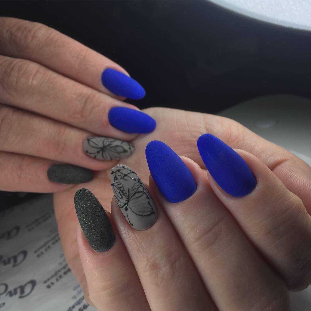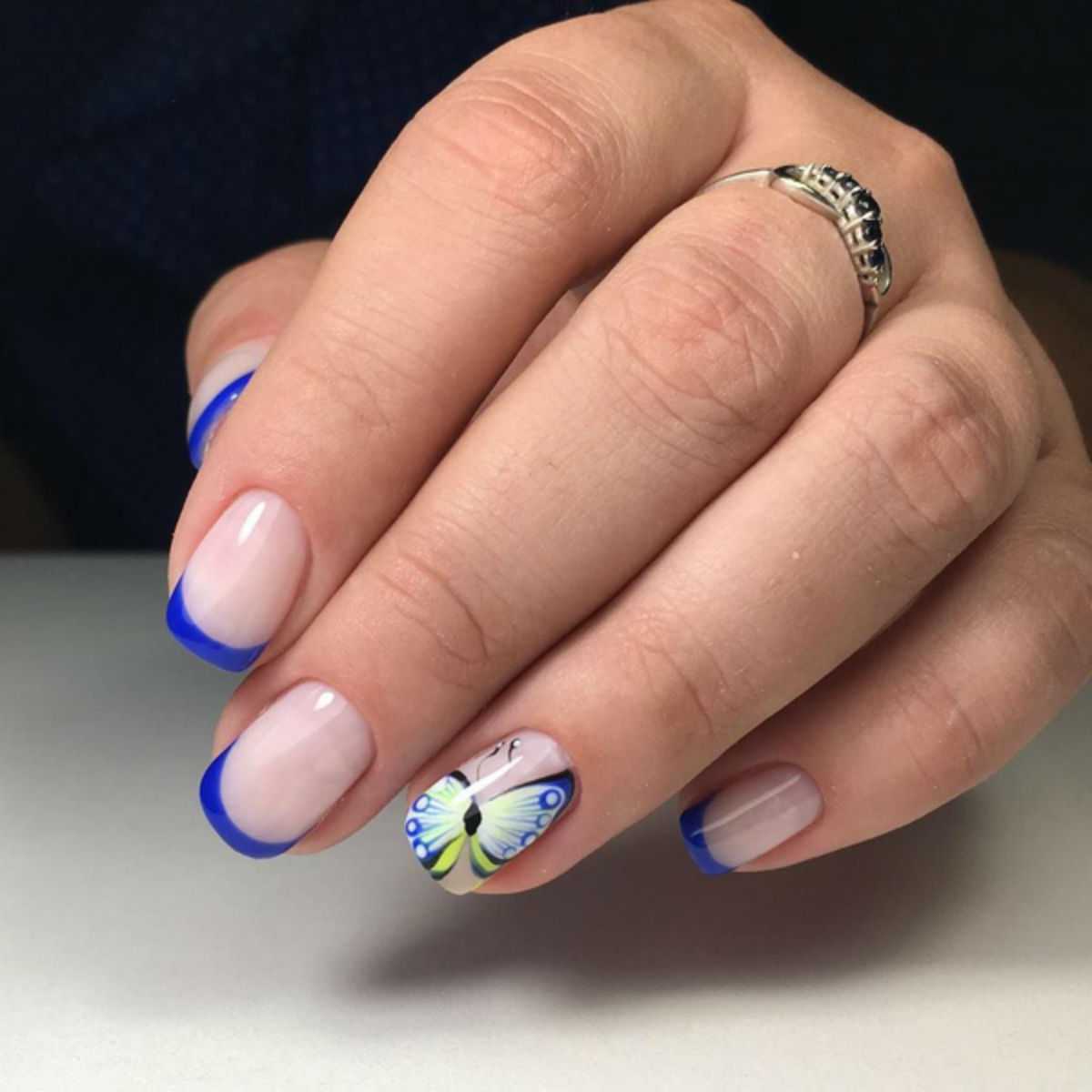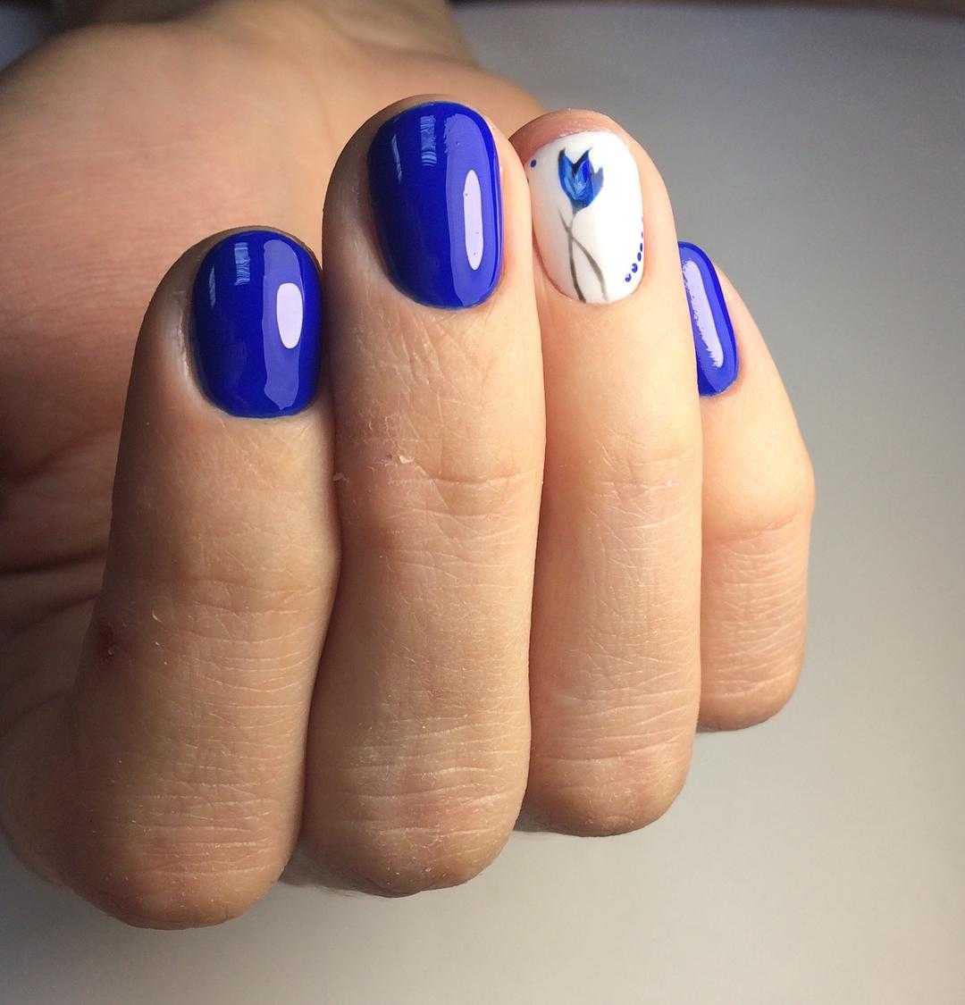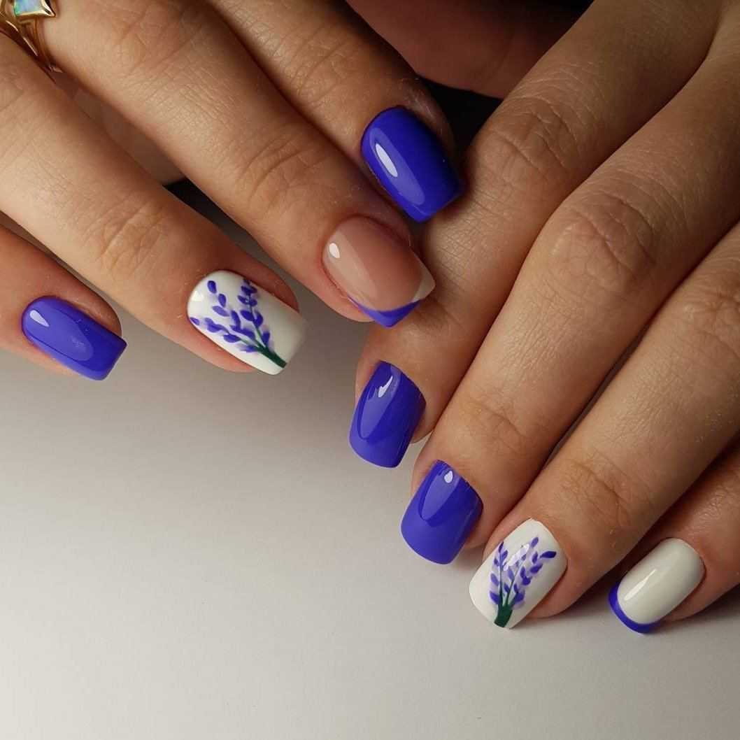 Несмотря на актуальность однотонного покрытия, на коротких ноготках нередко делают знаменитый французский маникюр. В синем цвете он смотрится потрясающе красиво. К тому же, в современном мире его нередко комбинируют и с другими всевозможными вариантами оформления. Это могут быть тонкие геометрические линии, которые добавляют маникюру строгости. Также популярностью пользуется синий френч с легкими цветочными и флористическими мотивами. В таком случае маникюр получается более нежный, изысканный. При желании его можно комбинировать и с лунным оформлением, что в общем уже является классикой.