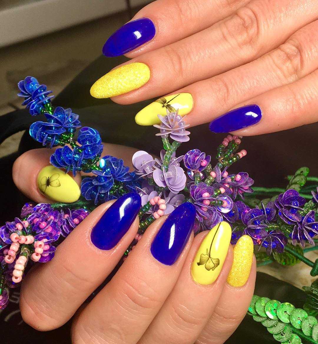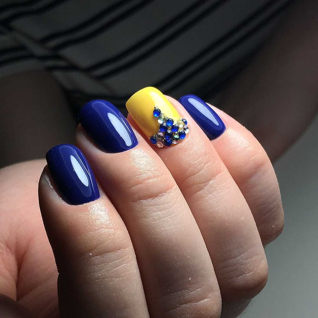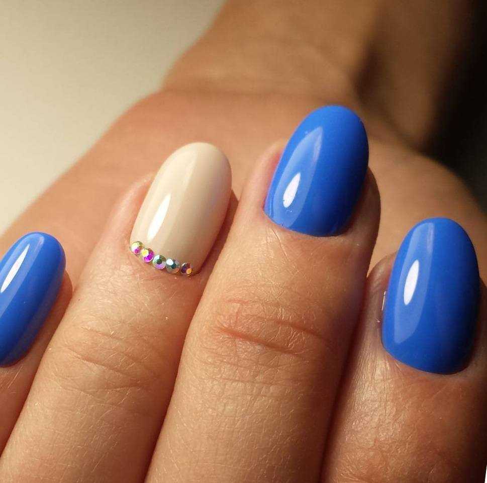 В весенне-летнем сезоне стоит присмотреться к более нежным, мягким оттенкам синего цвета. Что касается варианта сочетания, то его выбор зависит от привычных образов. Если вам свойственна лаконичность и сдержанность, то выбирайте бежевый цвет. Он отлично смотрится в качестве основы для синего рисунка. Если же вам по душе более яркие комплекты одежды, то используйте насыщенные тона. К примеру, желто-синий маникюр никогда не останется без внимания. Более того, он может быть главным акцентом образа.