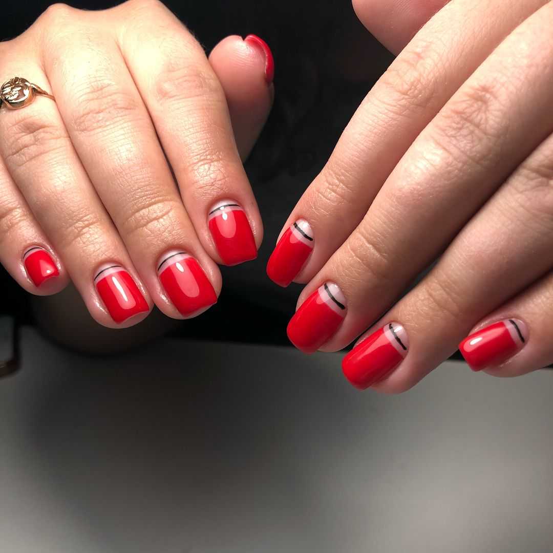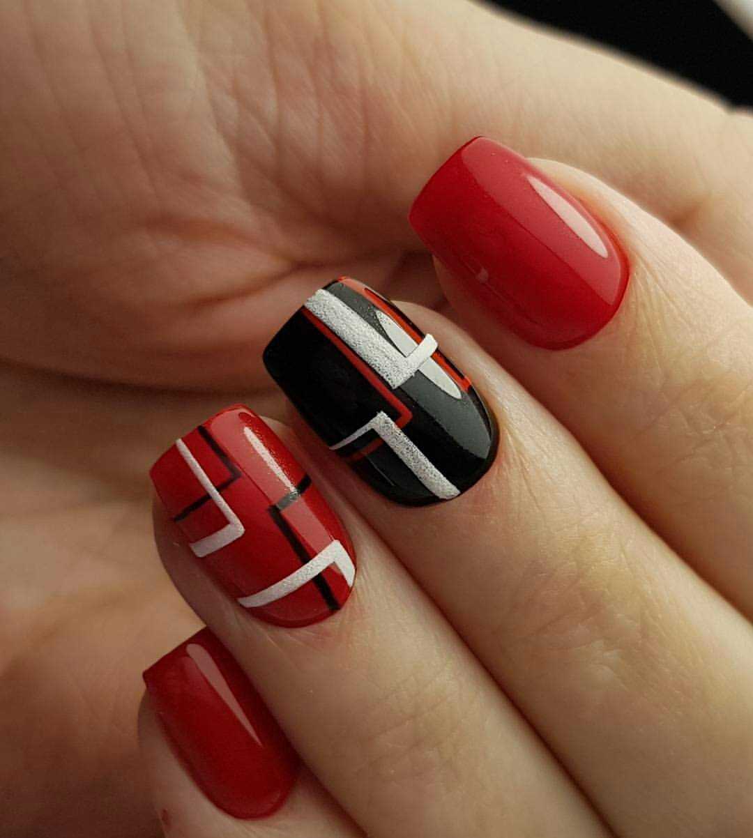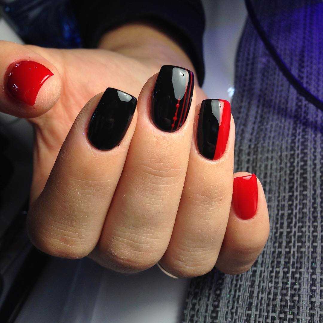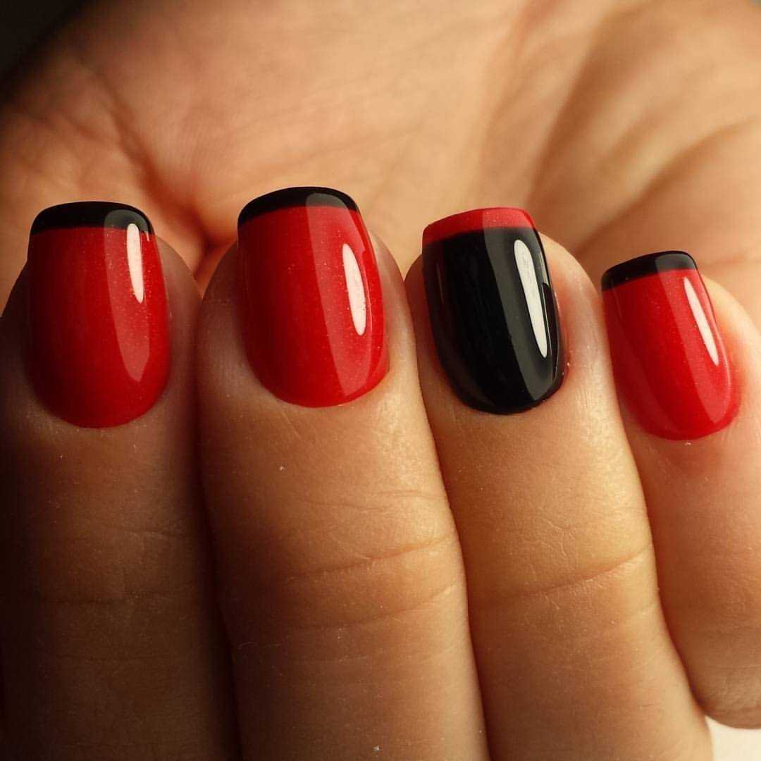 Короткие ногти с красно-черным покрытием всегда смотрятся элегантно, необычно. Такой маникюр предпочитают уверенные в себе девушки, которые точно знают чего хотят от жизни. В основном его выбирают для вечерних мероприятий и других важных событий. Но во многом внешний вид маникюра зависит от количества каждого цвета. Если основным будет красное покрытие, то оформление получится достаточно ярким. Его можно украсить черным геометрическим дизайном или абстракцией. В случае, если основным будет покрытие в черном цвете, можно сделать эффект градиента с плавным красным переходом. Дополнительный декор будет уместным, но только в небольшом количестве