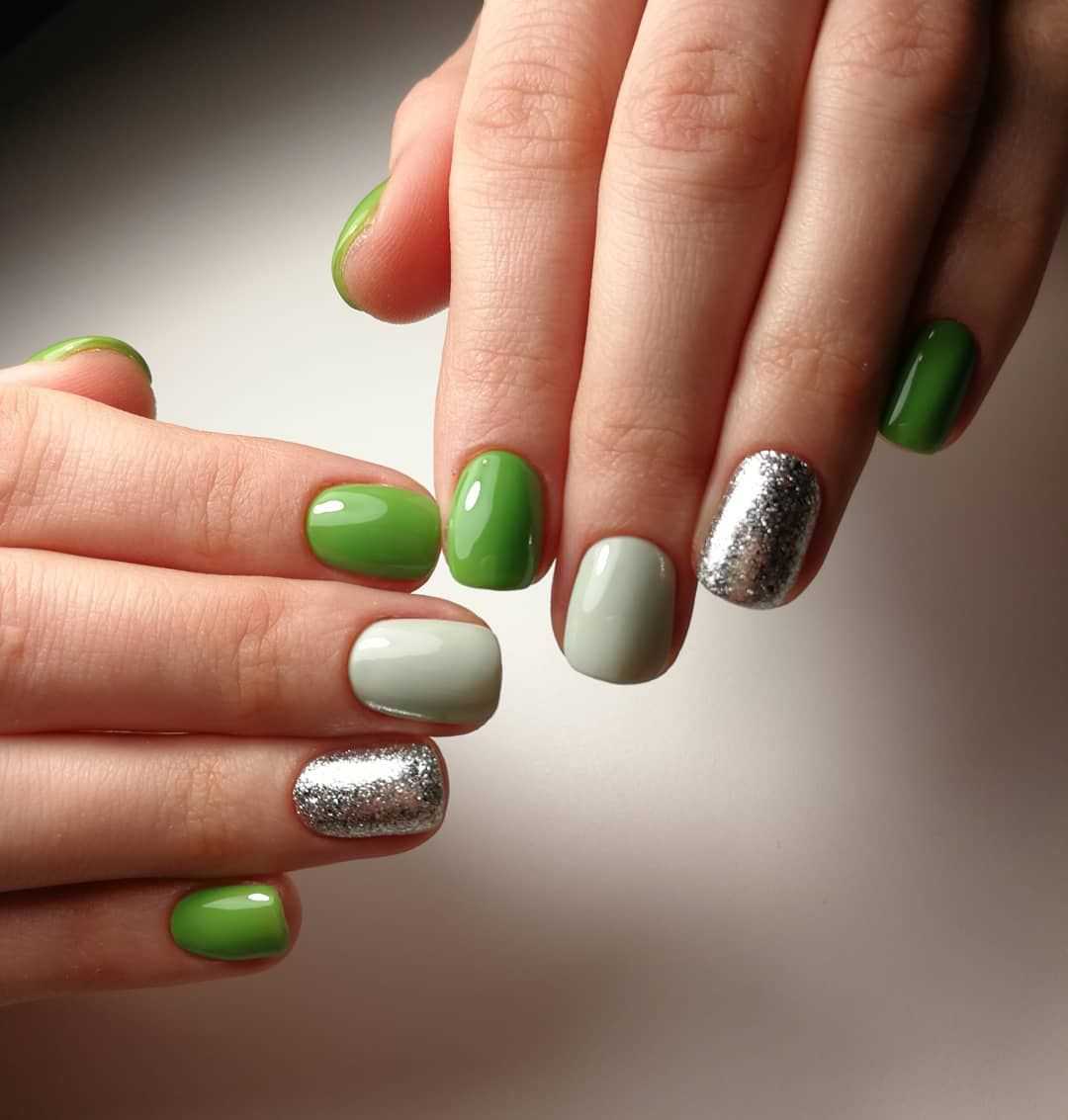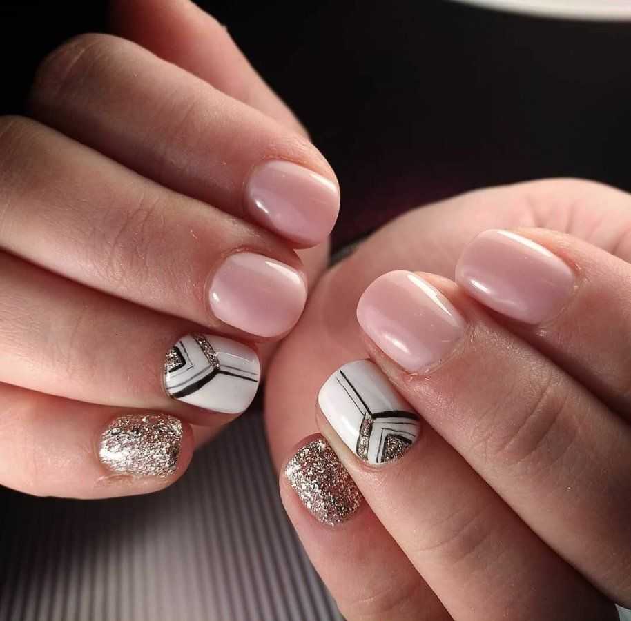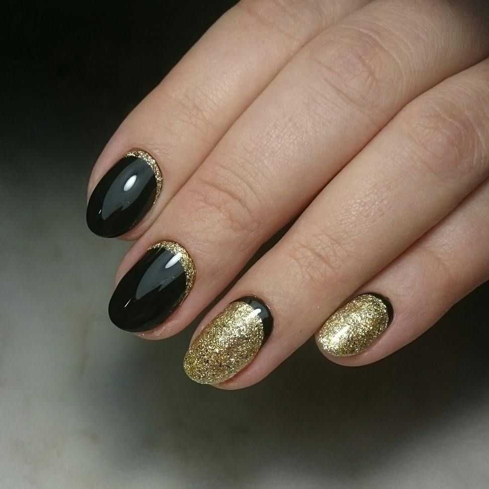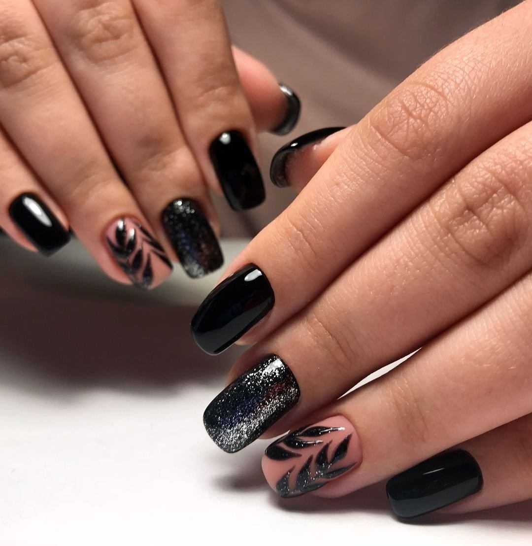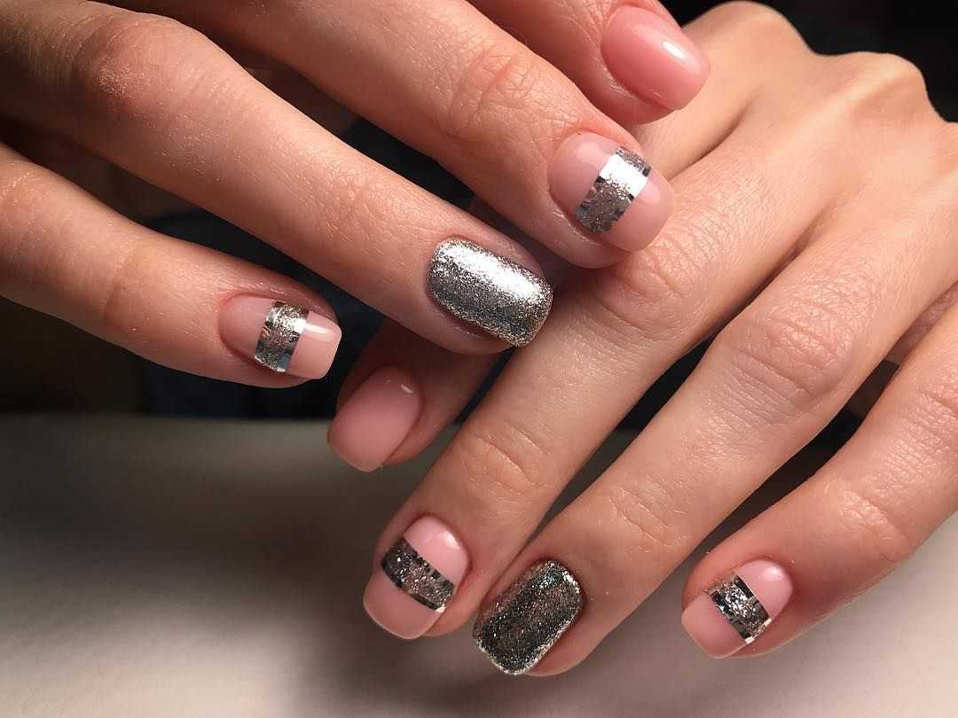 Яркий глиттер и блестки продолжают удивлять модниц утонченными и восхитительными идеями выполнения маникюра на коротких ногтях. На строгом черном фоне блестящие переливы будут выглядеть выгоднее всего. Самым актуальным является серебристый глиттер. Он прекрасно сочетается как с торжественными, так и с повседневными образами. Наиболее актуальный декор — это однотонное покрытие глиттером нескольких ноготков. Такой акцент удачно гармонирует с черной основой маникюра. Ещё одним вариантом станет выделение края ноготков серебристым декором. При помощи блесток очень часто выделяют узоры или рисунки.