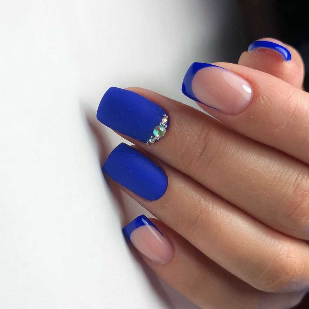 Шикарный французский маникюр в 2020 году изящно смотрится на ноготках короткой длины. При этом основу можно оставить прозрачной или же выполнить любым оттенком из постельной гаммы. Для улыбочки можете смело выбирать любой из оттенков синего цвета. Касаемо самой улыбочки, то ее можно делать треугольной, двойной, классической или косой. Также для выполнения улыбки можно использовать глиттер синего цвета в сочетании с серебром или золотом. Основной тренд синего френча – бархатное и матовое покрытие в комбинации с глянцем и ярким декором. Такой маникюр будет актуален для различных мероприятий и самых разных образов.