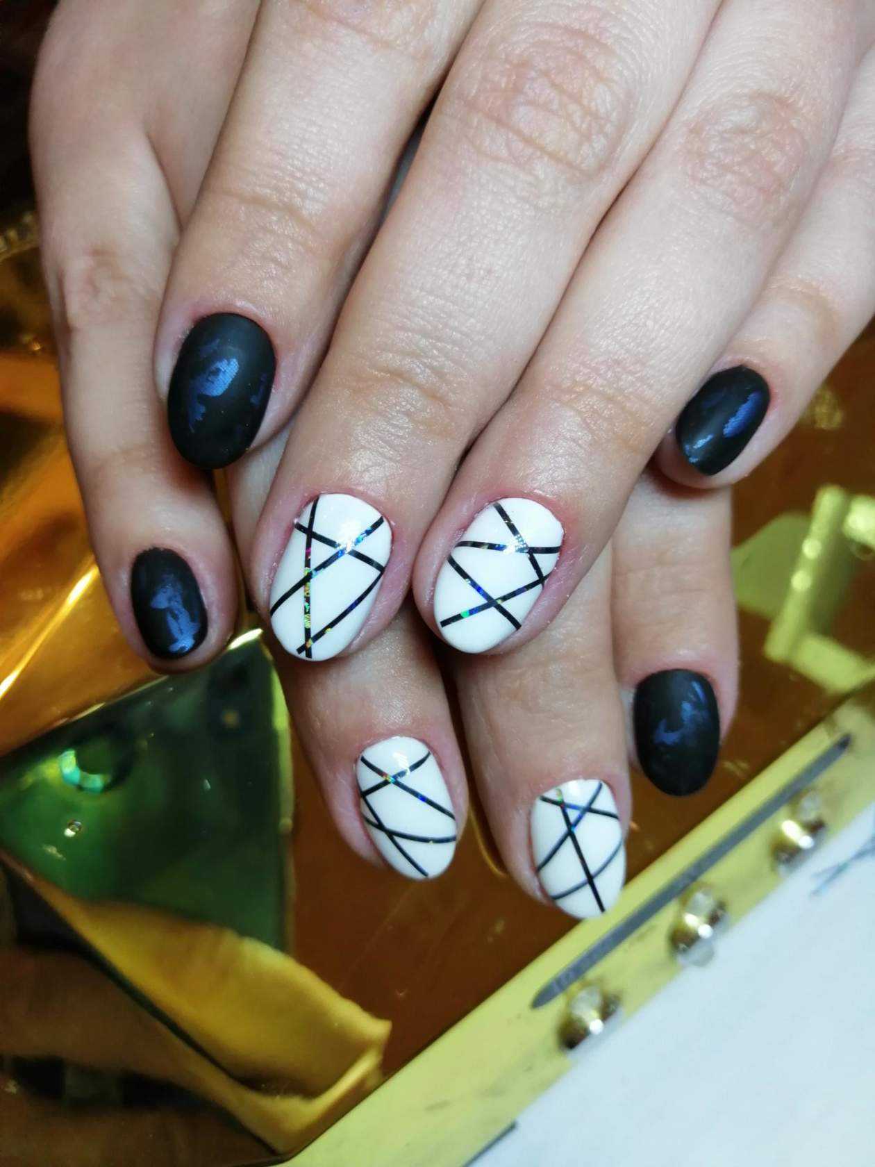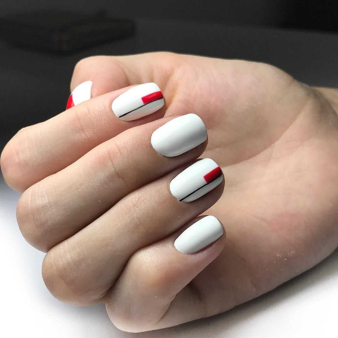Геометрия — тренд сезона. Для дизайна полосок выбирают контрастный цвет — серебро, золото, красный, черный или белый. Даже одна полоска (поперек или вдоль) способна существенно изменить общий вид ногтей, сделав их более стильными.