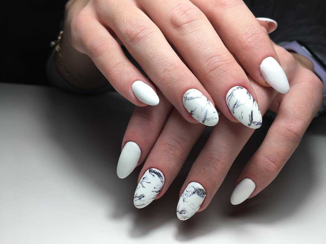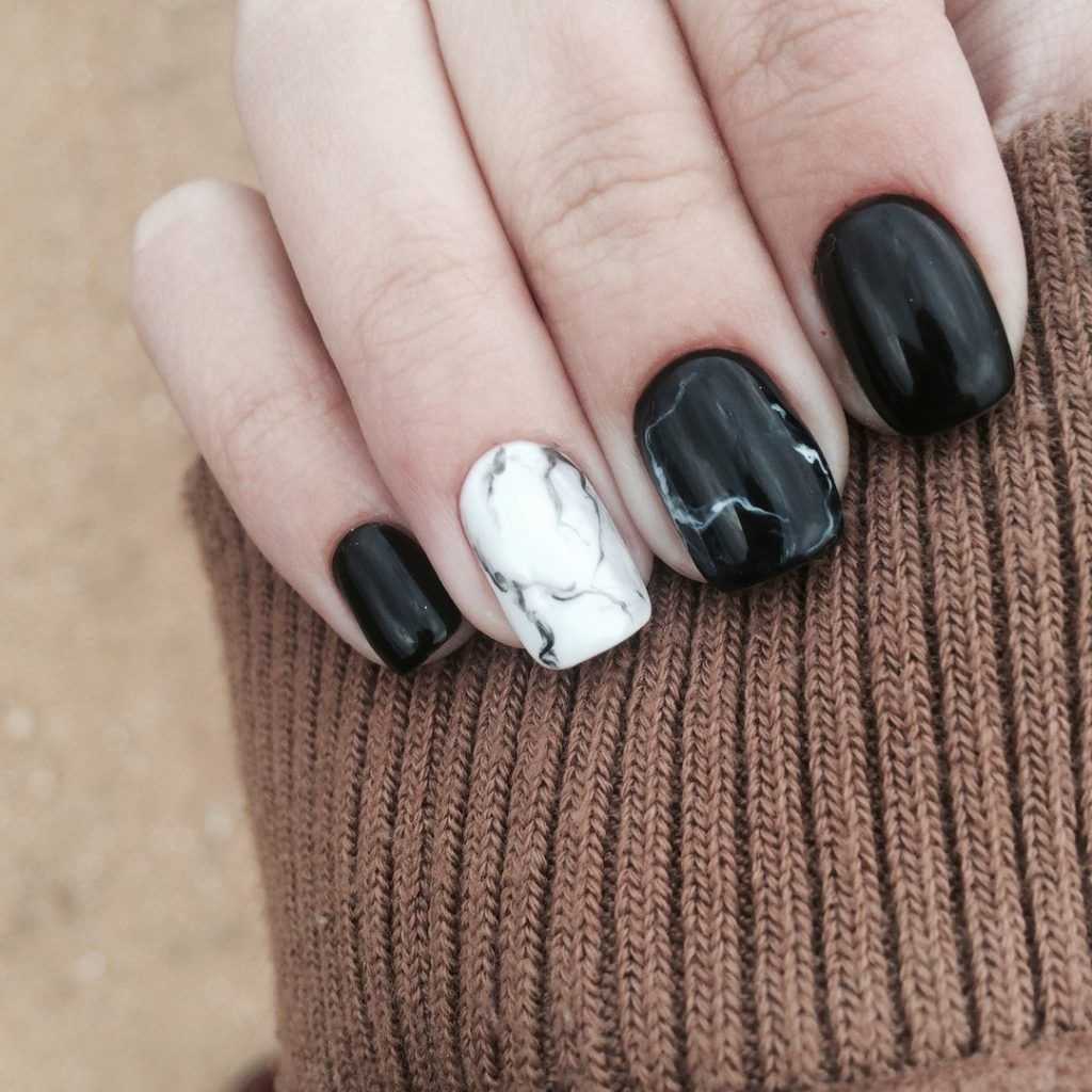 Одно из классических сочетаний, которое до сих пор используется в оформлении ногтей – черно-белое покрытие. За счет контраста маникюр всегда получается достаточно ярким, заметным. Причем делать его можно на абсолютно любой длине и форме ноготков. Главное – подобрать подходящий вариант дизайна, который лучше всего дополнит выбранный образ. В основном эти оттенки используют для создания лаконичного мраморного дизайна. Примечательно, что для основного покрытия подходит как черный, так и белый цвет. С помощью второго оттенка и тонкой кисти нейл-мастер наносит тонкие линии, которые напоминают естественные полосы на мраморе. Маникюр украшают не часто, в основном небольшим количеством блесток на двух ноготках.