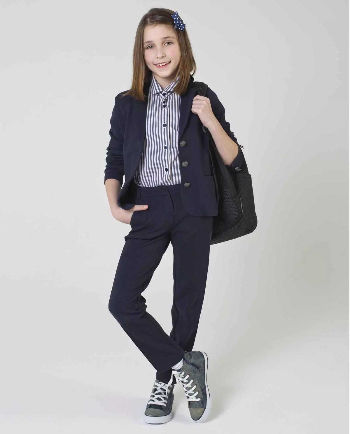 С брюками подойдут туфли в тон на маленьком каблуке или балетки. Зимой можно надеть ботинки или сапоги. Брючный костюм – практичный вариант для начальной и старшей школы. Строгие элегантные модели хорошо дополняются рубашками в клетку или с цветочным принтом.
