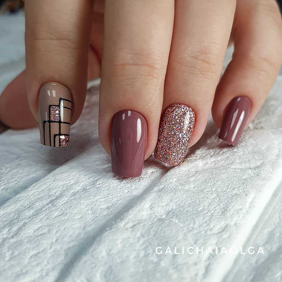 Золотой цвет можно использовать при сочетании с серым, коричневым, бордовым, черным, белым цветами. Он служит как интересное дополнение, акцент всего маникюра, а не как его основной оттенок.