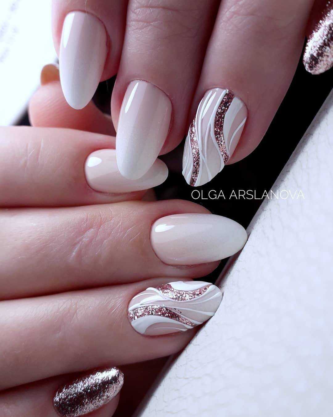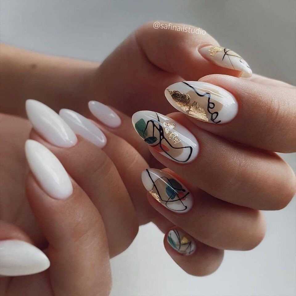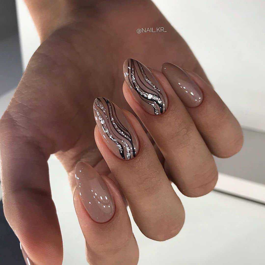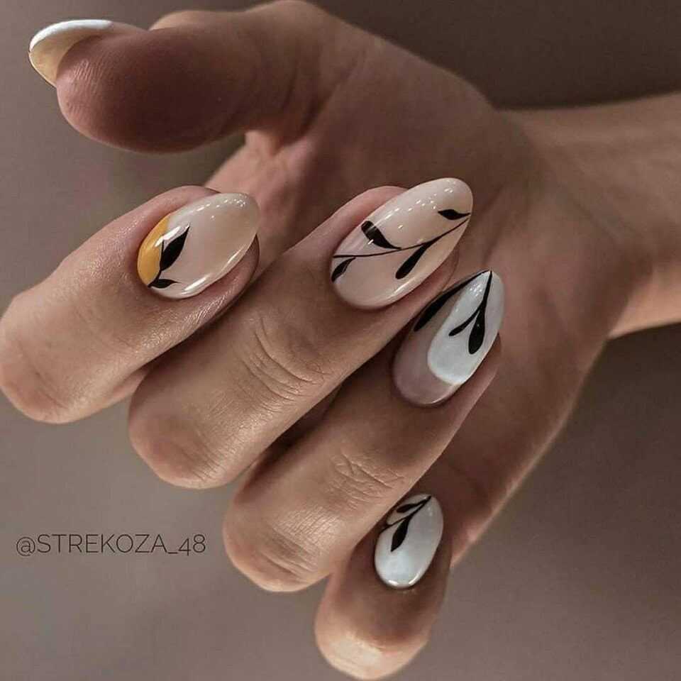Так как бежевый цвет прекрасно сочетается с различными цветами, то можно выполнять рисунки любого понравившегося тона. Не менее оригинальным решением стали и элегантные кружевные мотивы белого или черного цвета. Для скромного и умеренного маникюра можно использовать рисунки в стиле минимализм, которые не перегрузят дизайн и немного разнообразят его. Без сомнения, можно наносить на ноготки различные анималистические принты, геометрические фигуры или нежные узоры.