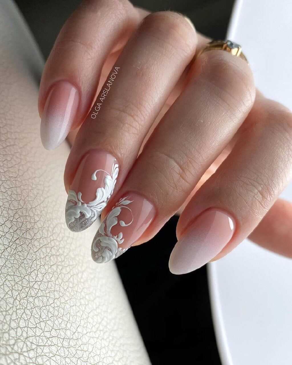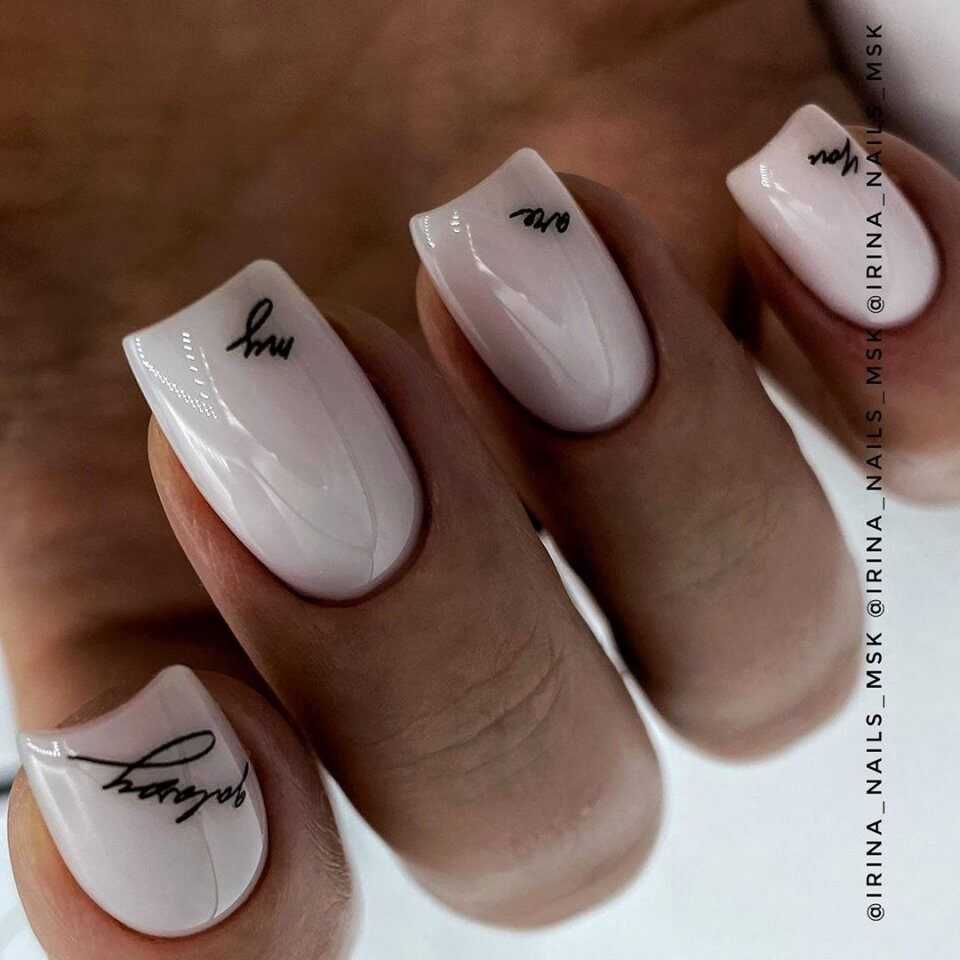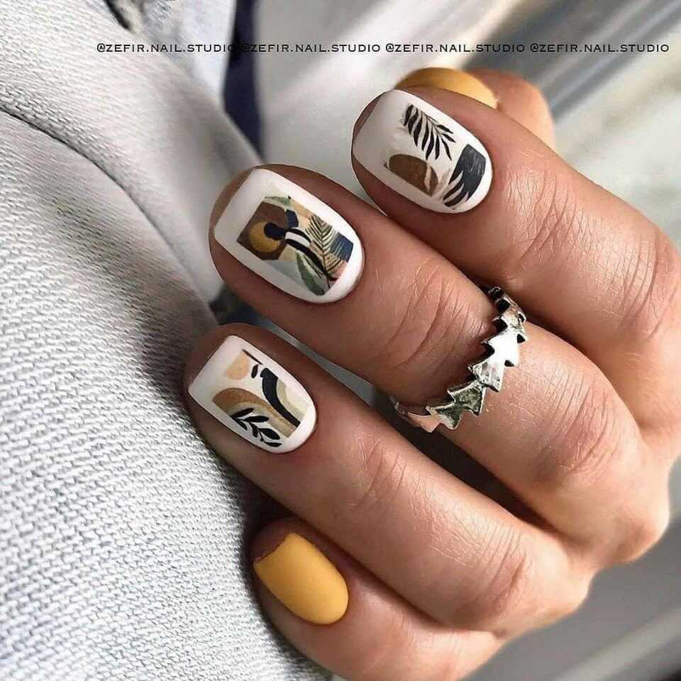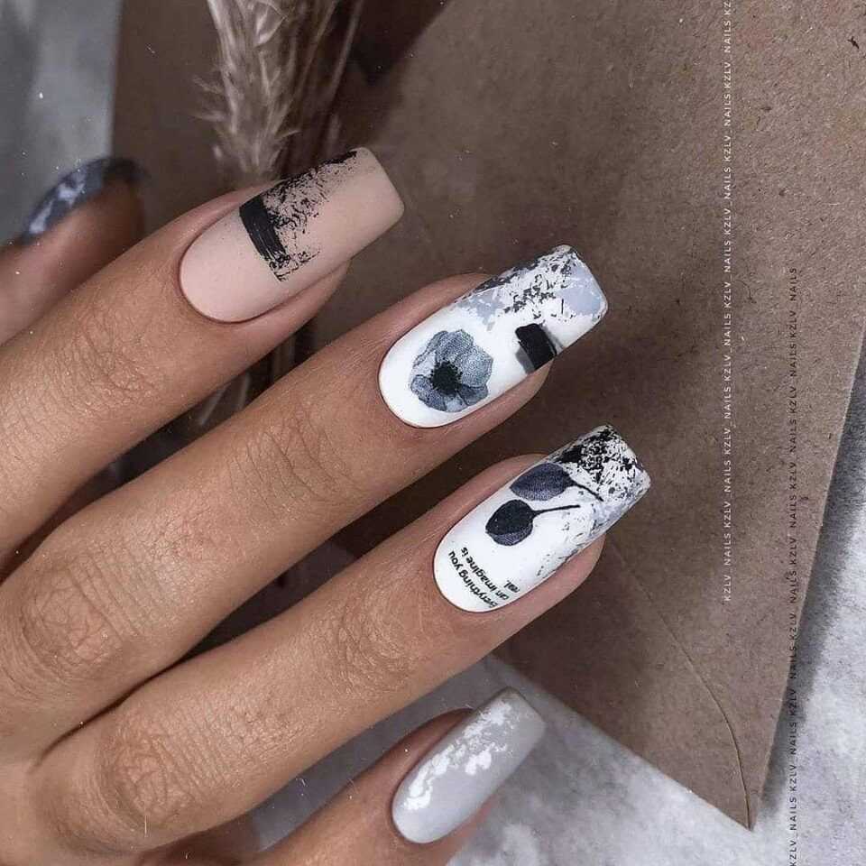 Так как бежевый цвет прекрасно сочетается с различными цветами, то можно выполнять рисунки любого понравившегося тона. Не менее оригинальным решением стали и элегантные кружевные мотивы белого или черного цвета. Для скромного и умеренного маникюра можно использовать рисунки в стиле минимализм, которые не перегрузят дизайн и немного разнообразят его. Без сомнения, можно наносить на ноготки различные анималистические принты, геометрические фигуры или нежные узоры.