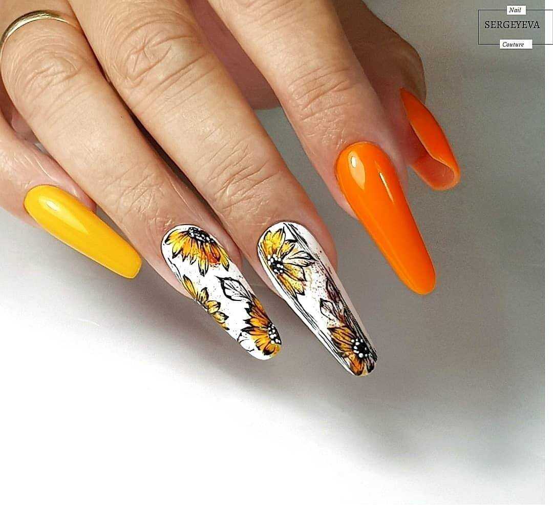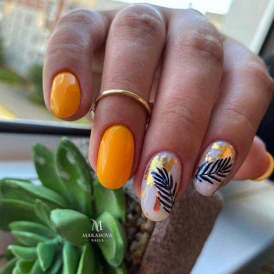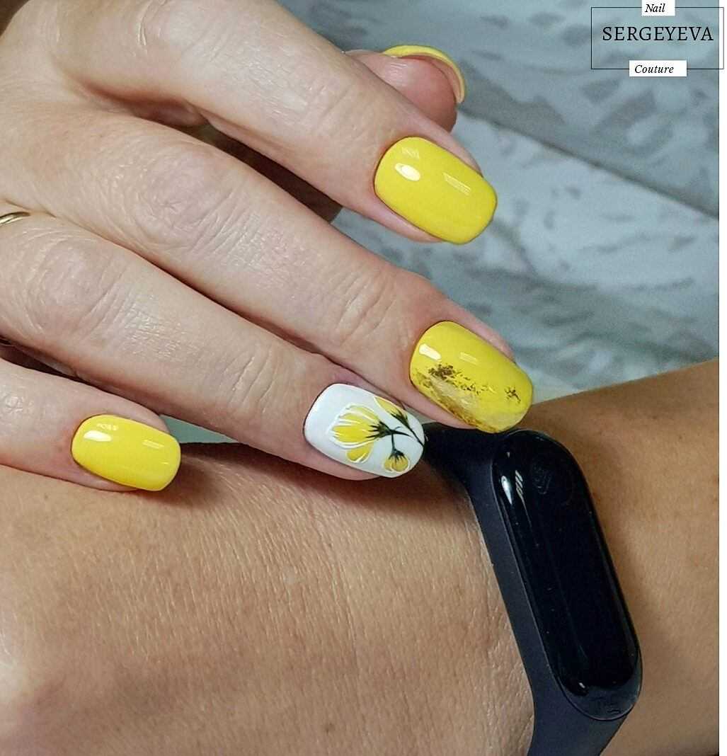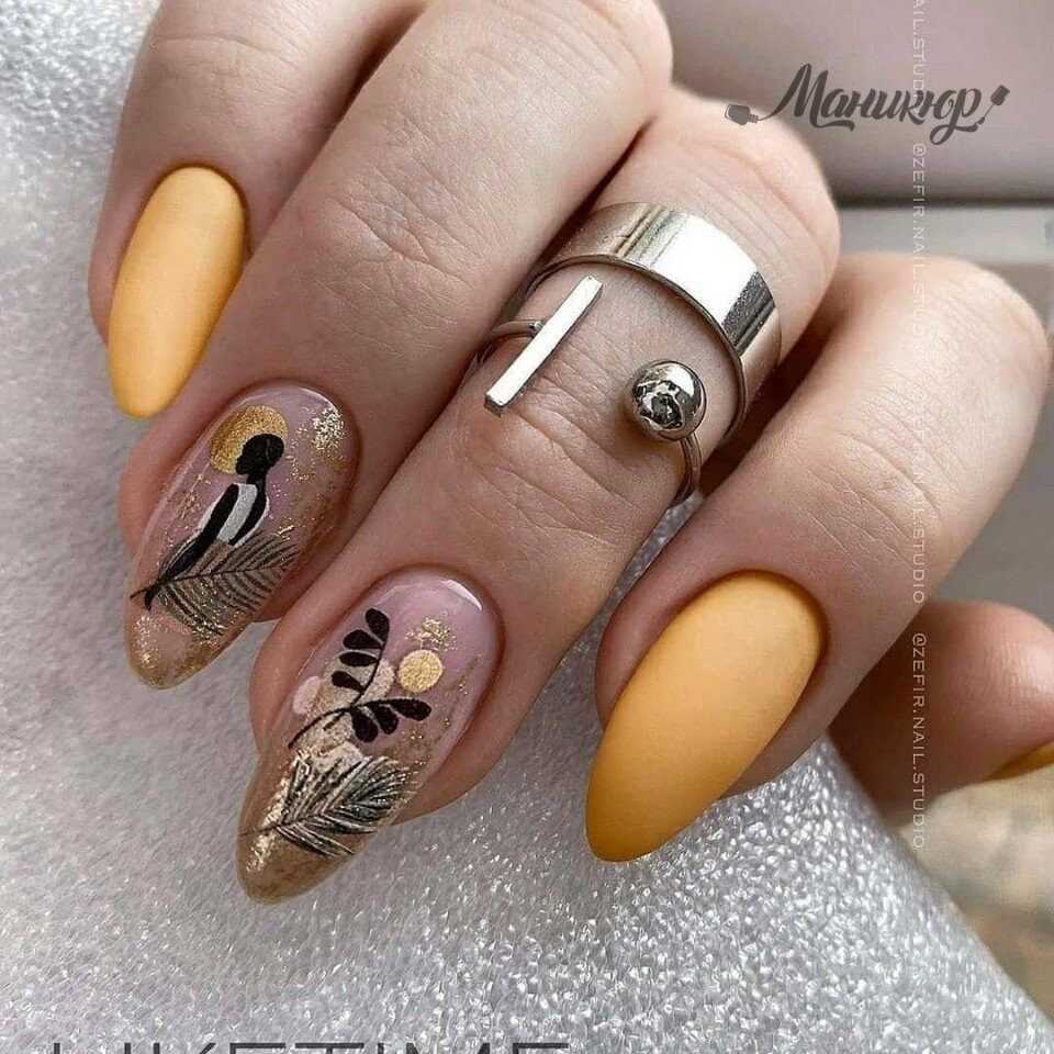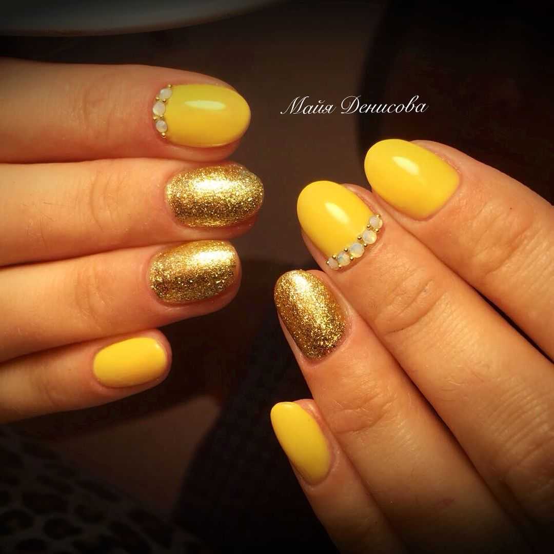 Желтый и золотой – визуально одинаковые оттенки, которые с успехом могут заменять друг друга в самых разных нейл-артах. Золотой цвет – далеко не повседневное решение. Его чаще всего используют для создания торжественных образов. Однотонный золотой маникюр, несомненно, будет выглядеть слишком вызывающе и нелепо, а вот сочетания этого цвета с другими тонами вполне приемлемо.