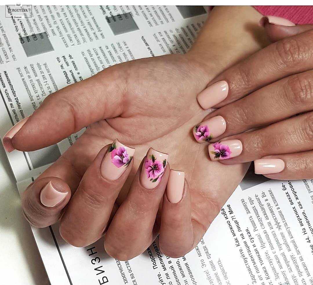 Для того, чтоб сделать бежевый маникюр более изящным и привлекательным, нужно использовать самые популярные и привлекательные узоры. Наиболее удачным вариантом считаются флористические мотивы. Они выполняются при помощи стемпинга, наклеек или в технике акварель.