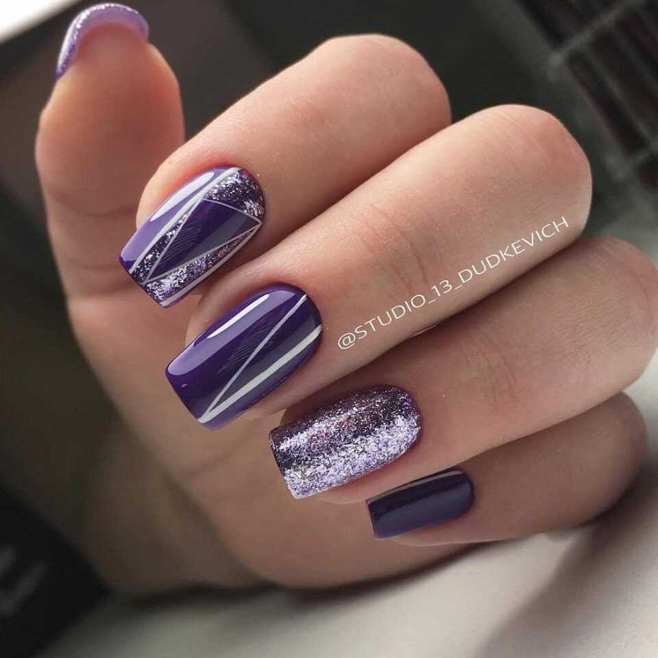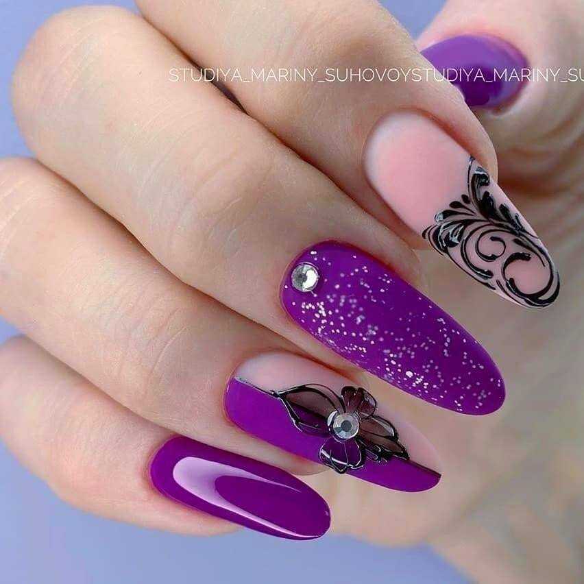 Уже несколько сезонов подряд, фиолетовый маникюр на пике популярности в осенне-зимний период. Красивый фиолетовый маникюр сочетается с многими техниками и видами дизайна: разные рисунки, блестки, камни, фольга, камифубуки, втирка.