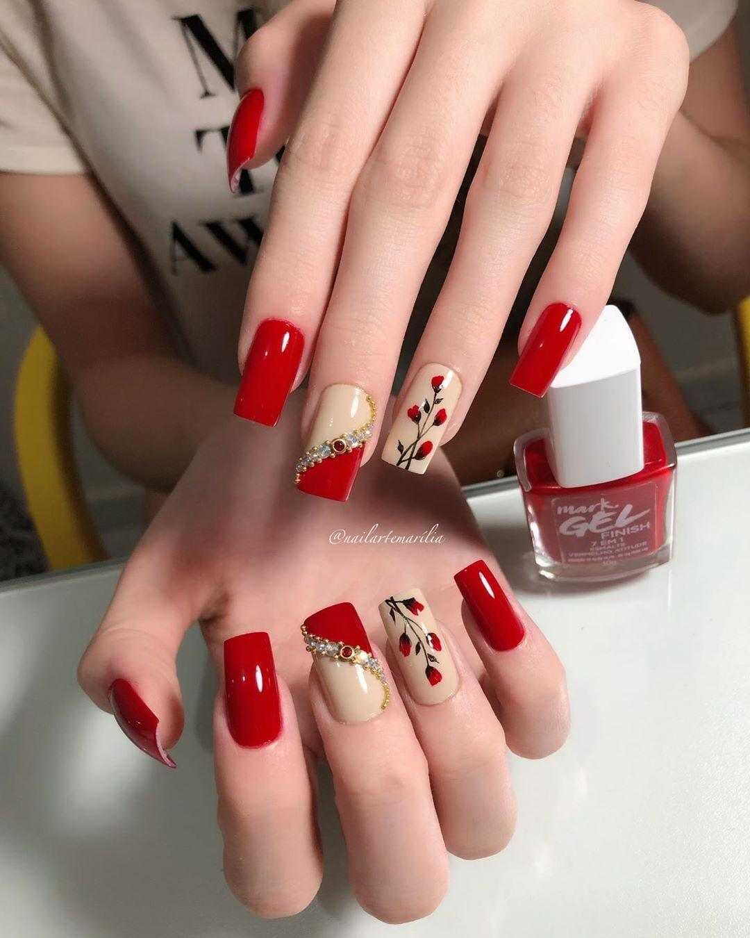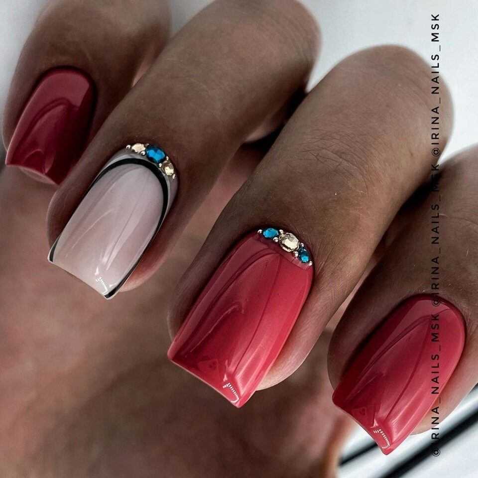Красный сочетается с многими оттенками, как с яркими, так и более приглушенными. Особенно красиво смотрится красный маникюр в сочетании с белым, черным, нюдовым и как раз все это можно использовать в новогоднем маникюре 2020.