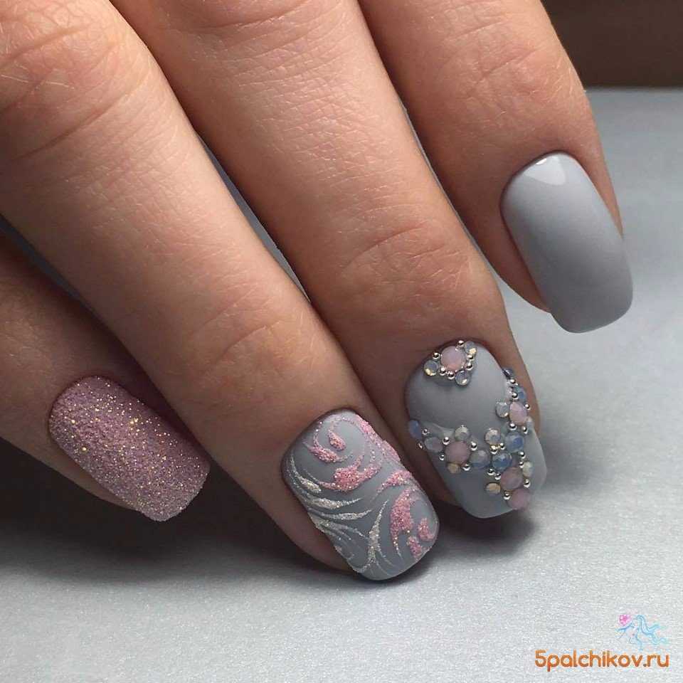 Не менее привлекательно смотрится идея дополнения однотонного серого покрытия различными розовыми деталями в виде миниатюрных геометрических фигур, полос, мазков или принтов. Если же предложенные примеры кажутся вам недостаточно выразительными, то всегда можно освежить ноготки несколькими усложнёнными рисунками, например, букетами цветов, объёмными узорами, выполненными акриловой пудрой или сверкающими акцентами из страз или либо блёсток глиттера. Подобное решение дополнит весь образ праздничными нотками и позволит ноготкам смотреться более привлекательно.