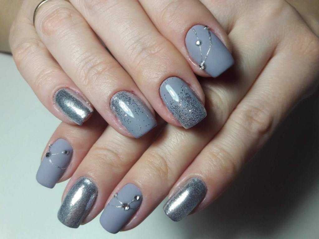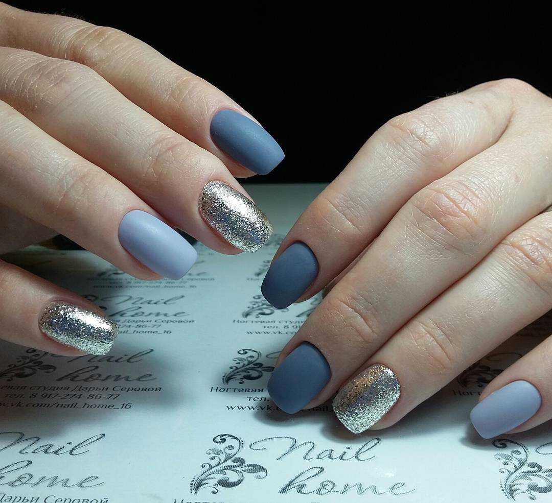 Серо-синяя цветовая гамма актуальна для сезона осень – зима. Дополнить дизайн можно серебристым блеском пудры, страз или фольги. Красиво на ногтях смотрятся новогодние серо-синие снежинки или вензеля.