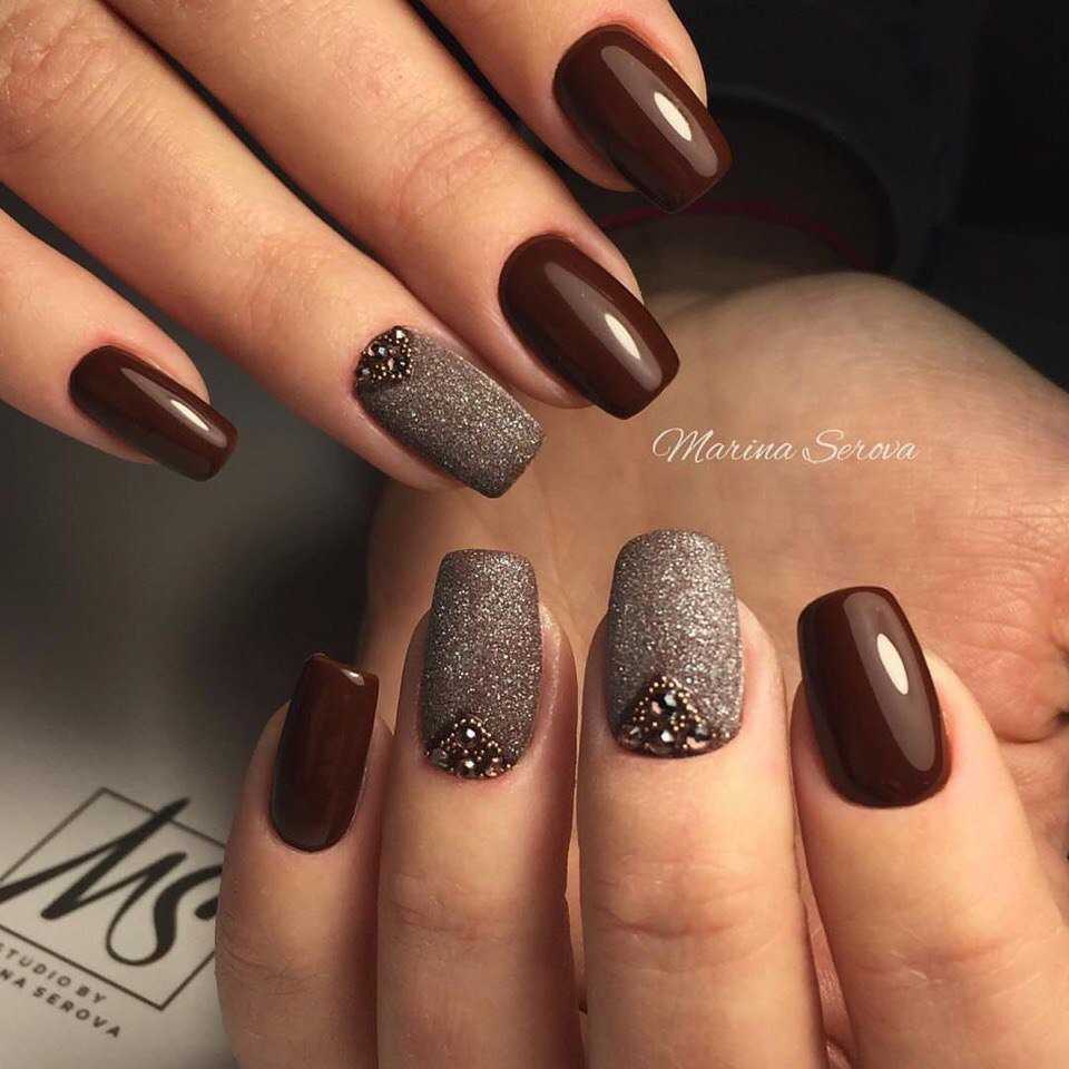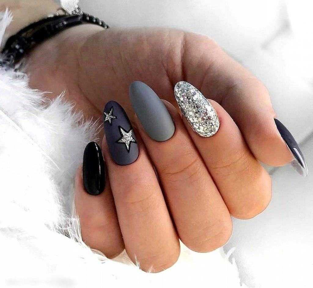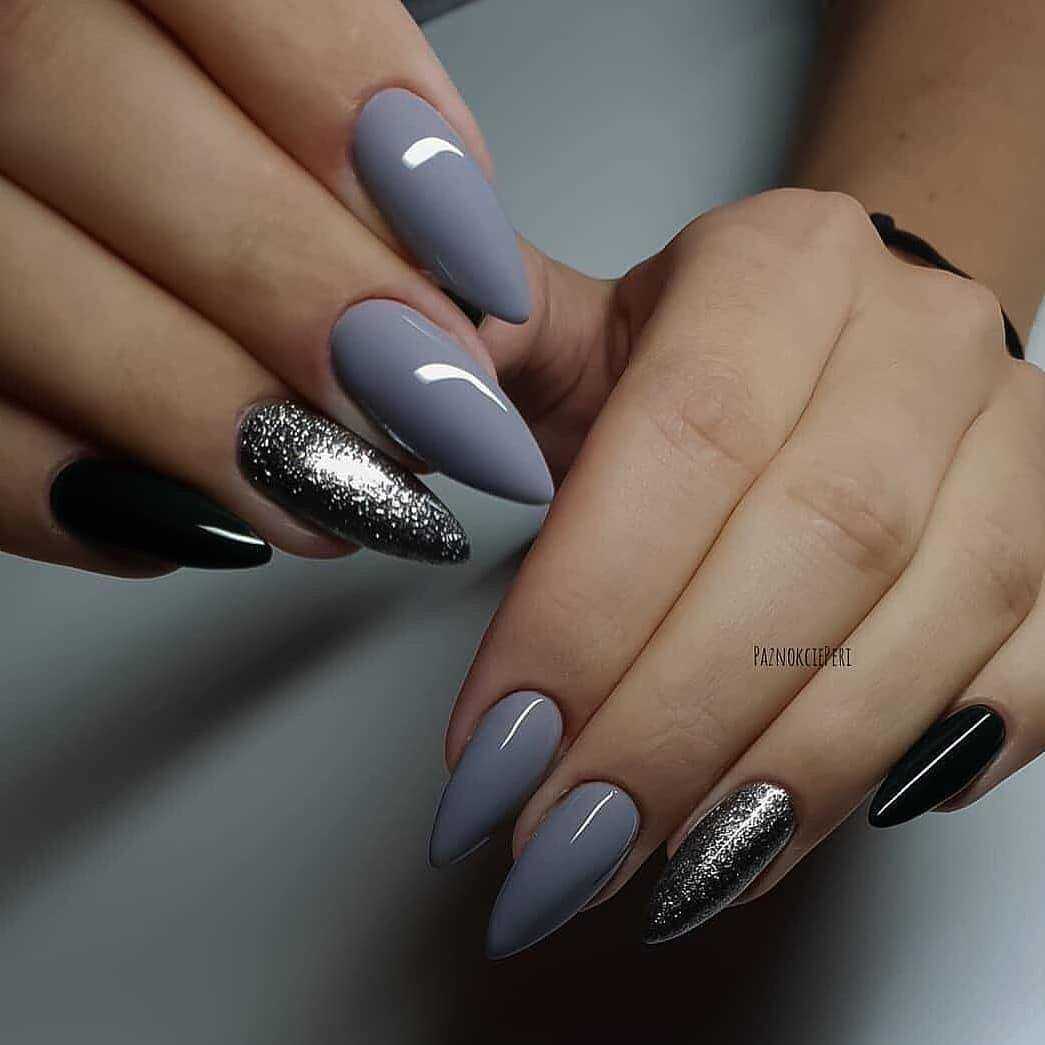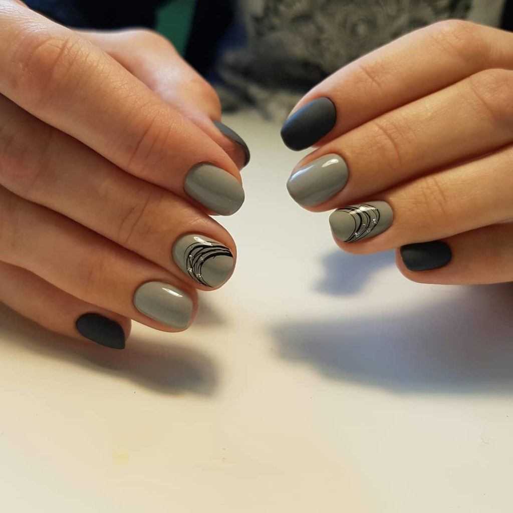 Несколько брутальный черно-серый дизайн чаще всего делается по особым случаям. Например, на корпоратив или новогоднюю ночь можно сделать маникюр серый с блестками либо со стразами и поверх нанести едва уловимый черный рисунок.