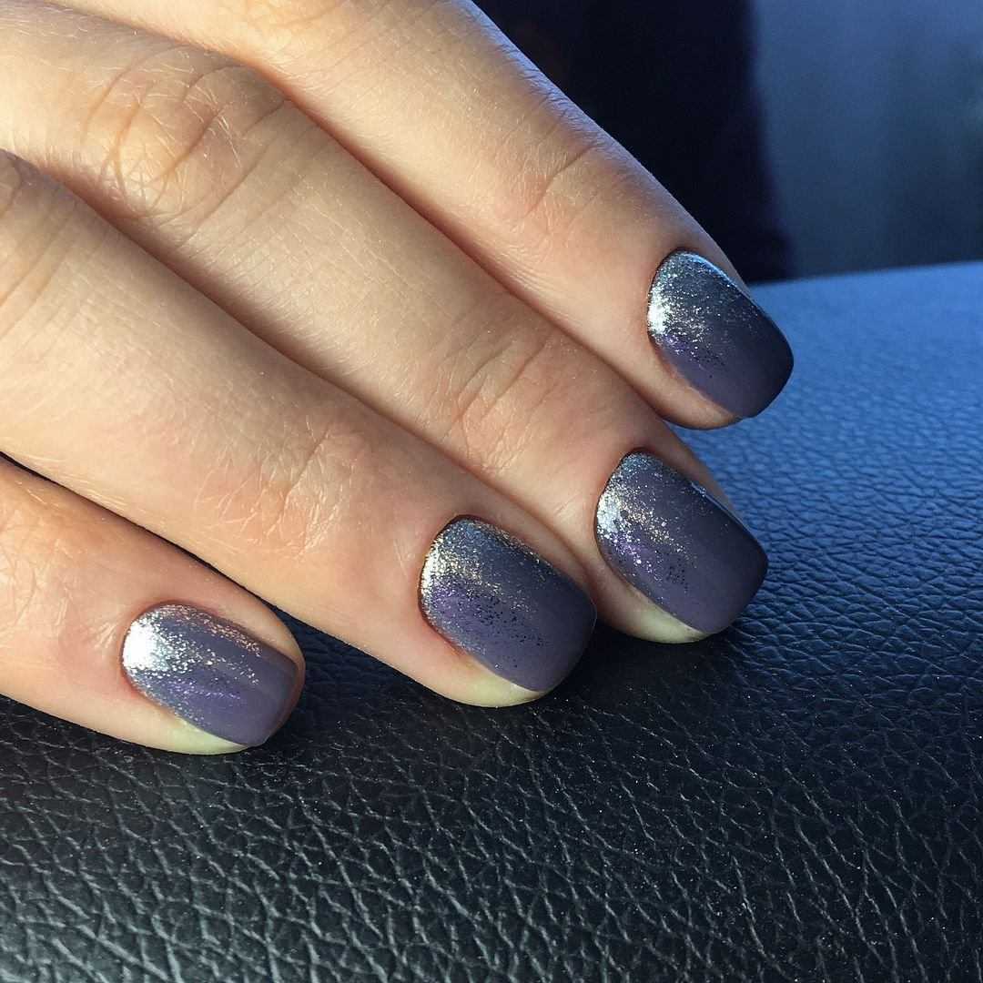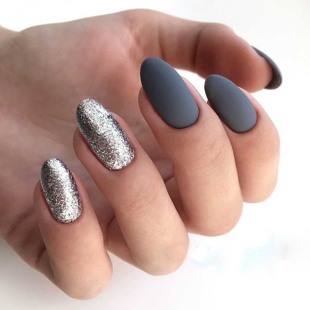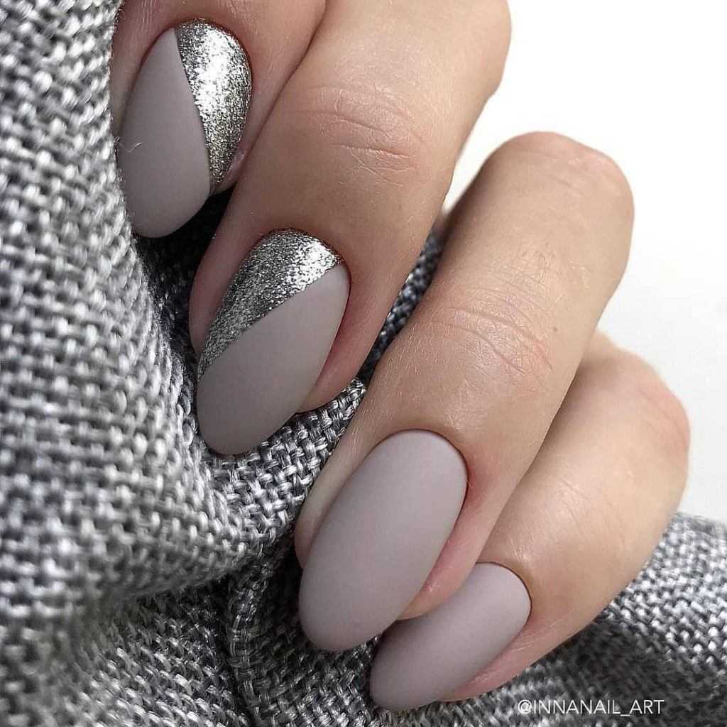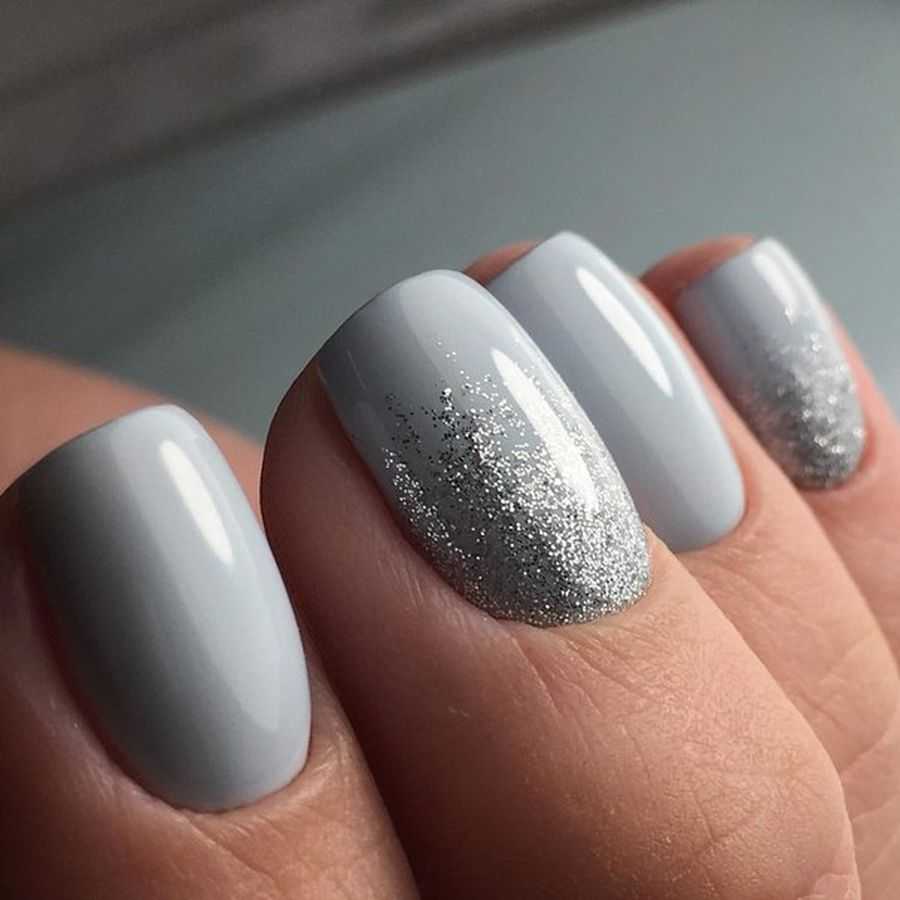Тренд сезона – металлизированные фактуры. Стальные, серебристые и золотые оттенки как нельзя лучше сочетаются с серым цветом. Аналогичного эффекта можно добиться использованием шиммера или глиттера по краю ногтя.