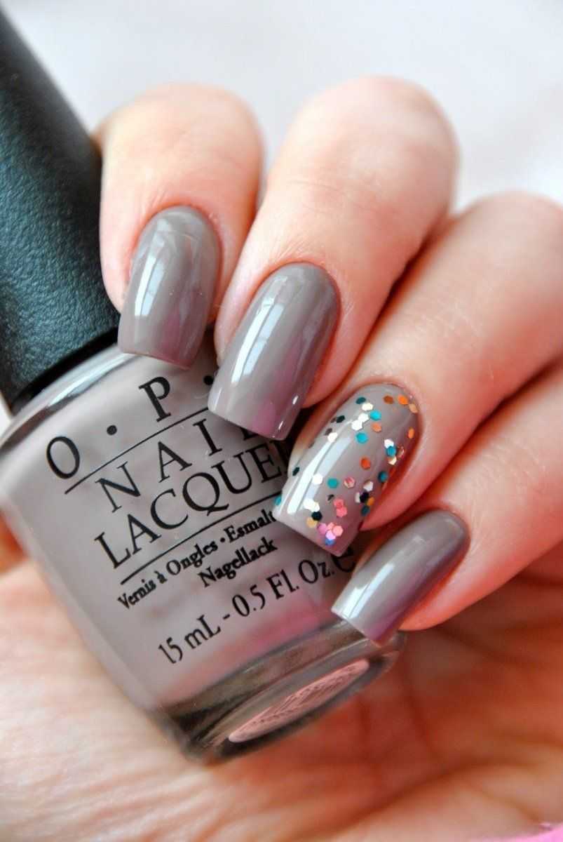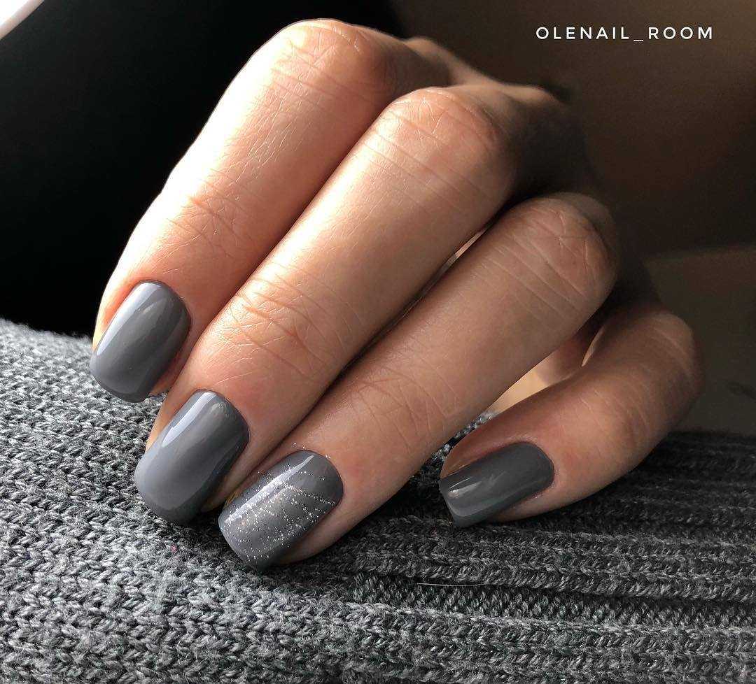 Для маникюра на коротких ногтях подойдут практически все оттенки серого, однако темные, такие как мокрый асфальт или антрацит, визуально удлиняют ногти и делают маникюр более выразительным.