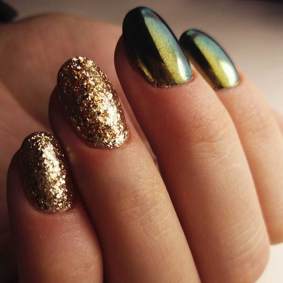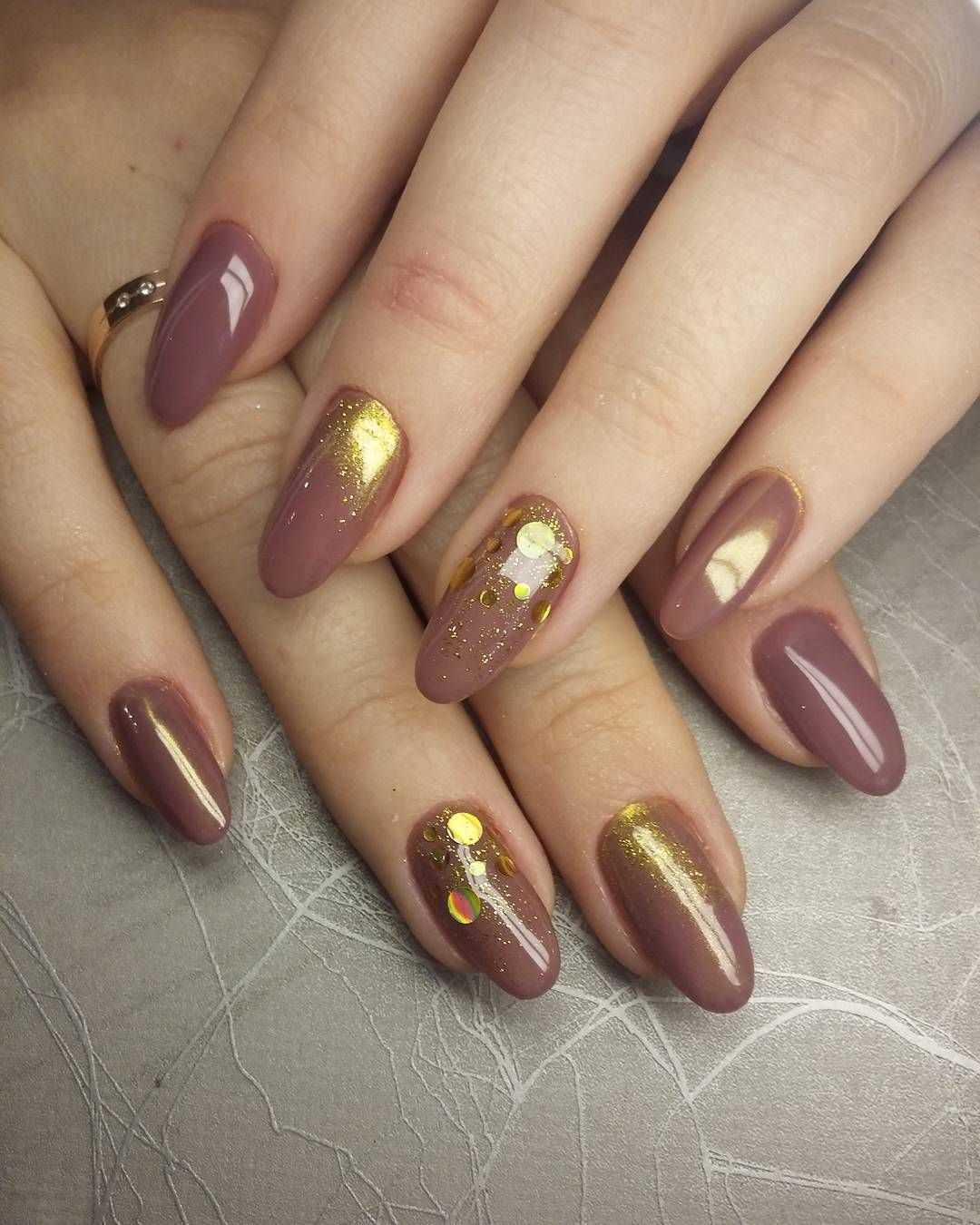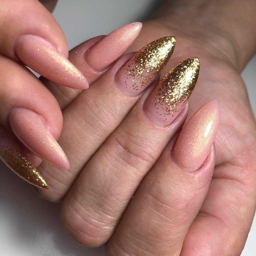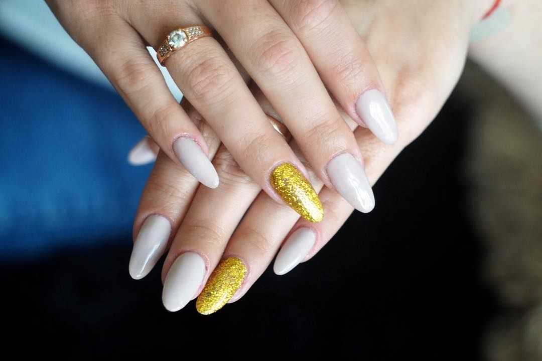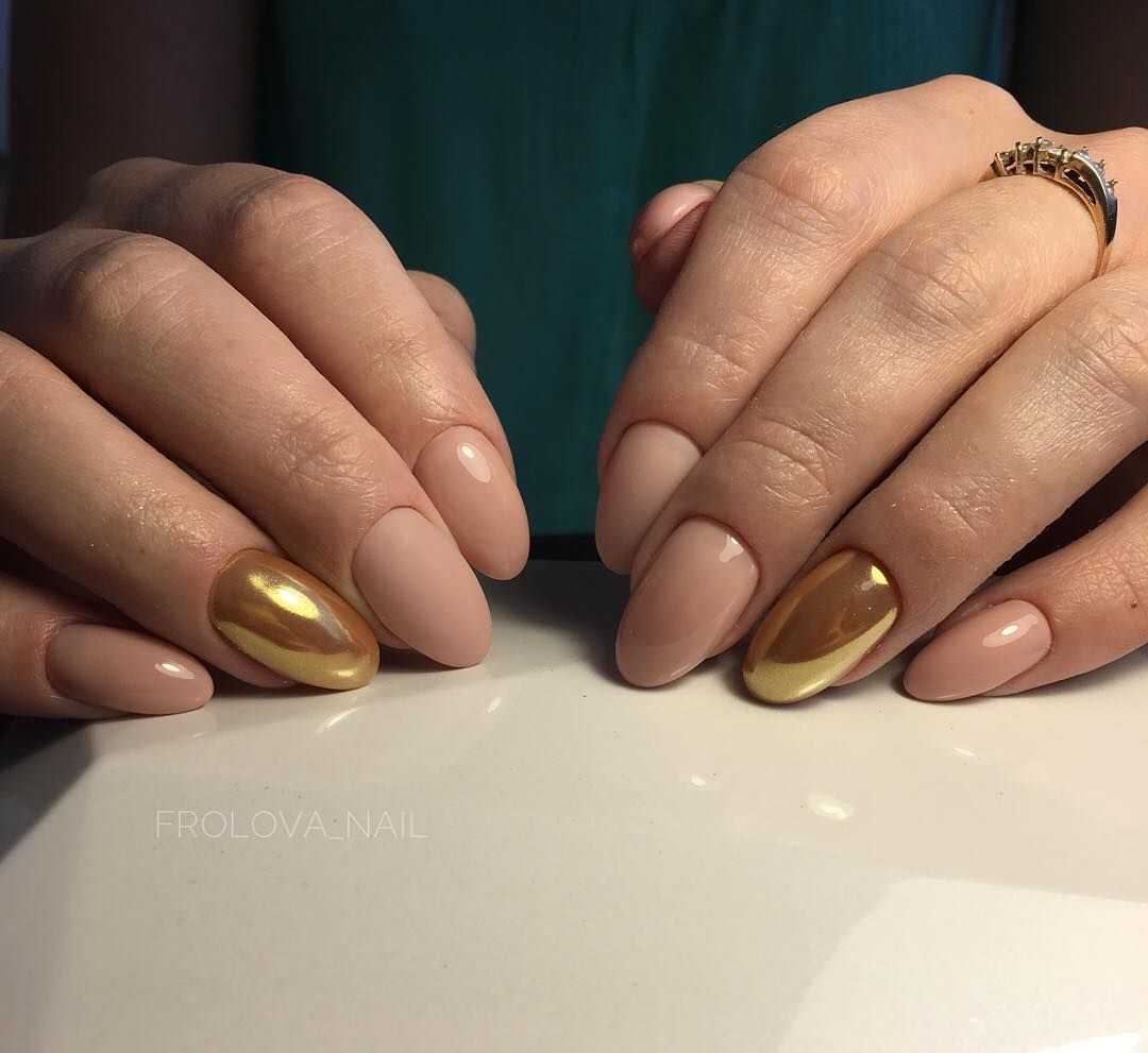 Миндалевидные ногти считаются женственными и нежными. Им, как никаким другим, подходит пара бежевого и расплавленного драгоценного металла. Такая форма дает большее разнообразие в декоре. Главное — мастерство нейл-мастера и фантазия самой обладательницы ноготков.
