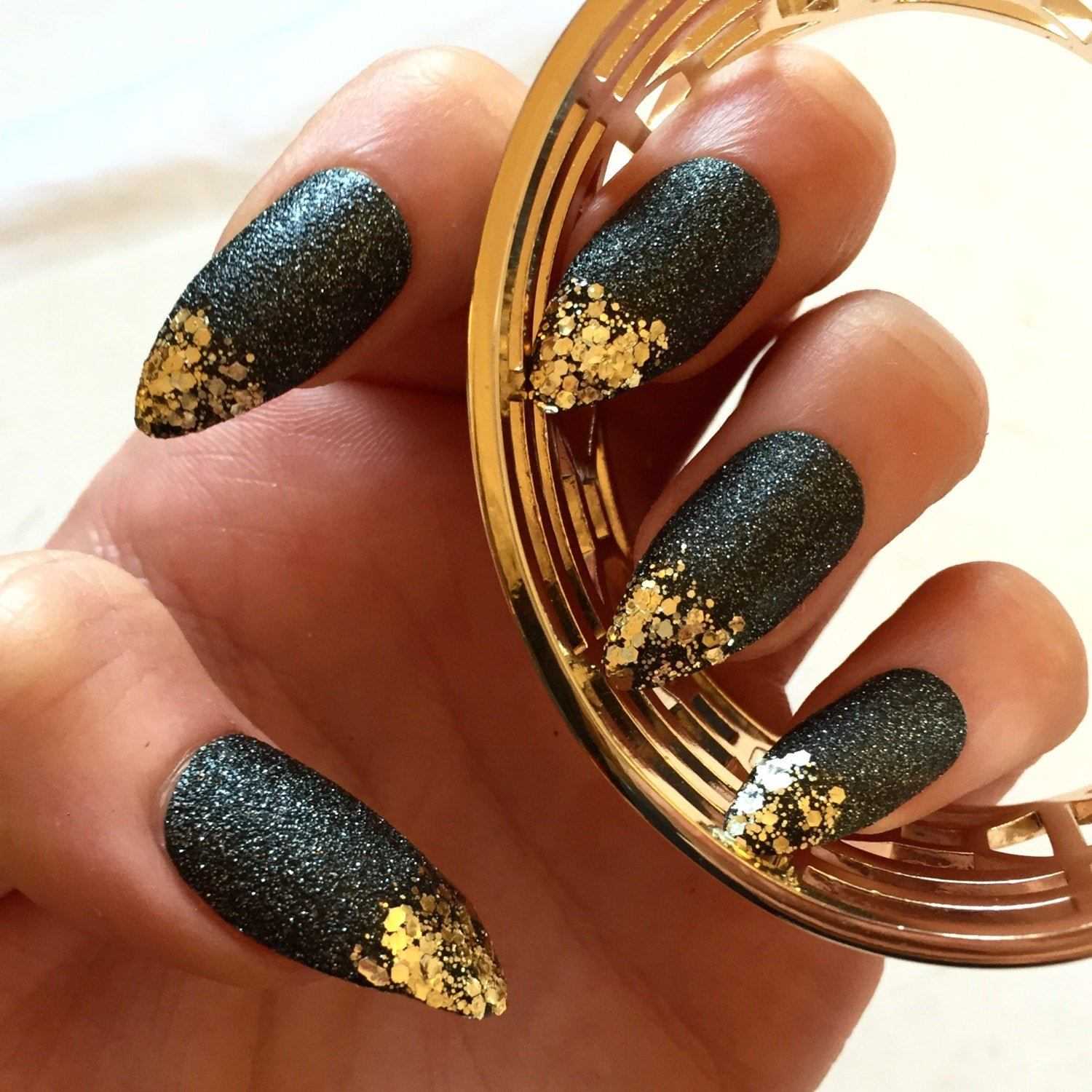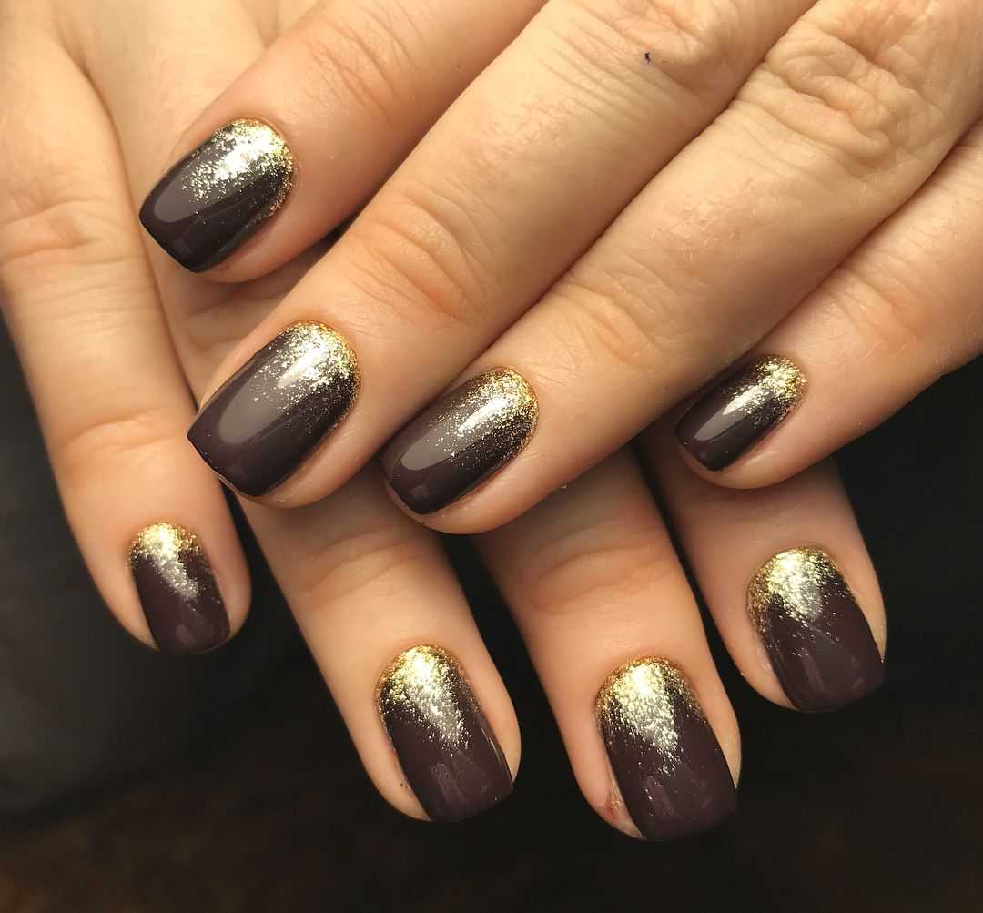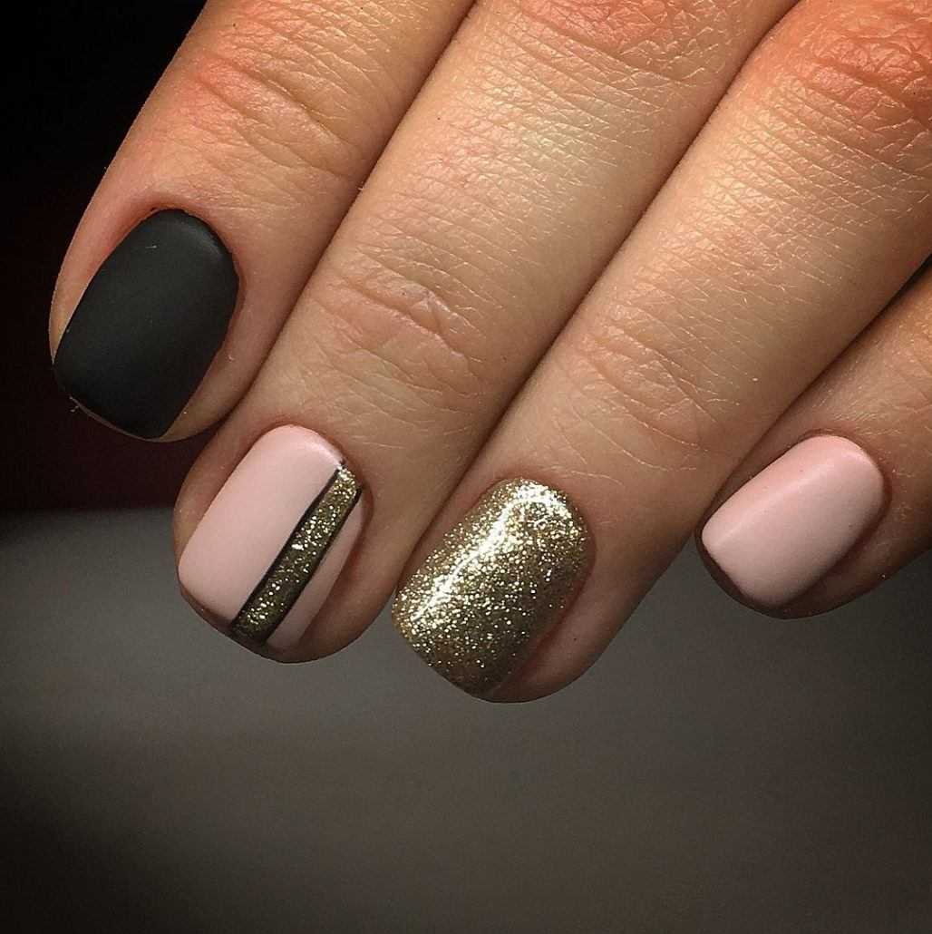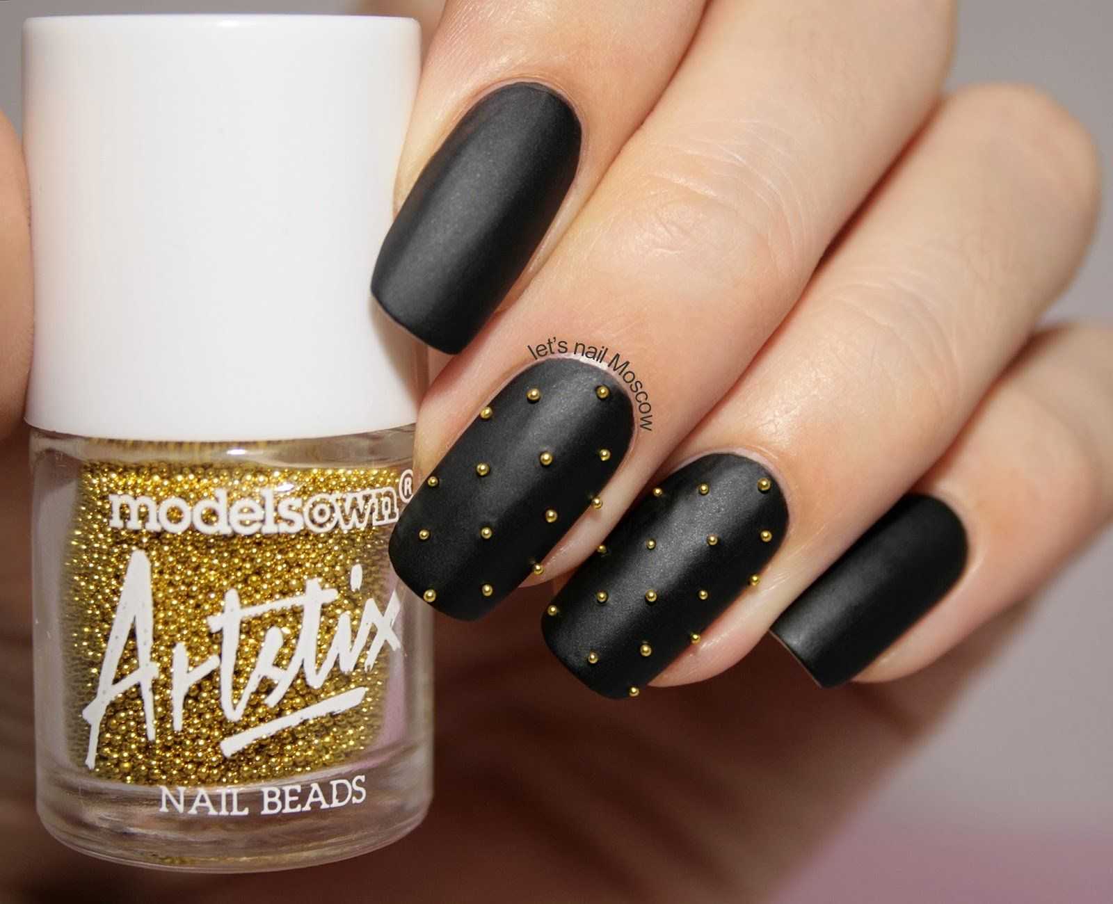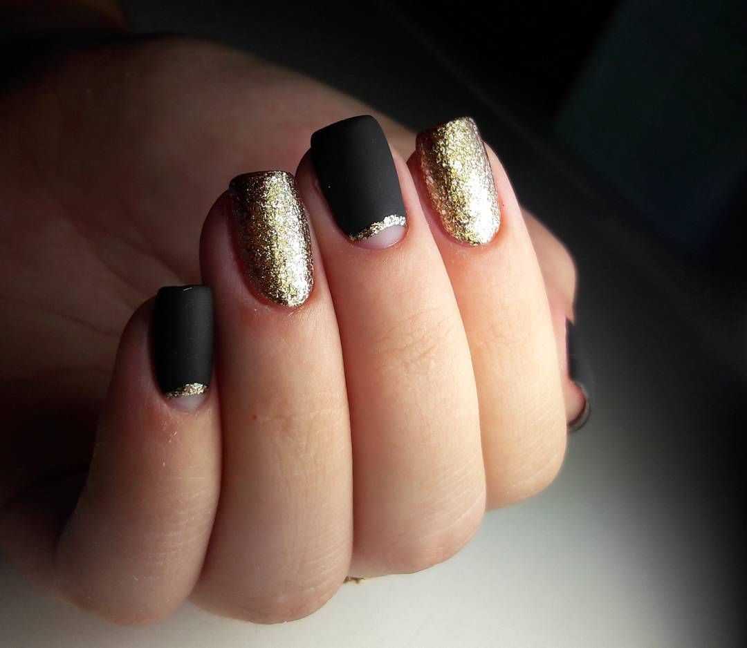 Не менее востребованы стразы, бусинки и пайетки которые красиво смотрятся в роли акцента или украшения всех пальчиков. Золотистый глиттер или шиммер шикарно переливаются на ноготках в технике омбре и очень изысканно выглядят в качестве покрытия на одном-двух ноготках. Основное правило для таких шикарных вариантов – не перегрузить дизайн излишними украшениями. Чёрные ноготки сами по себе достаточно заметные, и даже самый незначительный перебор может создать отталкивающий эффект.