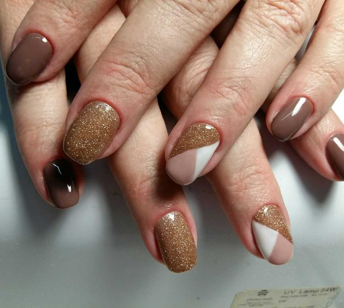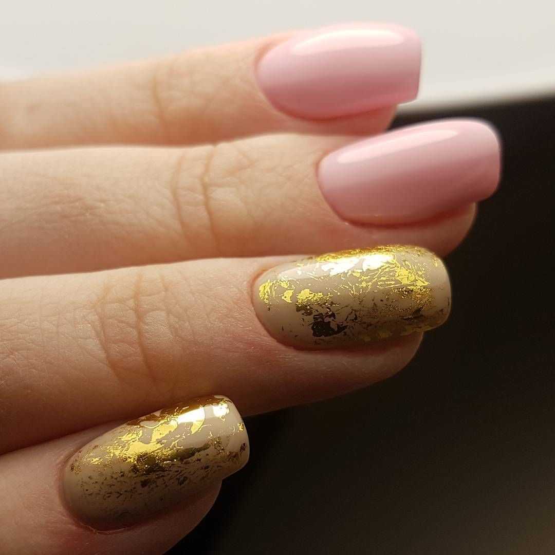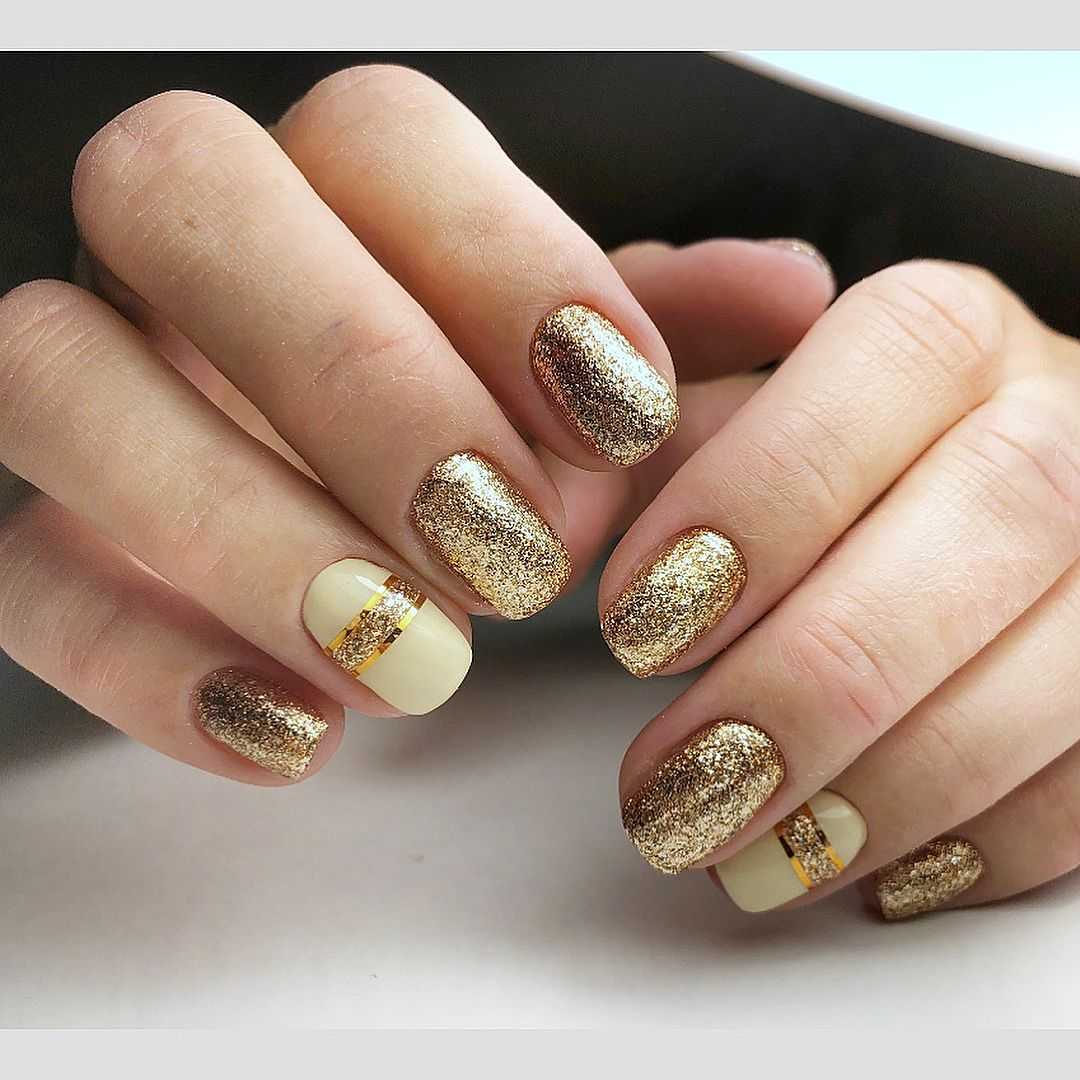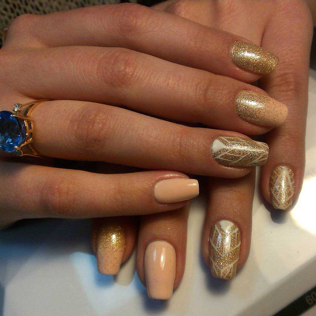 Бежево-золотой маникюр на разную длину и форму ногтей