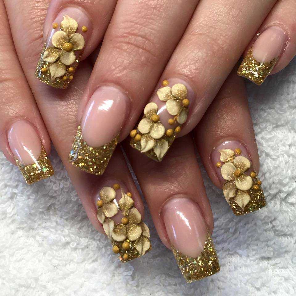 Прекрасные и утонченные цветочки, выполненные золотым глиттером, выглядят роскошно и изящно. Такой узор лучше всего наносить на основе контрастного цвета. Очень привлекательно и обворожительно выглядят переливающиеся цветочные рисунки на матовой поверхности. Чтоб рисунок выделялся, можно выполнить окантовку лаком контрастного цвета.