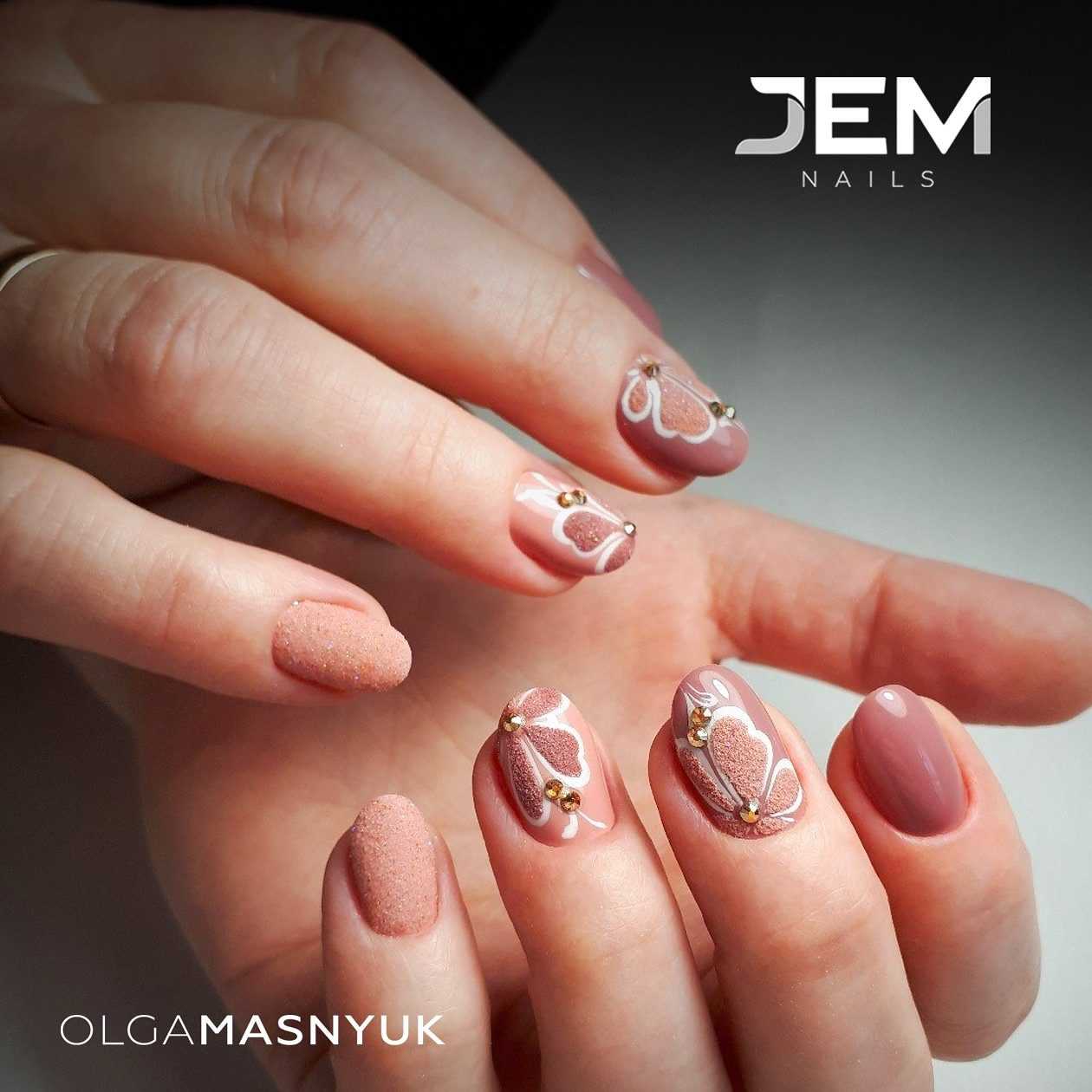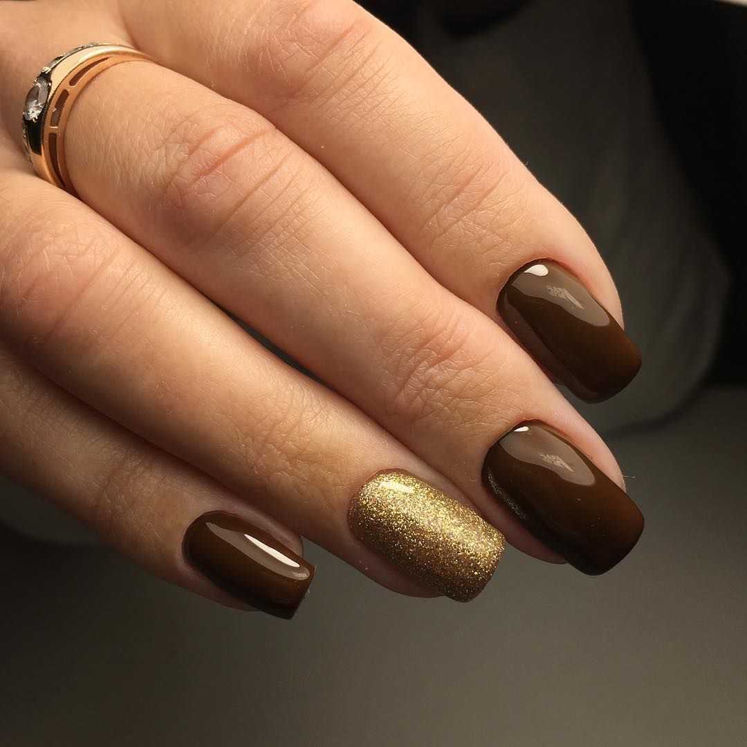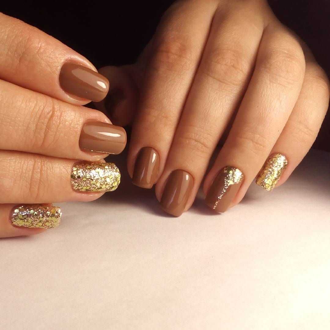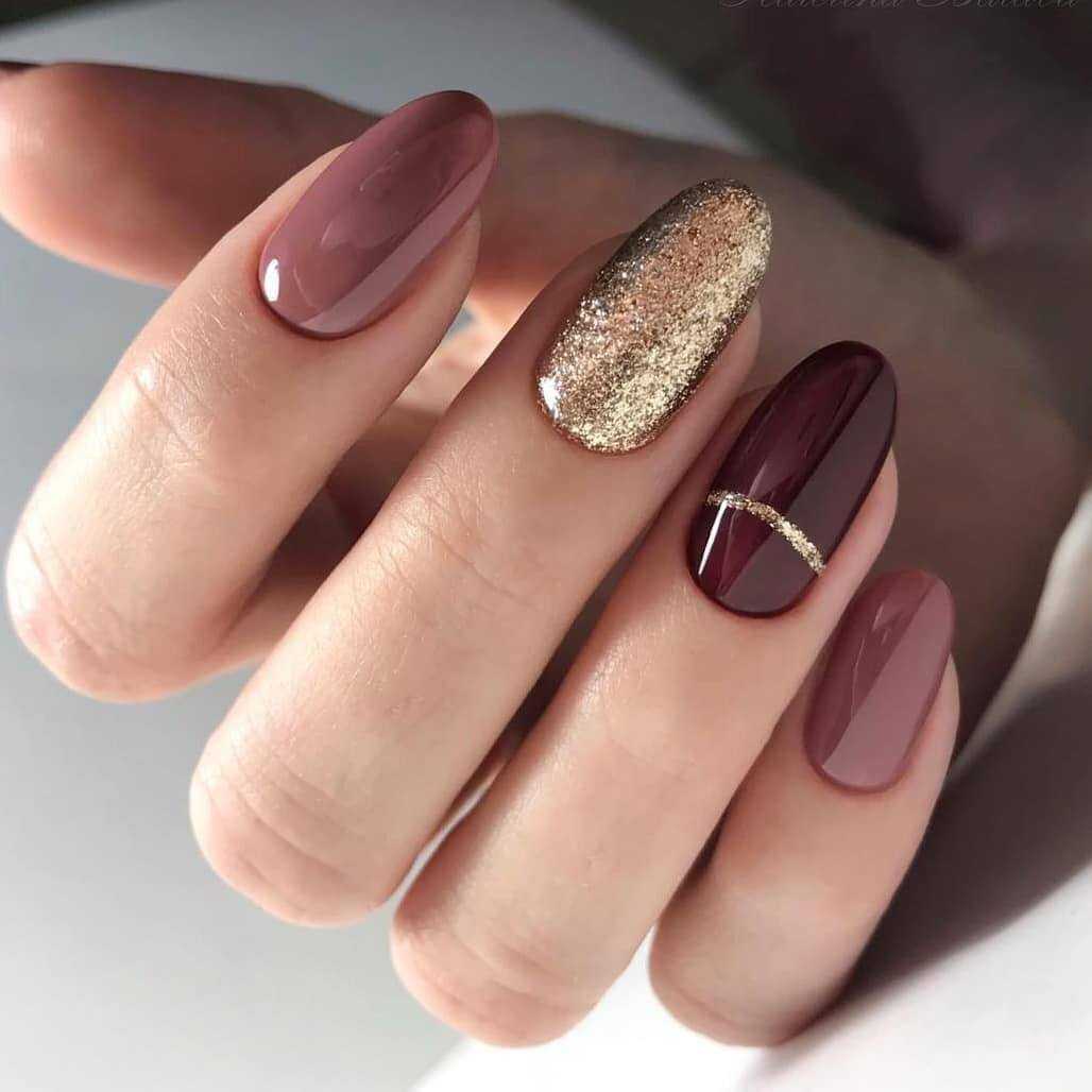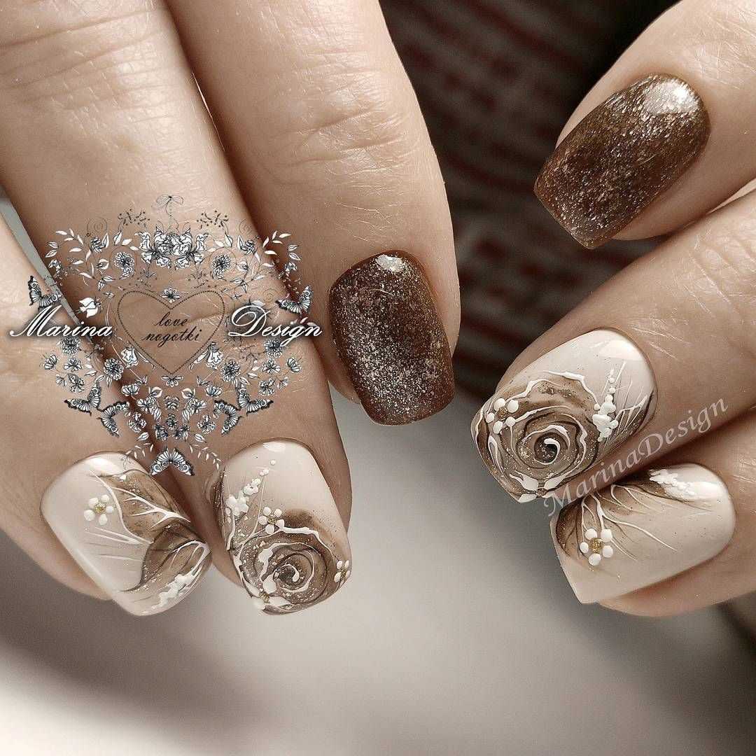 Маникюр, в котором сочетаются оттенки бежевого и золотого может выступать в качестве самостоятельного нейл-арта. Но если хочется, можно дополнить его дизайном в виде рисунка. Для последнего выбирают подходящий по гамме контрастный оттенок. Например: шоколадный, черный, винный, марсала, киноварь, розовый и др.