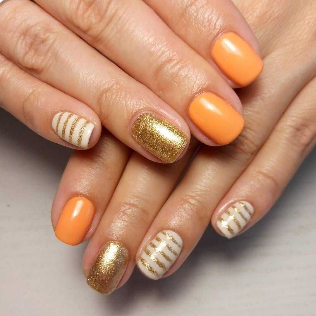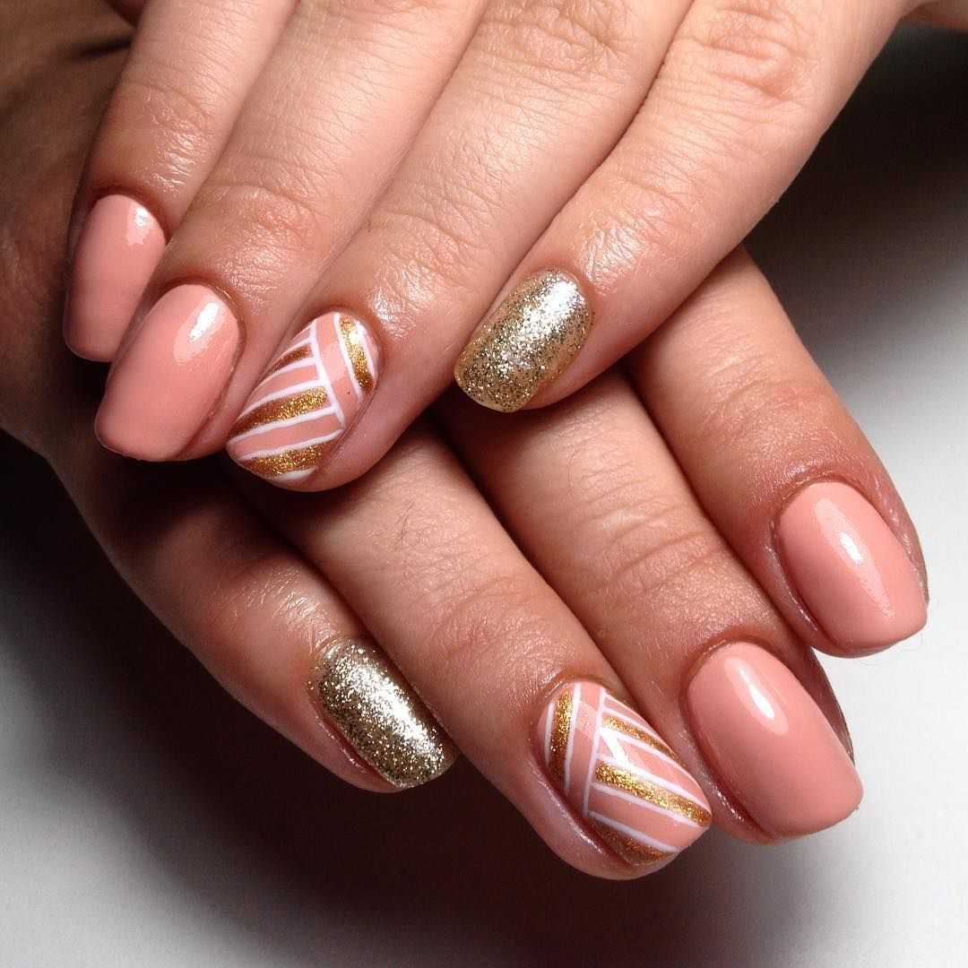 На короткой длине отлично смотрится маникюр, в котором на бежевом фоне золотой декор занимает небольшую часть — изящная полоска, оформление лунки или края ноготка.
