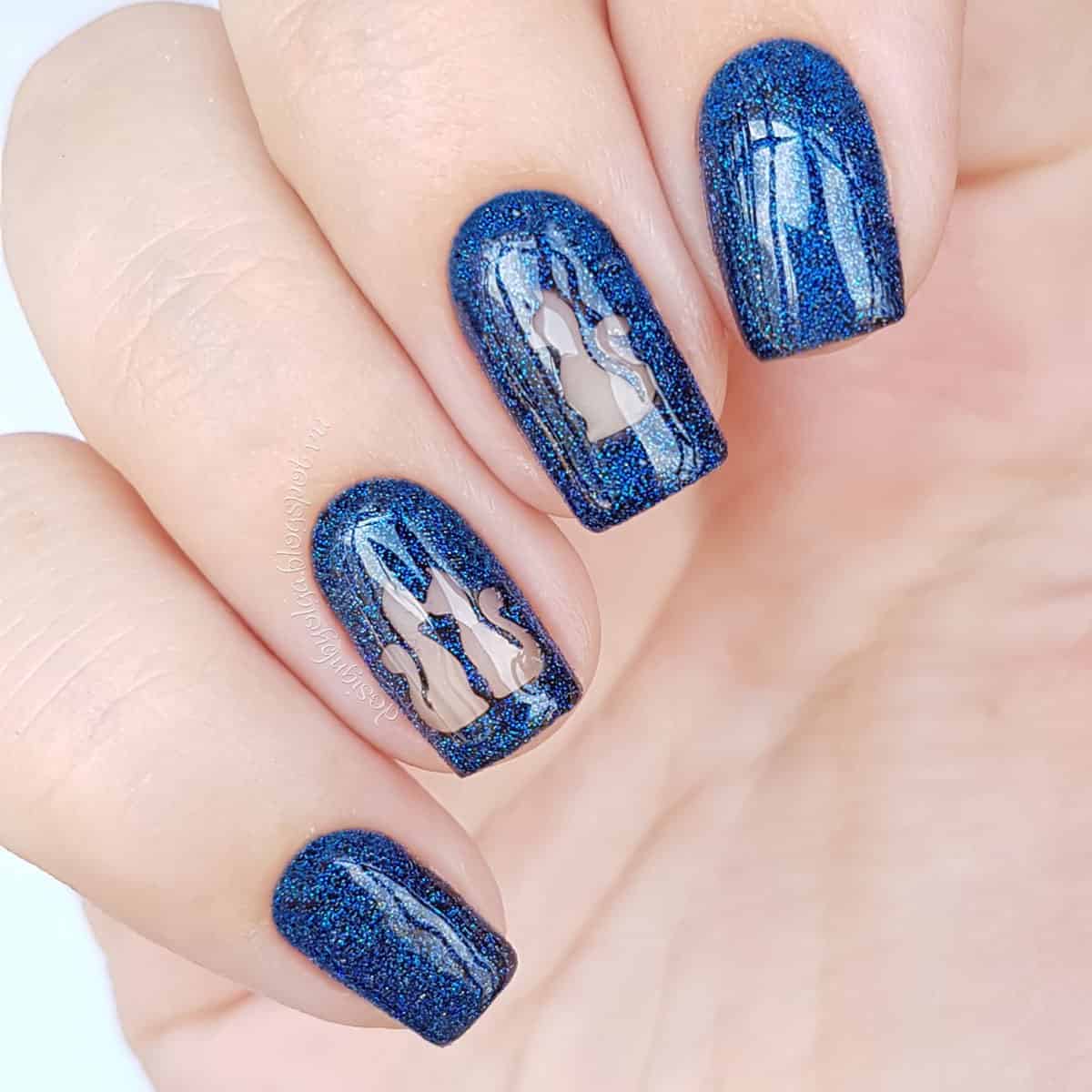 Для создания стильного маникюра в стиле «deep desing» используются специальные клейкие трафареты. Нейл-арт сочетает в себе сразу несколько модных направлений – негативное пространство и трафаретные принты.