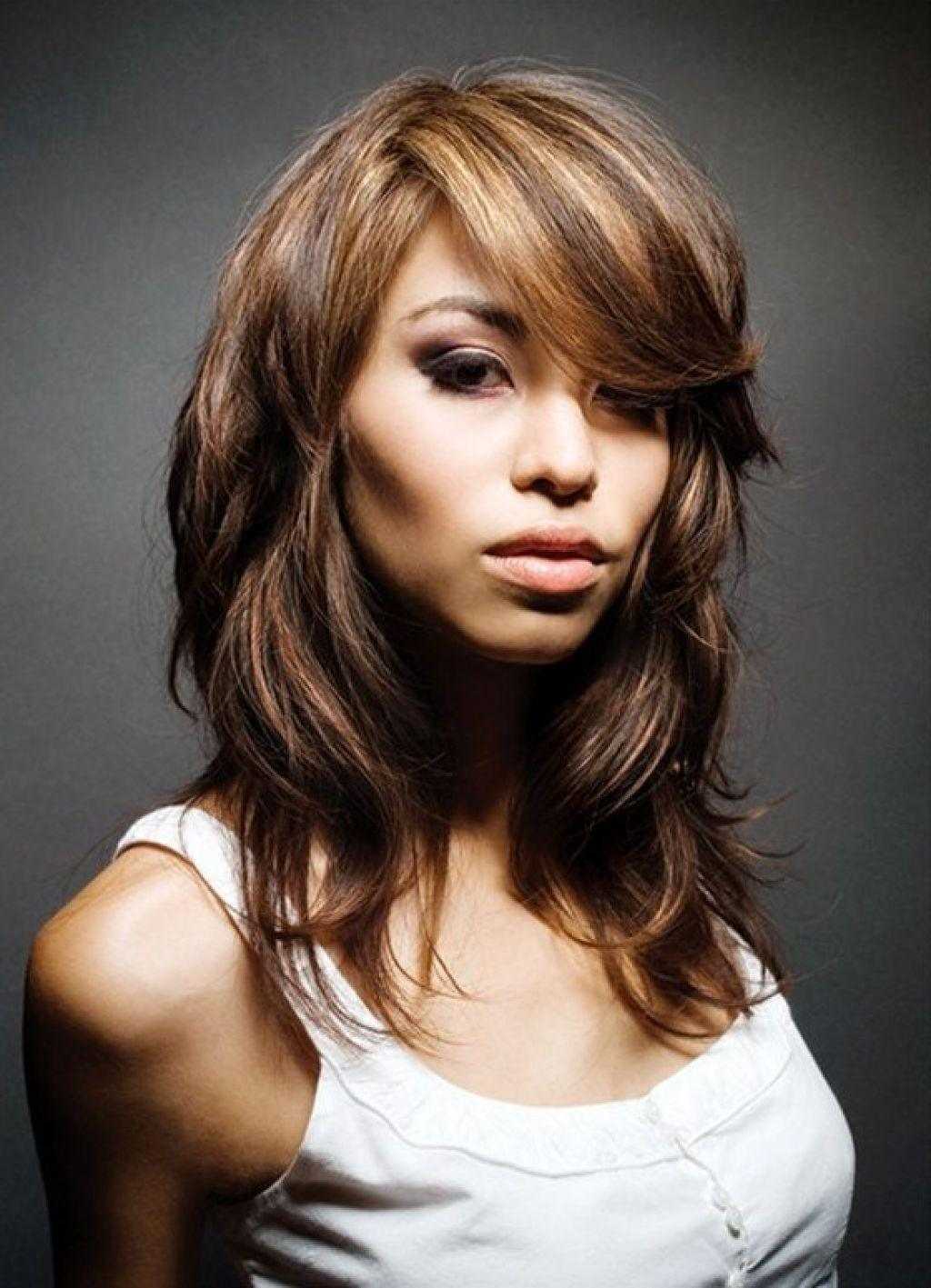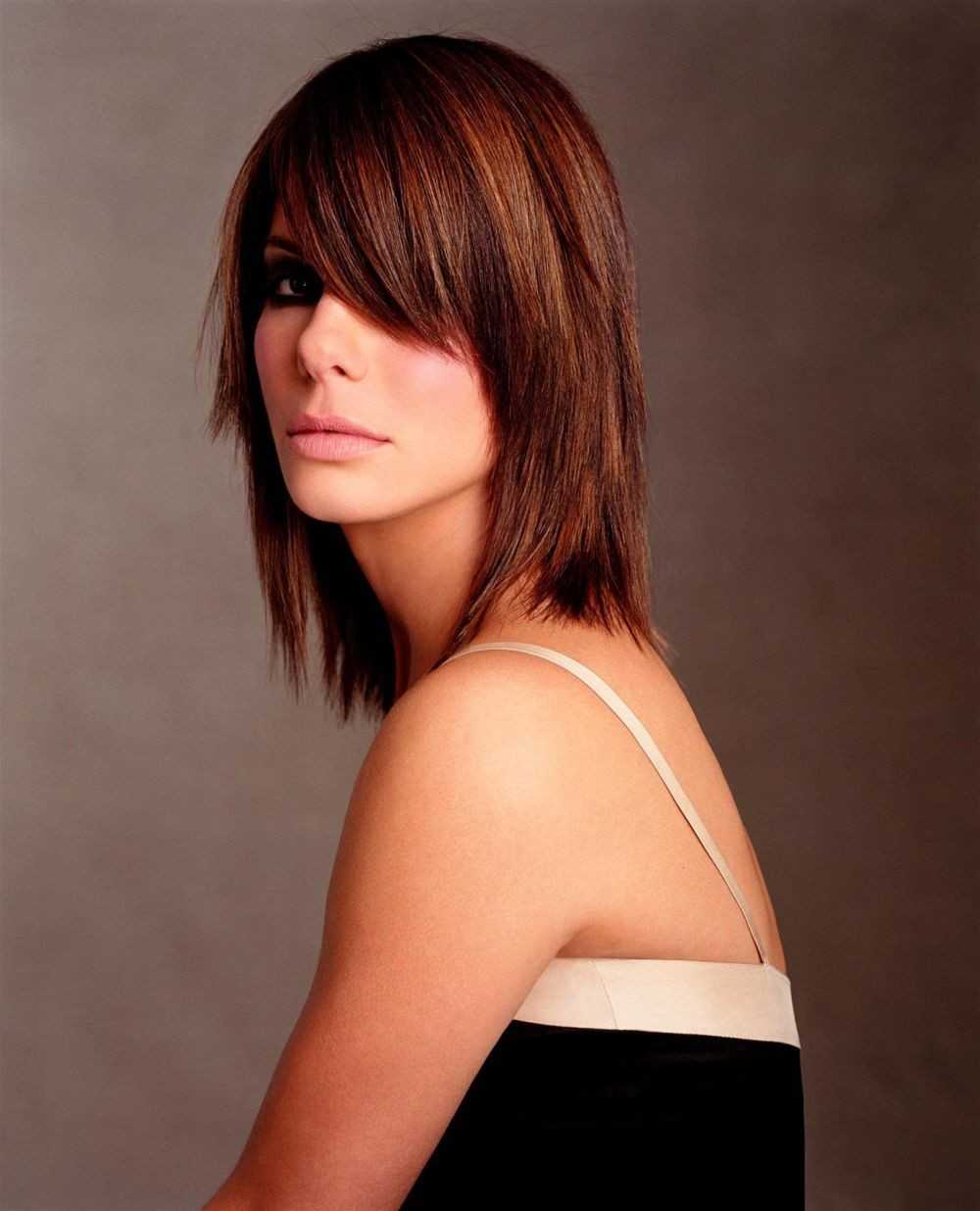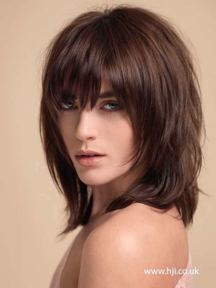 Косая челка сама по себе очень популярная сейчас модная тенденция, позволяющая делать образ незаурядным. А вкупе со средним каскадом она будет смотреться еще более привлекательно и стильно. Тем более, если углубиться в технику, то получается, что косая челка словно вливается в прическу, удачно комбинируя ее с переходами и слоями.