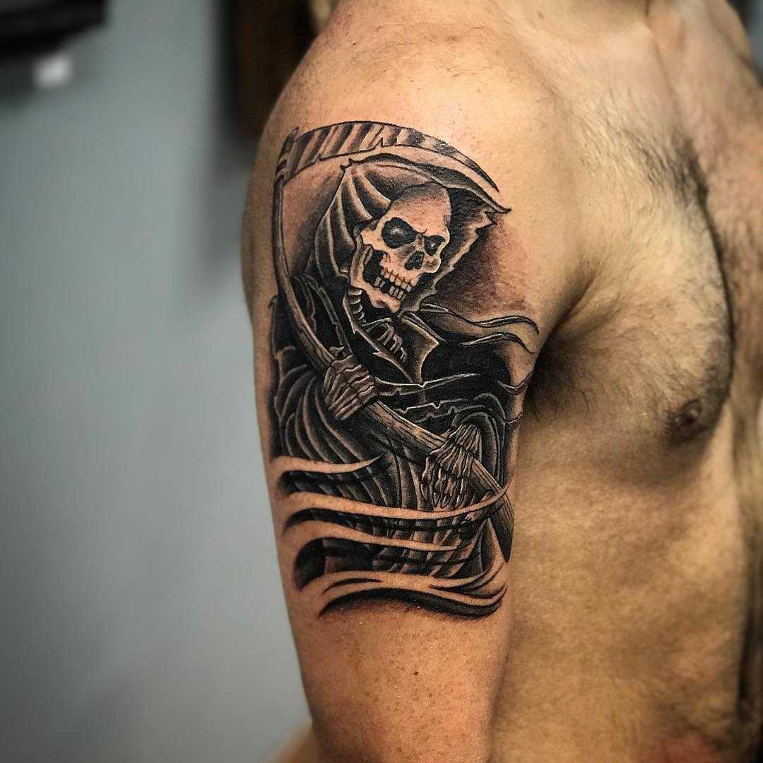 Татуировка смерть с косой может располагаться на любой части вашего тела. Желающие скрыть от посторонних глаз своё нательное украшение могут нанести тату на часть тела, которая почти всегда находится под одеждой. Если вас не смущает открытая демонстрация своего выбора – запретов в этом случае не существует. Наиболее распространёнными местами среди мужчин считаются плечо, предплечье, спина или область лопаток. Дамы наносят тату на бедро, живот, бока или руку. Окончательное решение при выборе места для рисунка всегда принимает будущий хозяин, но игнорировать советы тату-мастеров в нашем примере не стоит.