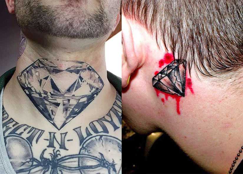 На шее изображение тату алмаз считается символом, приносящим успех и безграничное счастье. Многие размещают тату алмаз на запястье, что символизирует женскую непорочность и неподкупность. Такое изображение, расположенное на видной части тела говорит о непобедимости и бесстрашии человека.