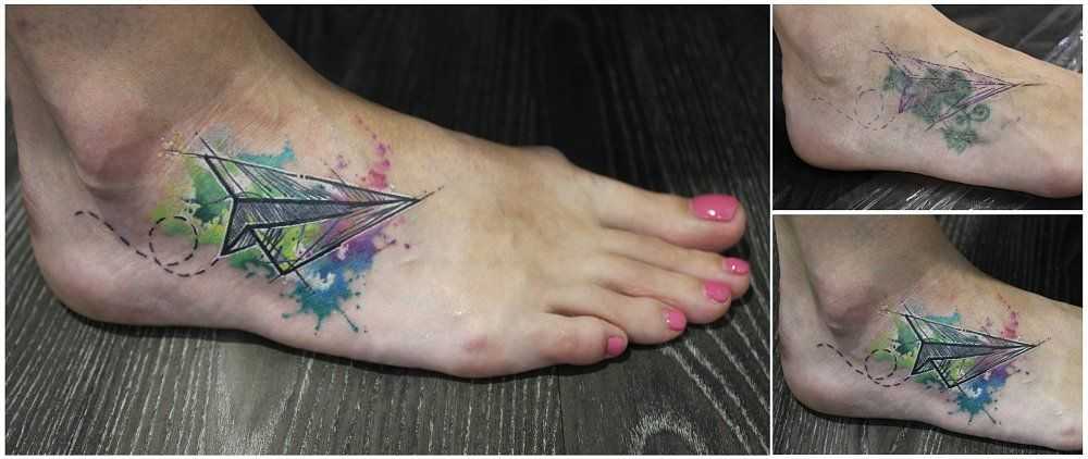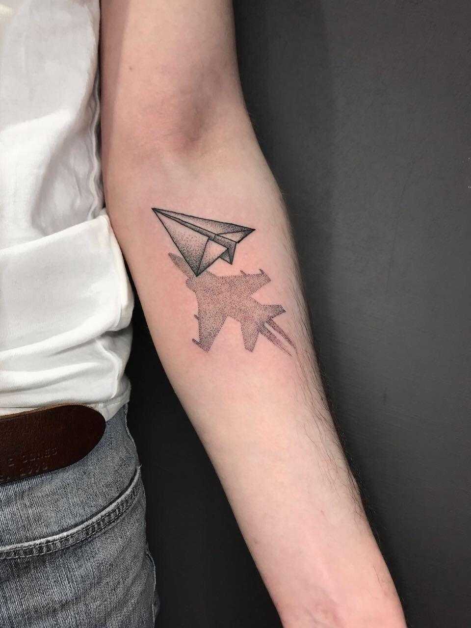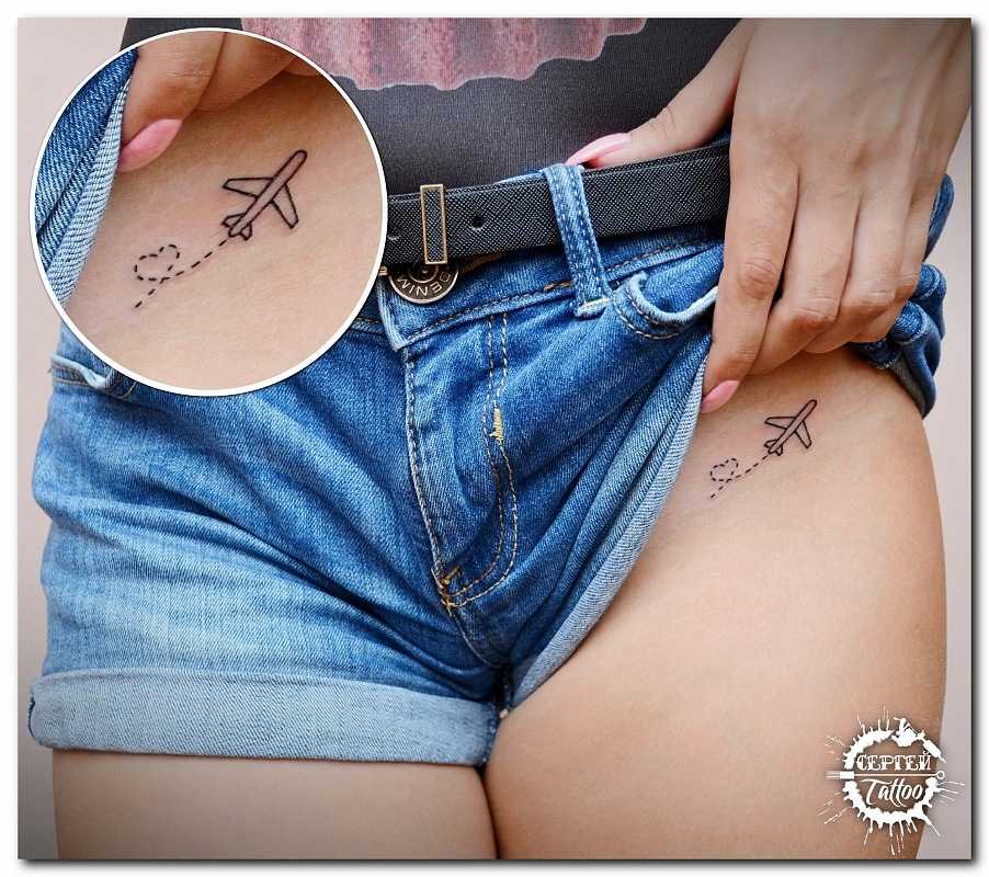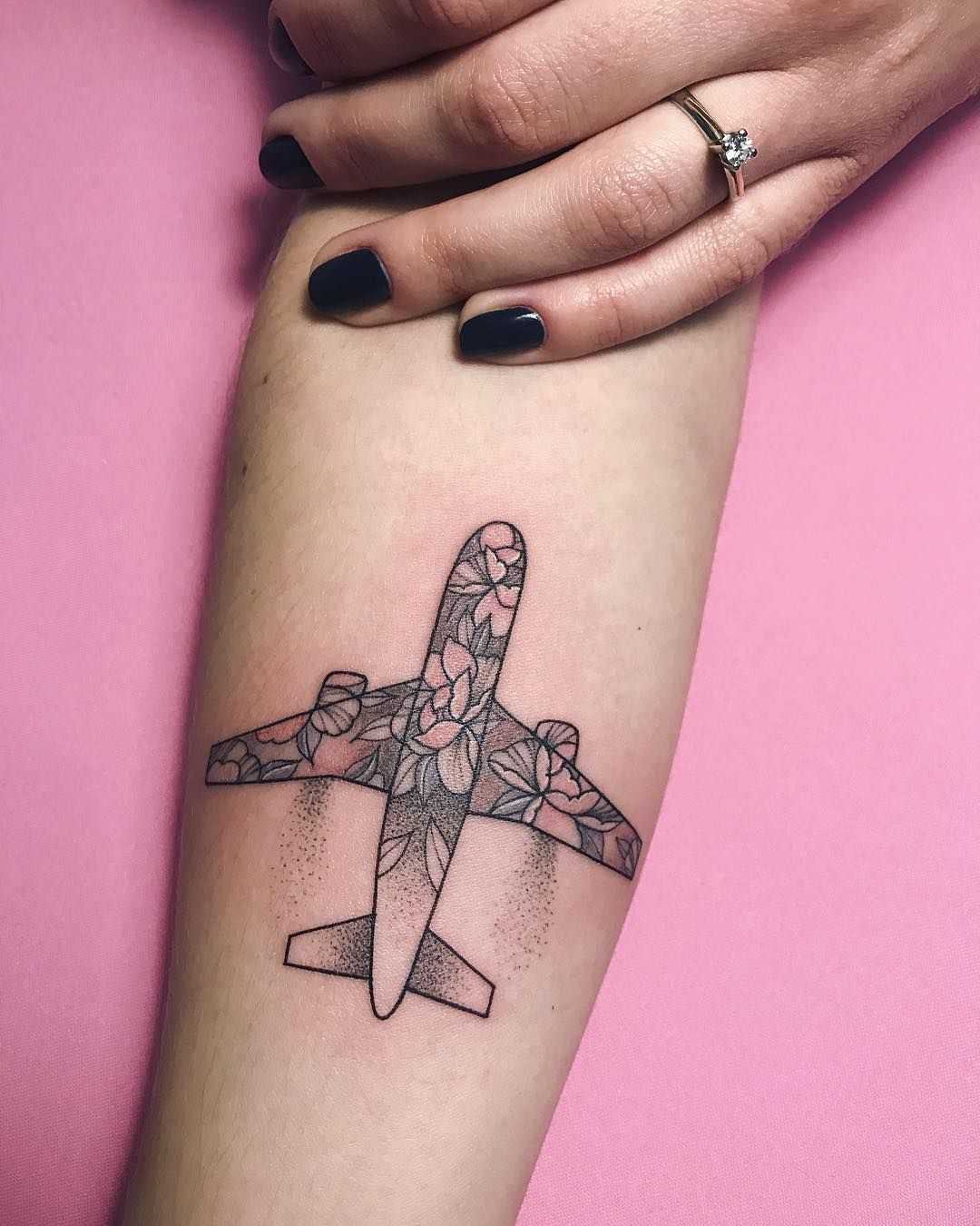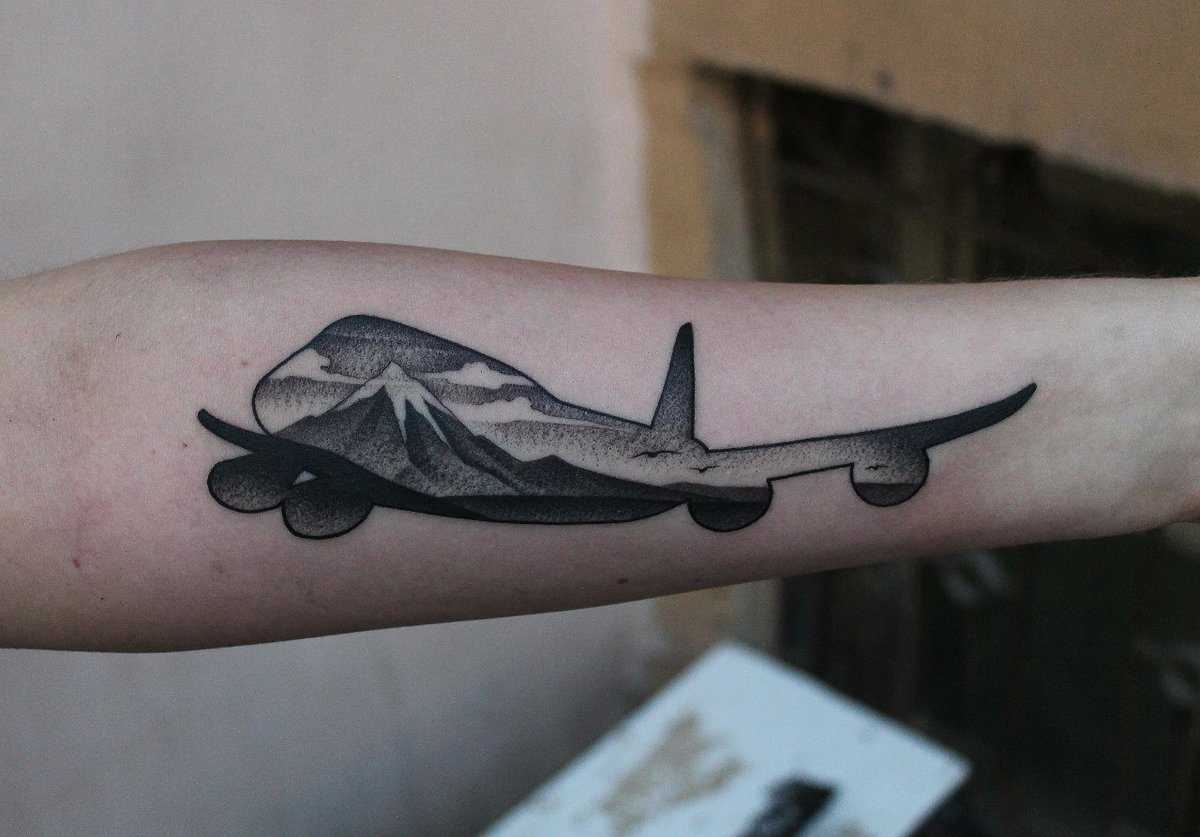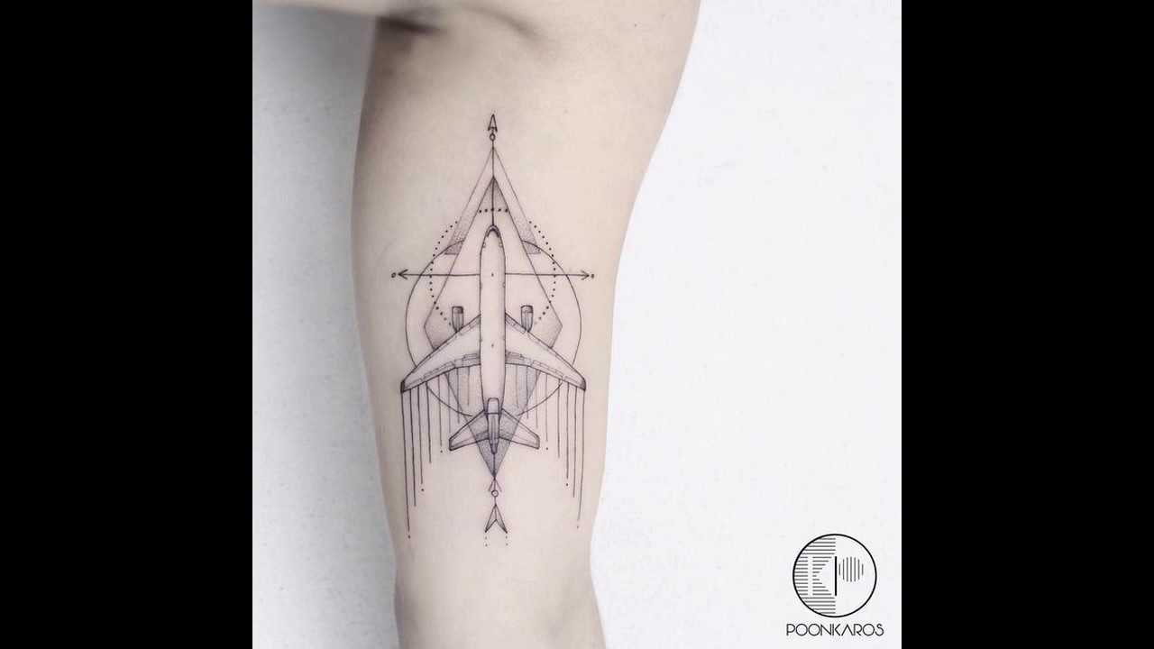 Чтобы татуировка с самолётом смотрелась максимально гармонично, следует заранее продумать детали рисунка и выяснить, что именно вы желаете продемонстрировать. Эскиз смотрится симпатично в любой технике и к наиболее распространённым примерам можно отнести акварельные рисунки, изображение в стилистике реализма, графику, геометрию, треш-польку, нью-скул и другие варианты. Мелкие детали татуировки удачно подчеркнут реалистичные рисунки. Крохотные татуировки или контуры самолётов принято выполнять графическими линиями, точками или аккуратными штрихами. Вариантов, как и возможностей, очень много, о чём свидетельствуют многочисленные фото готовых работ.