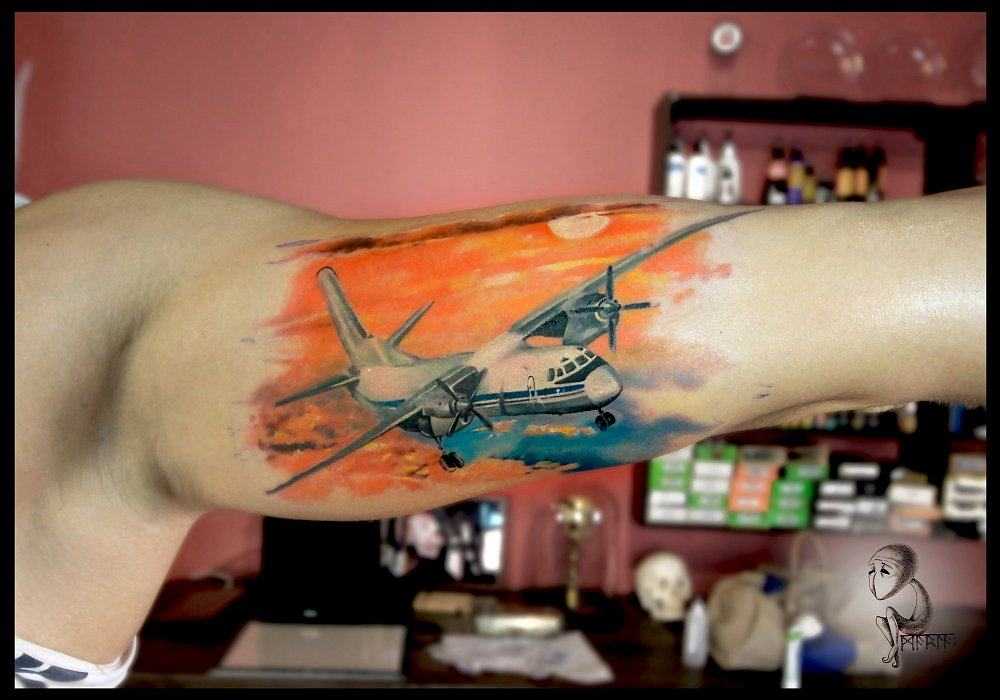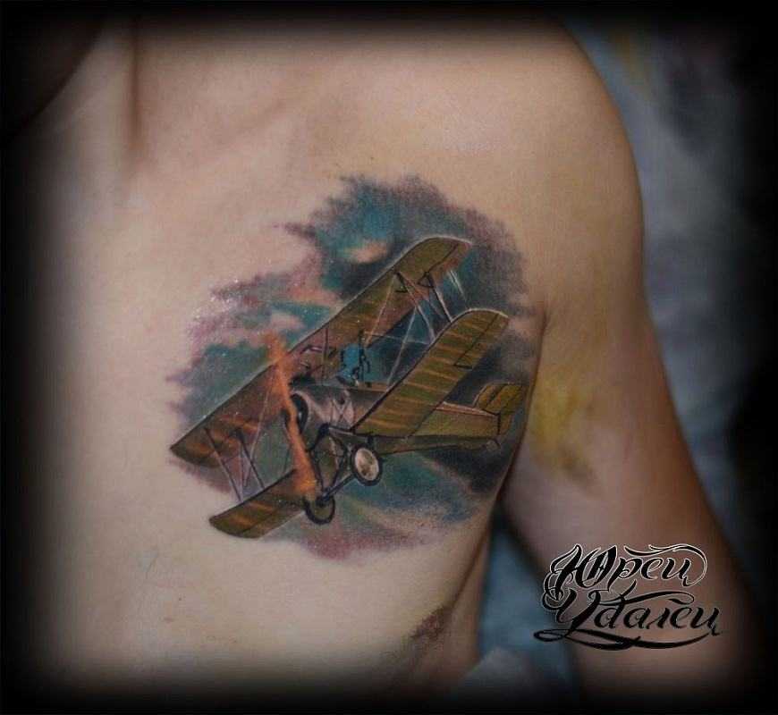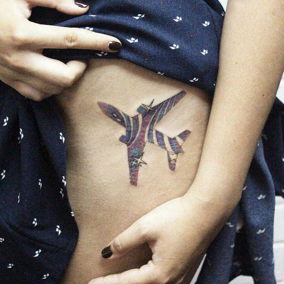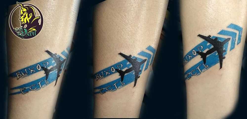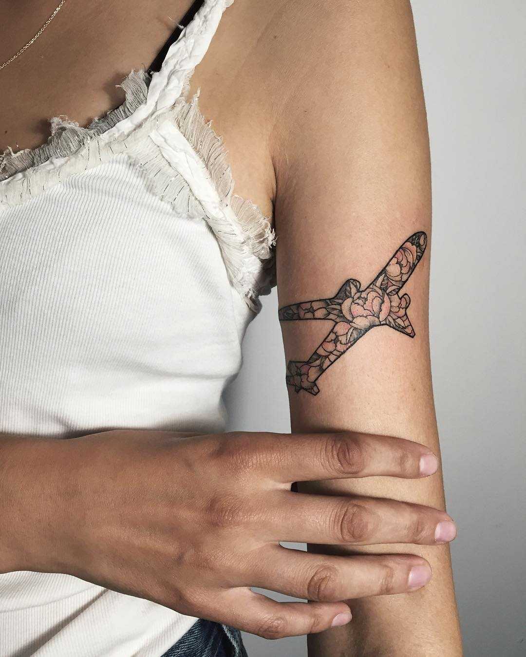 Изображение самолёта в нательной живописи относится к разряду интересных и достаточно органичных символов, которые по сравнению со многими другими идеями стали украшать тела любителей подобного вида искусства сравнительно недавно. Не смотря на простоту и определённую целенаправленность, эти эскизы многогранны в своём значении. Популярность подобных татуировок постепенно растёт, ведь как поётся в известной песне – первым делом, первым делом самолёты…
