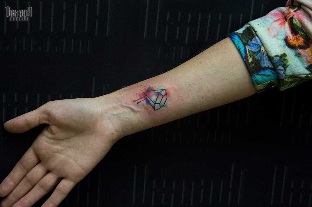 В каком стиле выполнить татуировку алмаз, в полной мере будет зависеть от выбора эскиза изображения алмаза. Современное искусство татуировки имеет множество стилей и техник исполнения. Профессионалы рекомендуют для нанесения татуировки алмаз использовать определенные стили. Например, тату алмаз в стиле реализм — самый подходящий вариант для девушек. Татуировка, выполненная в этом стиле, превосходно передаст красоту этого камня. Красиво будет выглядеть татуировка с изображением алмаз в стиле графики. Татуировка блэкворк выполняется в черном цвете, и такой рисунок будет смотреться оригинально и привлекательно. Стиль акварель позволит создать татуировку алмаз, словно нарисованную акварельными красками. Данная татуировка притягивает взгляд и с помощью такой техники можно создавать целые композиции. Красиво и оригинально будет смотреться татуировка алмаз, выполненная в стиле дотворк. Такая точечная техника позволяет творить неповторимые изображения алмаза на теле. Олдскул – традиционная и самая популярная техника исполнения татуировки алмаз. Трэш полька – смелый и яркий вариант техники для нанесения татуировки алмаз. В этом стиле красиво этот драгоценный камень выглядит в сочетании с дополнением в виде бокала или роз.