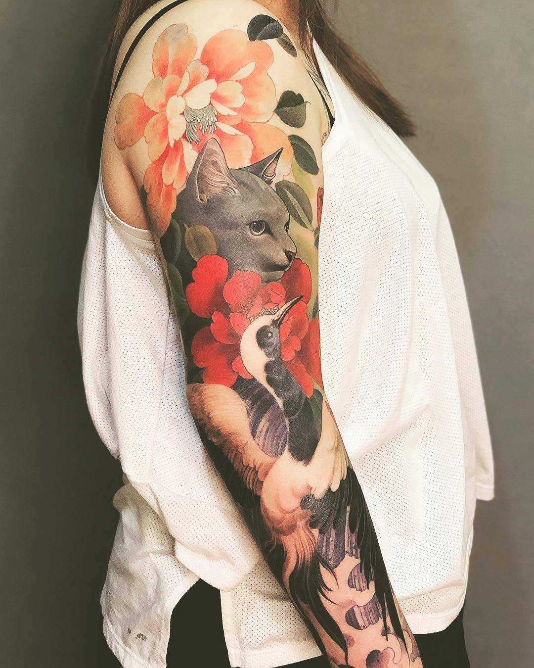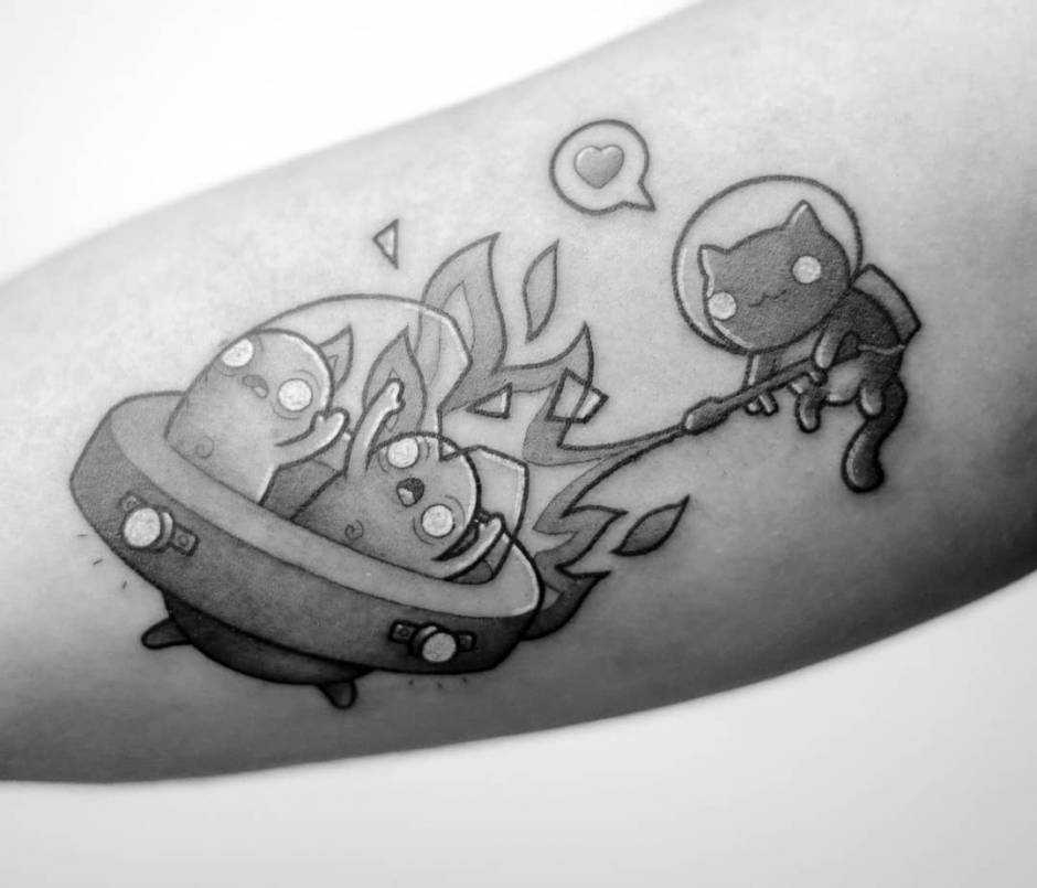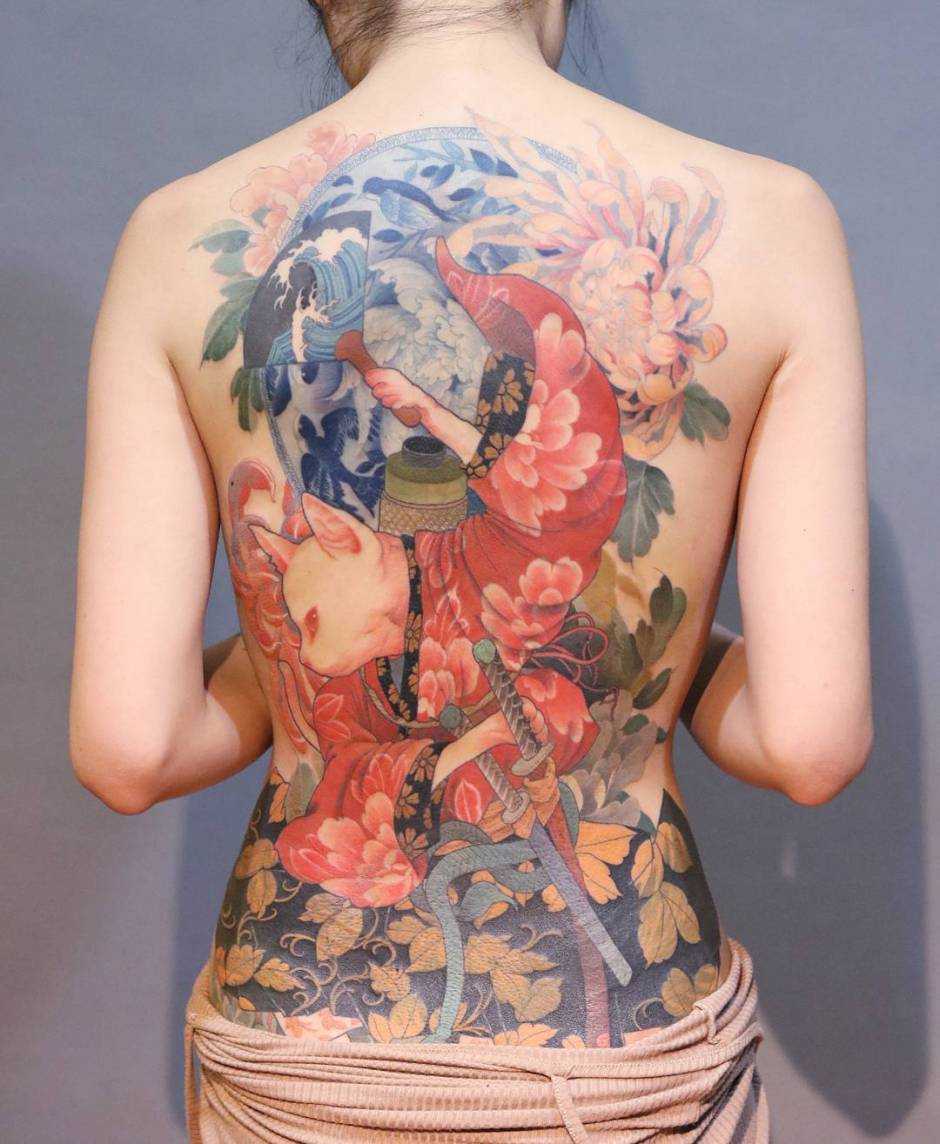 Изящно смотрится на женской коже татуировка с изображением лесного духа Тоторо, в силуэт которого вписан золотой листопад осени, разноцветье летнего луга или зелень весенней листвы. Рукав и тату на всю поверхность спины могут представлять собой масштабную картину, в сюжете которой сплетены воедино события, местности и персонажи разных фильмов или, наоборот, собраны все приключения из жизни одного героя.