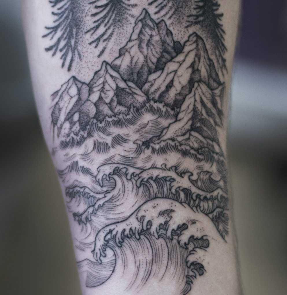 Нередко горы дополняют другими изображениями. Это могут быть животные или птицы, но к выбору всегда стоит подходить с особой тщательностью. Также уместными будут волны, месяц или же густые деревья. Все зависит от того, какой смысл вы планируете вложить в свою татуировку.