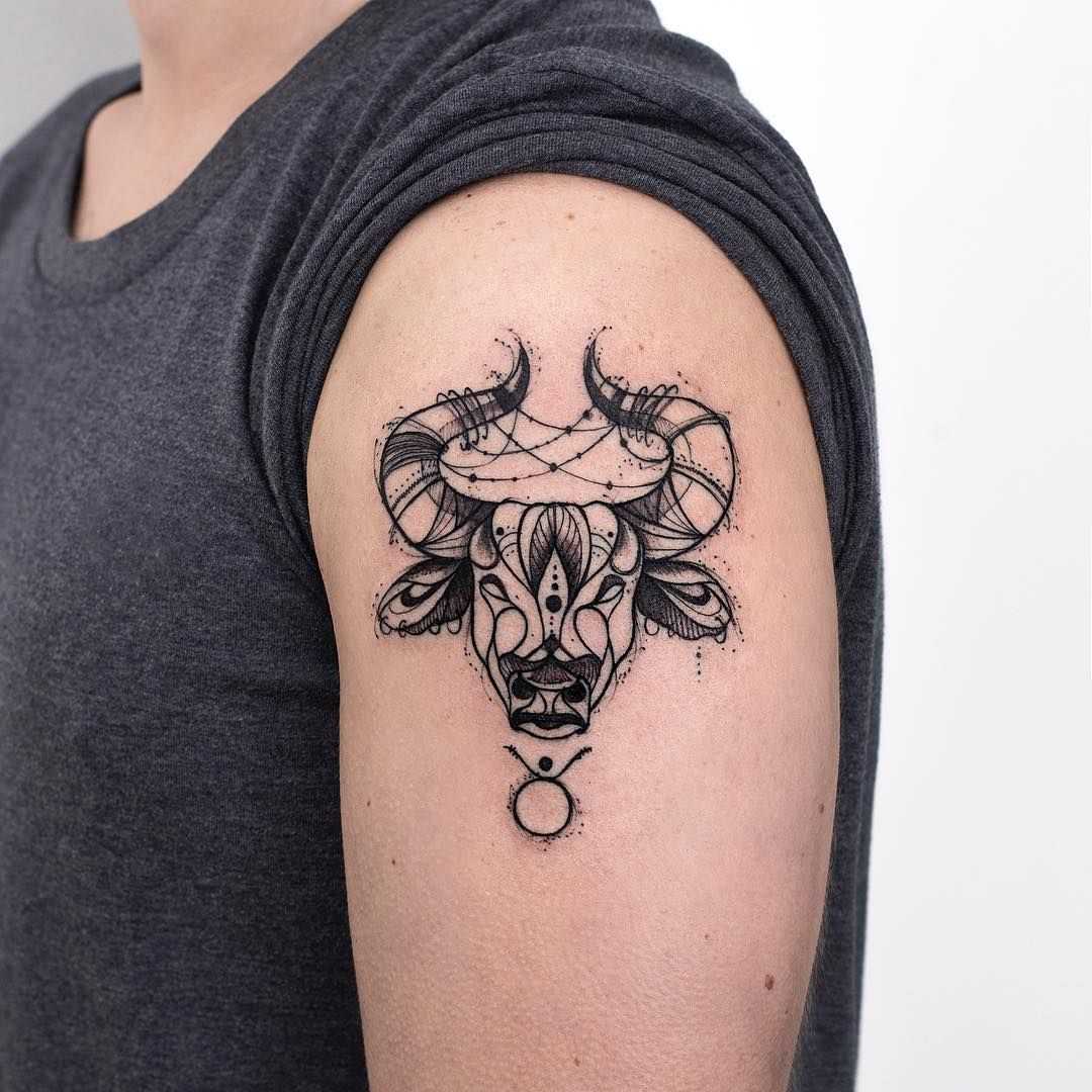 Телец – это второй знак зодиакального круга, представленный нам в образе быка, который олицетворяет целеустремлённость, решимость и стремление к победе, что вполне можно отнести к распространённым трактовкам нательного рисунка. Рождённые под этим созвездием особы отличаются упорством, весьма развитым интеллектом, ответственностью и дальновидностью. Они редко принимают поспешные решения, если конечно заинтересованы в последствиях. Тельцам присуща страсть, эмоциональность и чувственность, поэтому присутствующая в их жизни гармония и спокойствие с лёгкостью могут превратиться в безудержную бурю негативных эмоций, направленную против вас и даже жестокость, поэтому не стоит испытывать его терпение. Также могущественное животное считается покровителем уюта и материальных ценностей. Помимо этих вариантов, существуют и другие значения татуировки, которые зависят непосредственно от выбора рисунка.