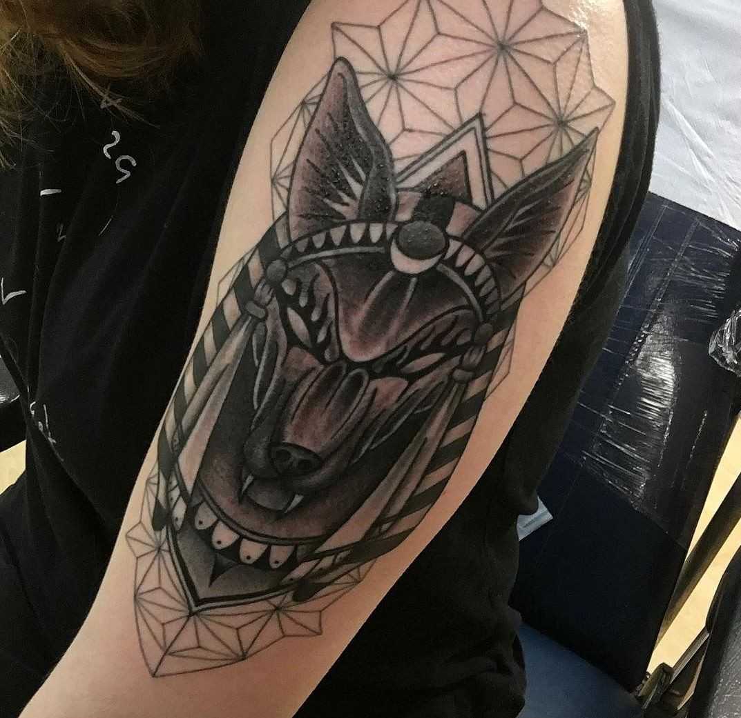 Тату Анубис на предплечье или плече – оптимальный вариант для сдержанного рисунка без лишних деталей и дополнений.