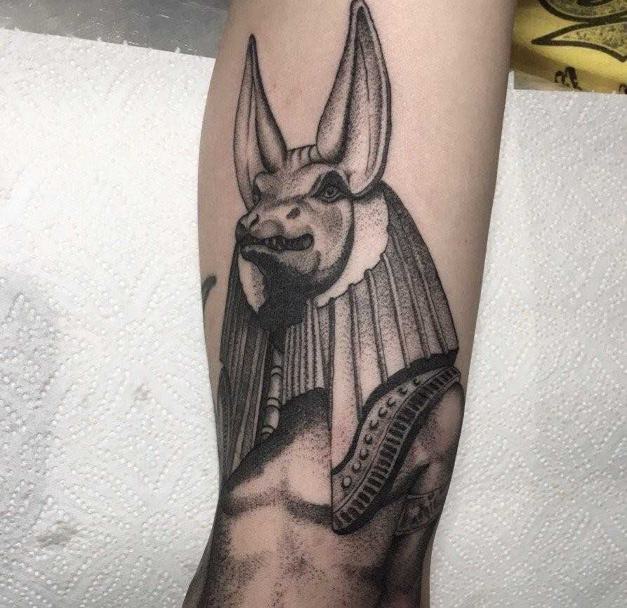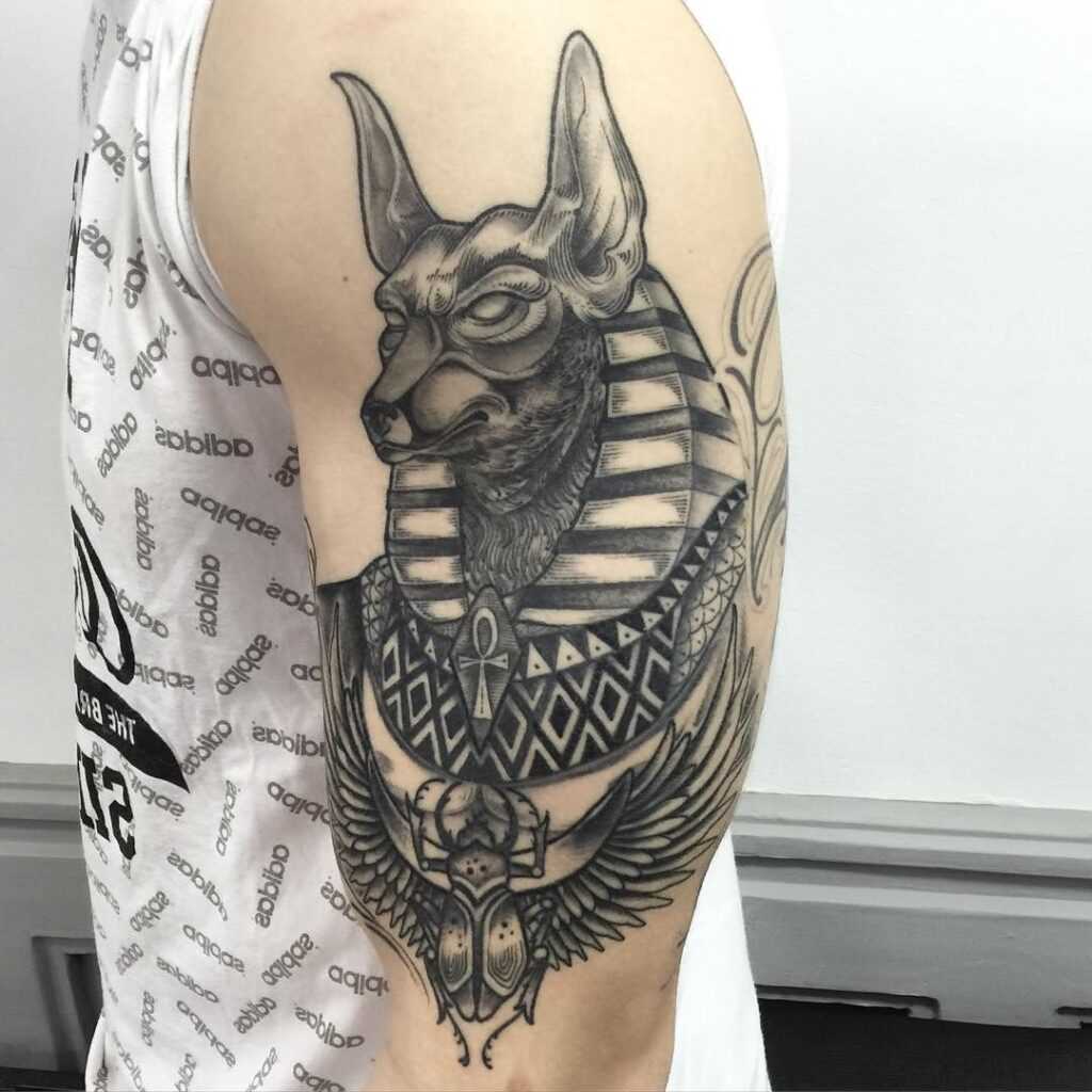 Анубис — в египетской мифологии один из таинственных богов. Обыватели утверждают, что он главный властитель мира загробного и покровитель мертвых. В итоге формируется негативное представление про этот персонаж, ощущение, мол, тату с его изображением только несчастья и проблемы принесет. Но не совсем так это. Анубис – бог, кто в потусторонний мир попасть помогает умершим. В толковании современности, Анубис покровительствует психиатрам, анестезиологам и психологам. Его называют богом, что «открывает пути».