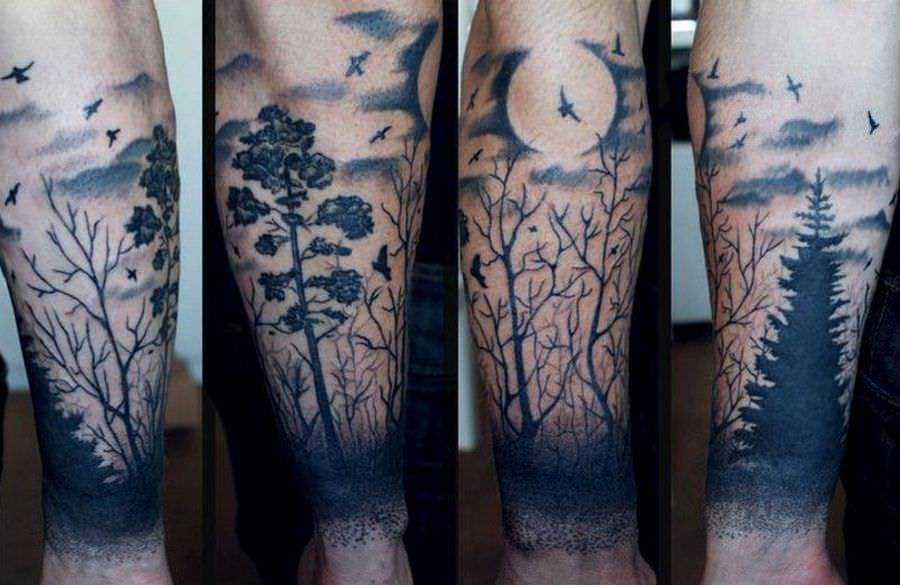 Дополняя пейзаж различными элементами, обладатель тату леса на руке создаёт оригинальные эскизы, наделённые специфической символикой. Очень эффектно смотрится картинка в стиле блэкворк, где используется много чёрного цвета.