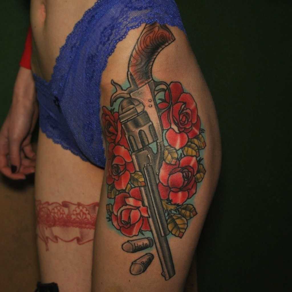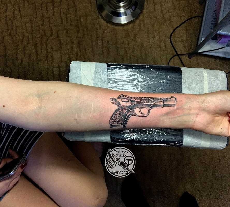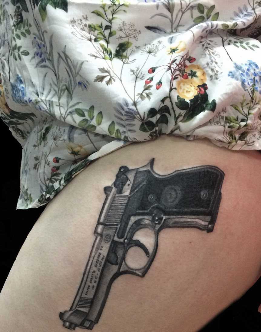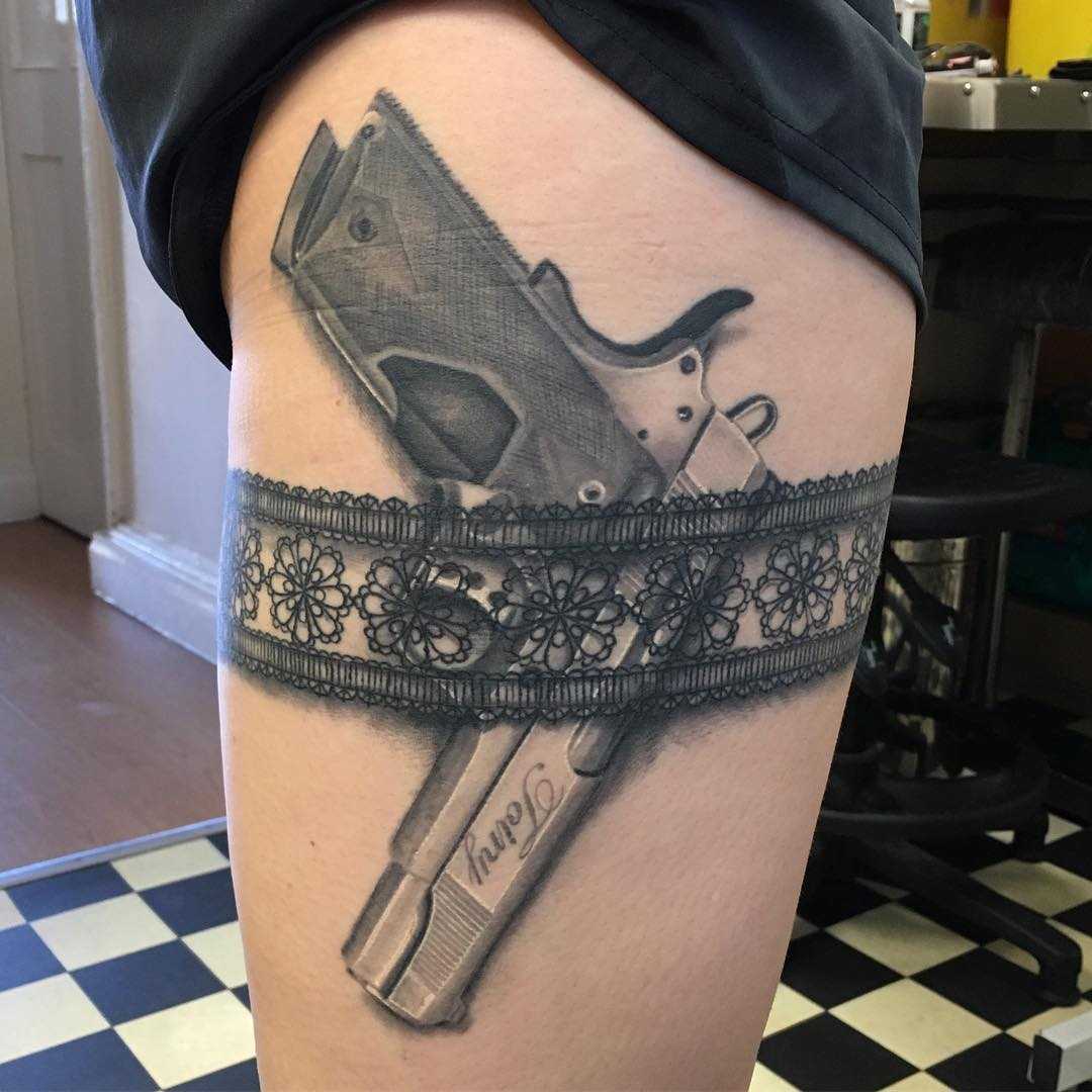 Татуировок с изображением пистолета очень много, и каждая из них может дополняться по желанию оригинальными деталями. Леди, решившиеся на подобный эксперимент со своей внешностью, зачастую останавливают выбор на изображении оружия с чулком. В подобном примере эскиза основная часть рисунка – пистолет, интересно украшается подвязкой или её элементами. Смотрится подобная картинка эффектно, дерзко и сексуально. Оригинально выглядят рисунки с двумя пистолетами расположенные рядом или пара со скрещенными стволами. Впечатляют эскизы с цветами и надписями, картами и денежными купюрами в качестве деталей, а также эскизы, демонстрирующие пистолет во время выстрела и многие другие, не менее впечатляющие примеры.