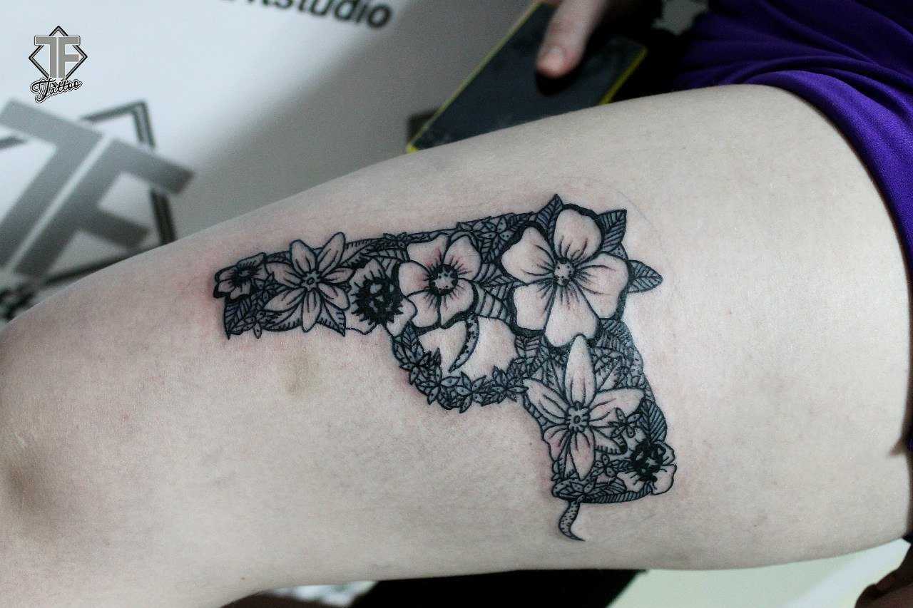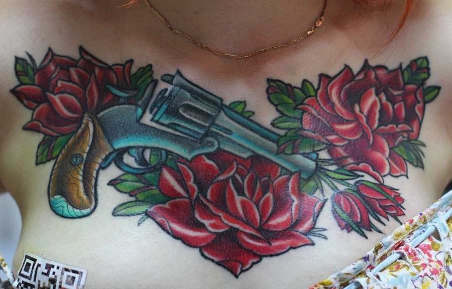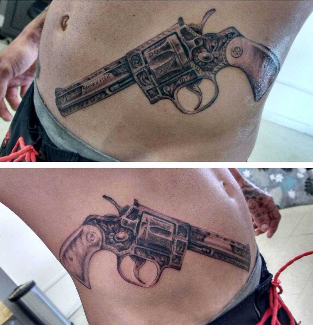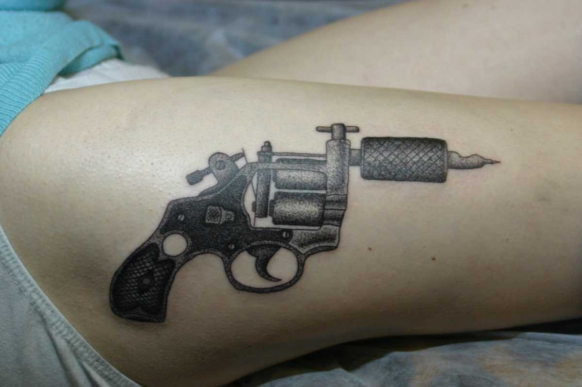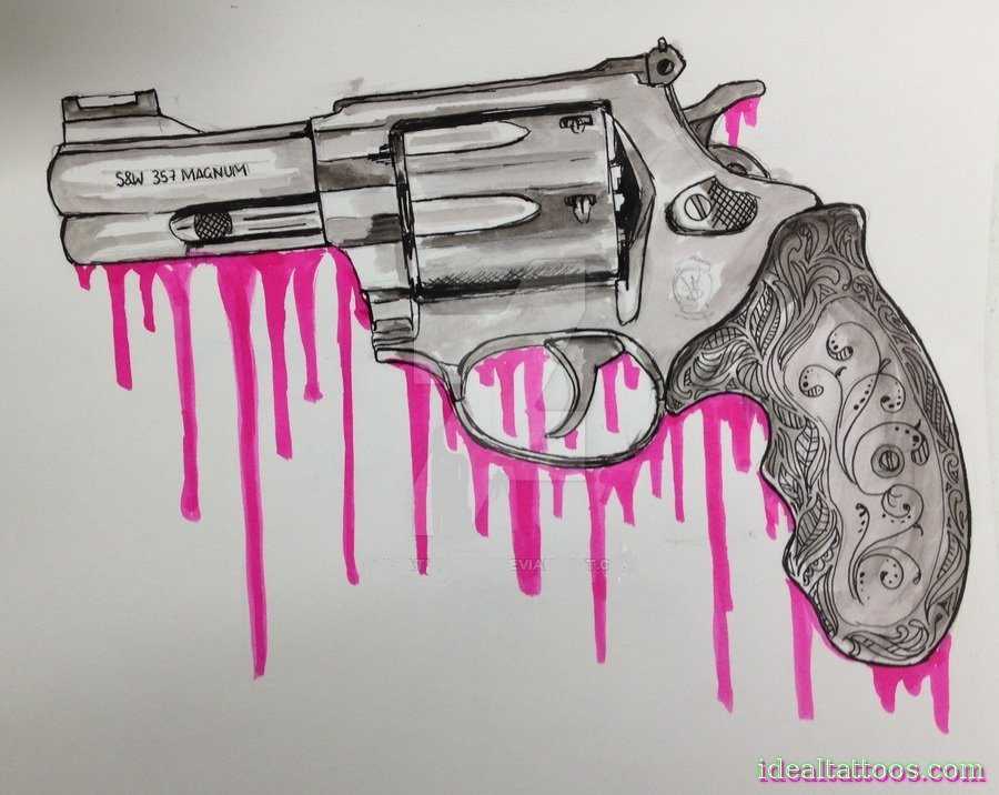 Татуировок с изображением пистолета очень много, и каждая из них может дополняться по желанию оригинальными деталями. Леди, решившиеся на подобный эксперимент со своей внешностью, зачастую останавливают выбор на изображении оружия с чулком. В подобном примере эскиза основная часть рисунка – пистолет, интересно украшается подвязкой или её элементами. Смотрится подобная картинка эффектно, дерзко и сексуально. Оригинально выглядят рисунки с двумя пистолетами расположенные рядом или пара со скрещенными стволами. Впечатляют эскизы с цветами и надписями, картами и денежными купюрами в качестве деталей, а также эскизы, демонстрирующие пистолет во время выстрела и многие другие, не менее впечатляющие примеры.