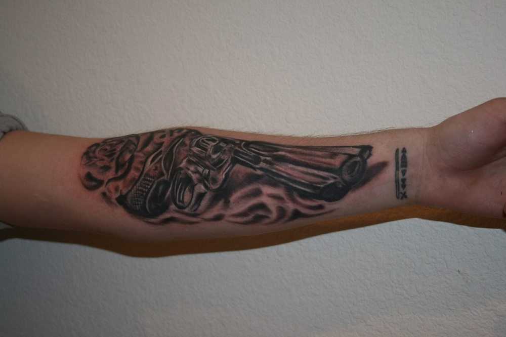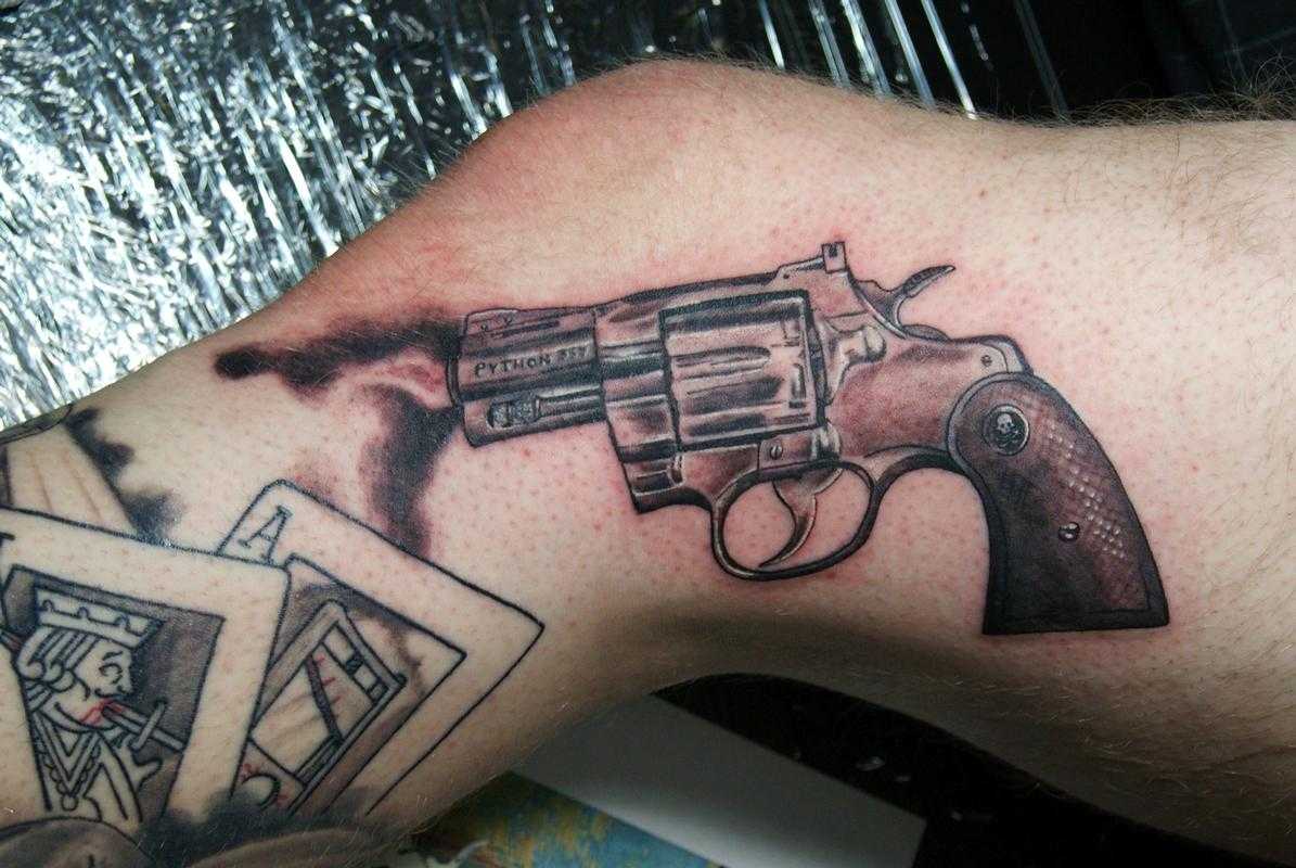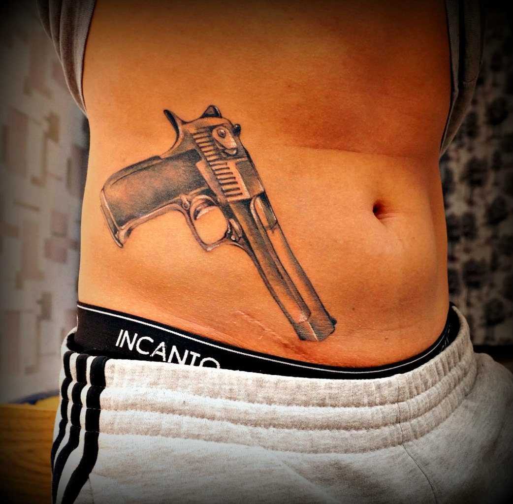 Вариации пистолета набивают на своё тело в память о боевых действиях солдаты или люди, чья профессия непосредственно связана с ношением оружия. А ещё, подобные нательные украшения могут подчёркивать более личные качества, например, верность или преданность.