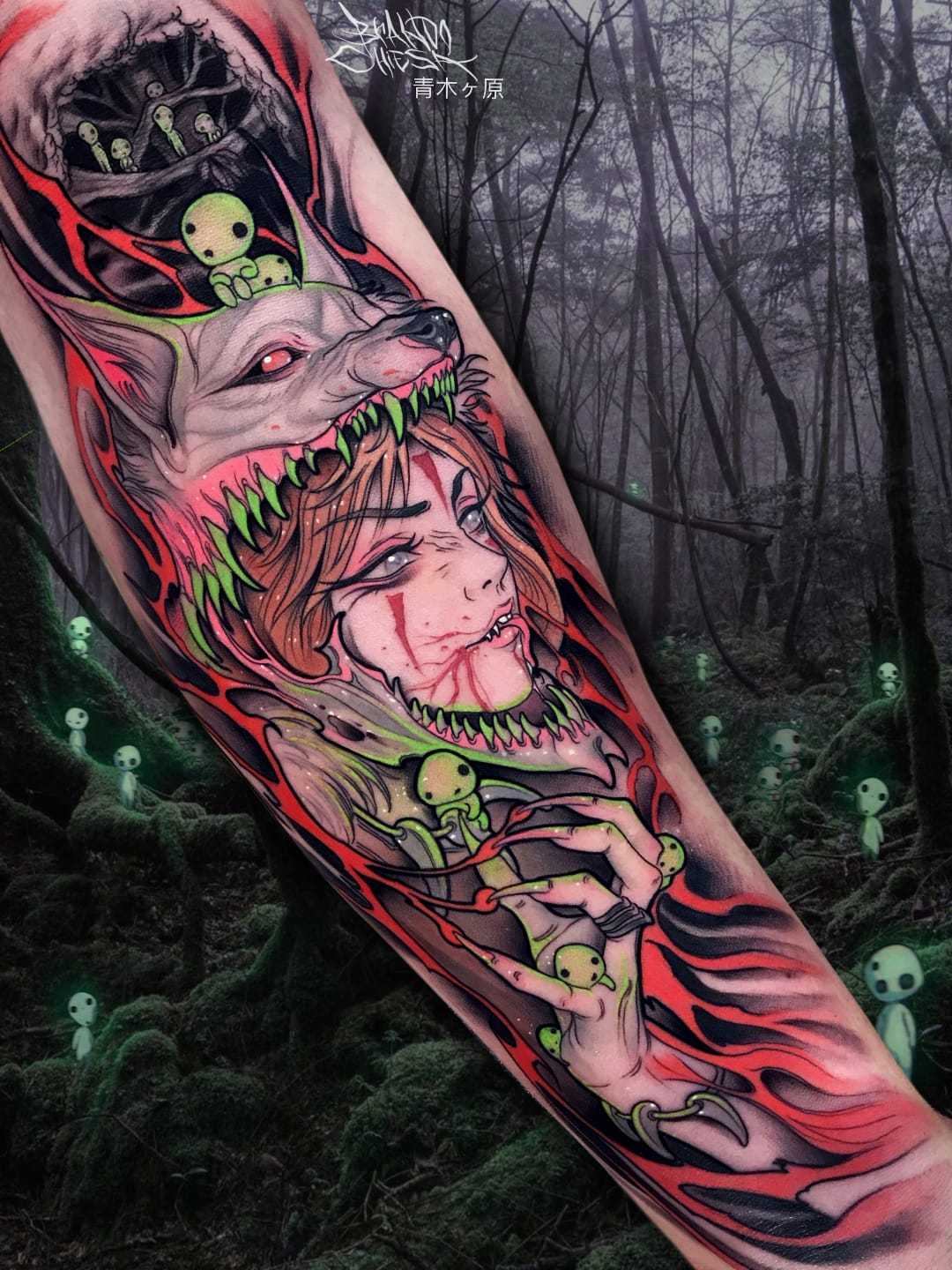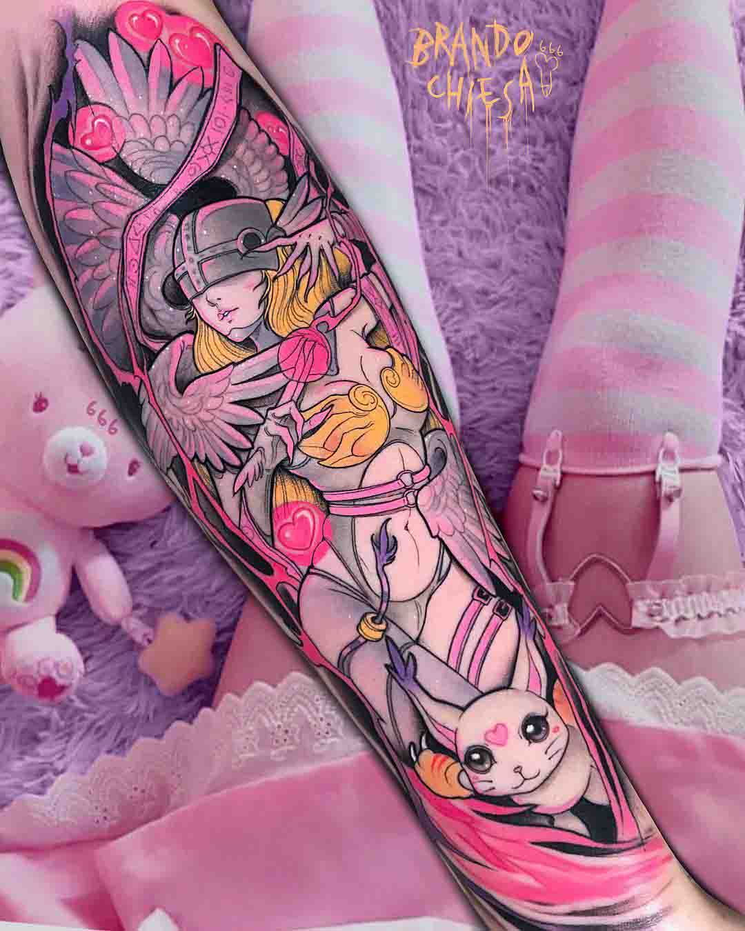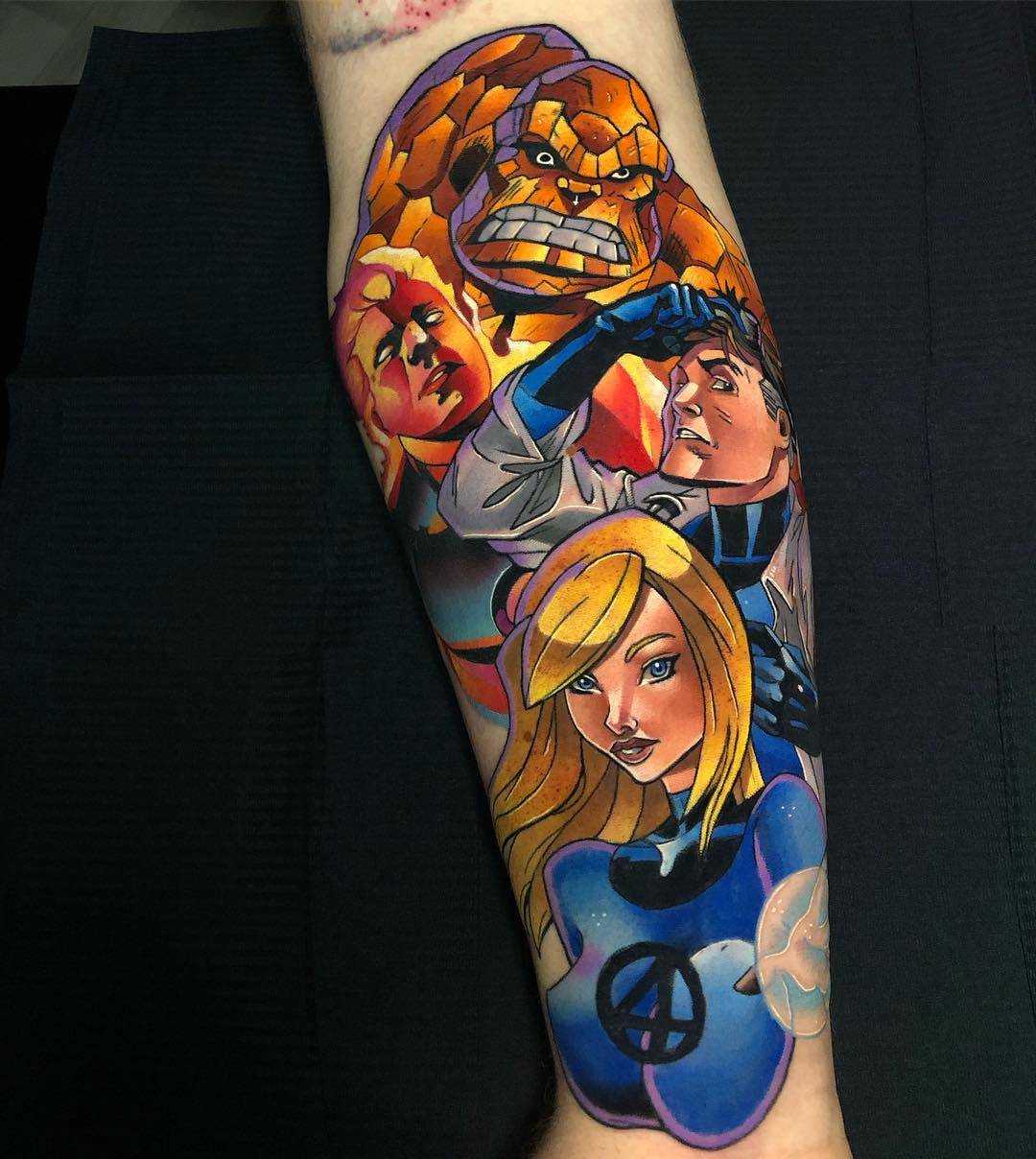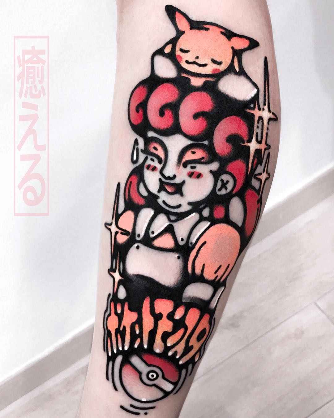 Ньюскул – это еще один потрясающий стиль для татуировок. Он отличается яркой палитрой и невероятными сочетаниями оттенков. Картинка оформлена широкими контурами. В результате получается оригинальный рисунок, передающий массу эмоций.
